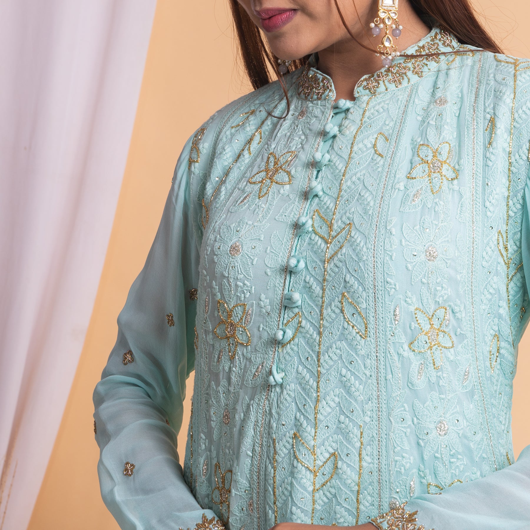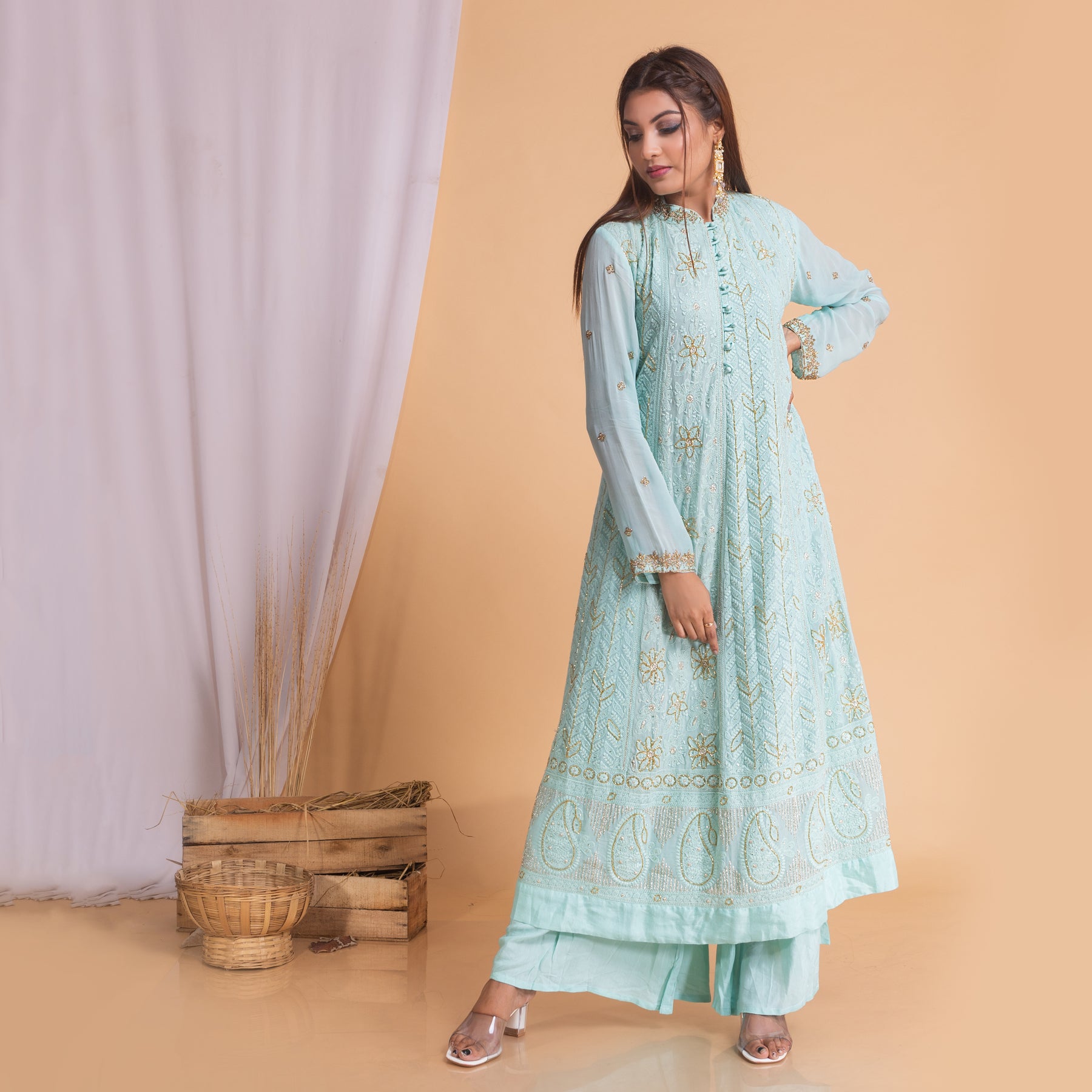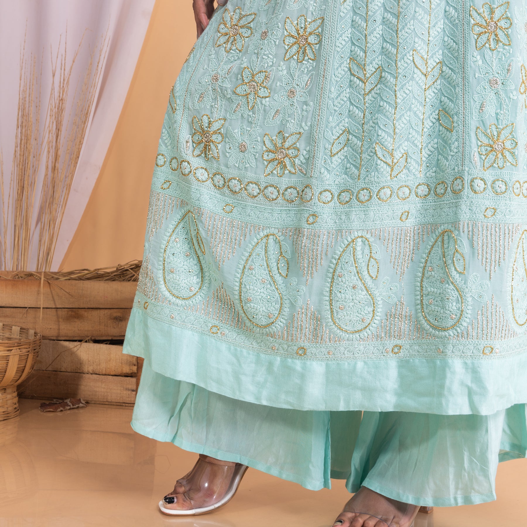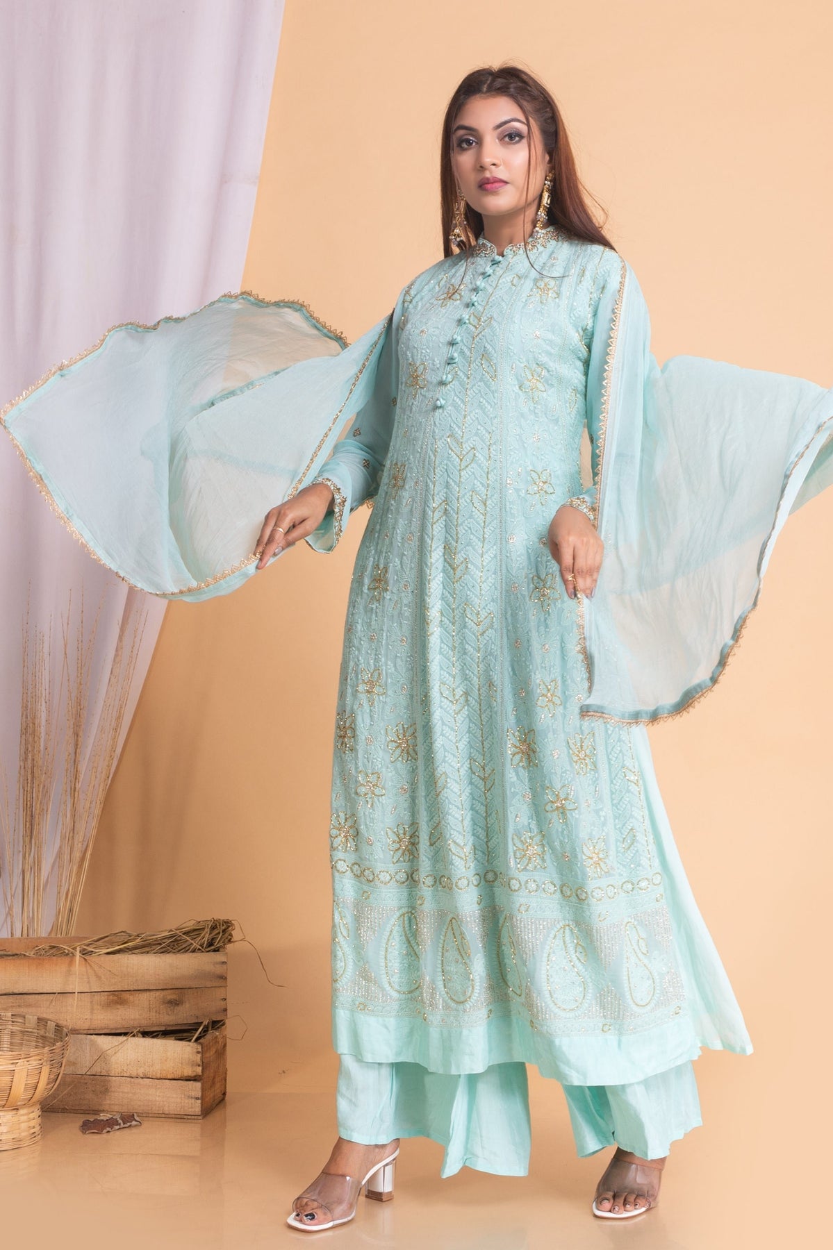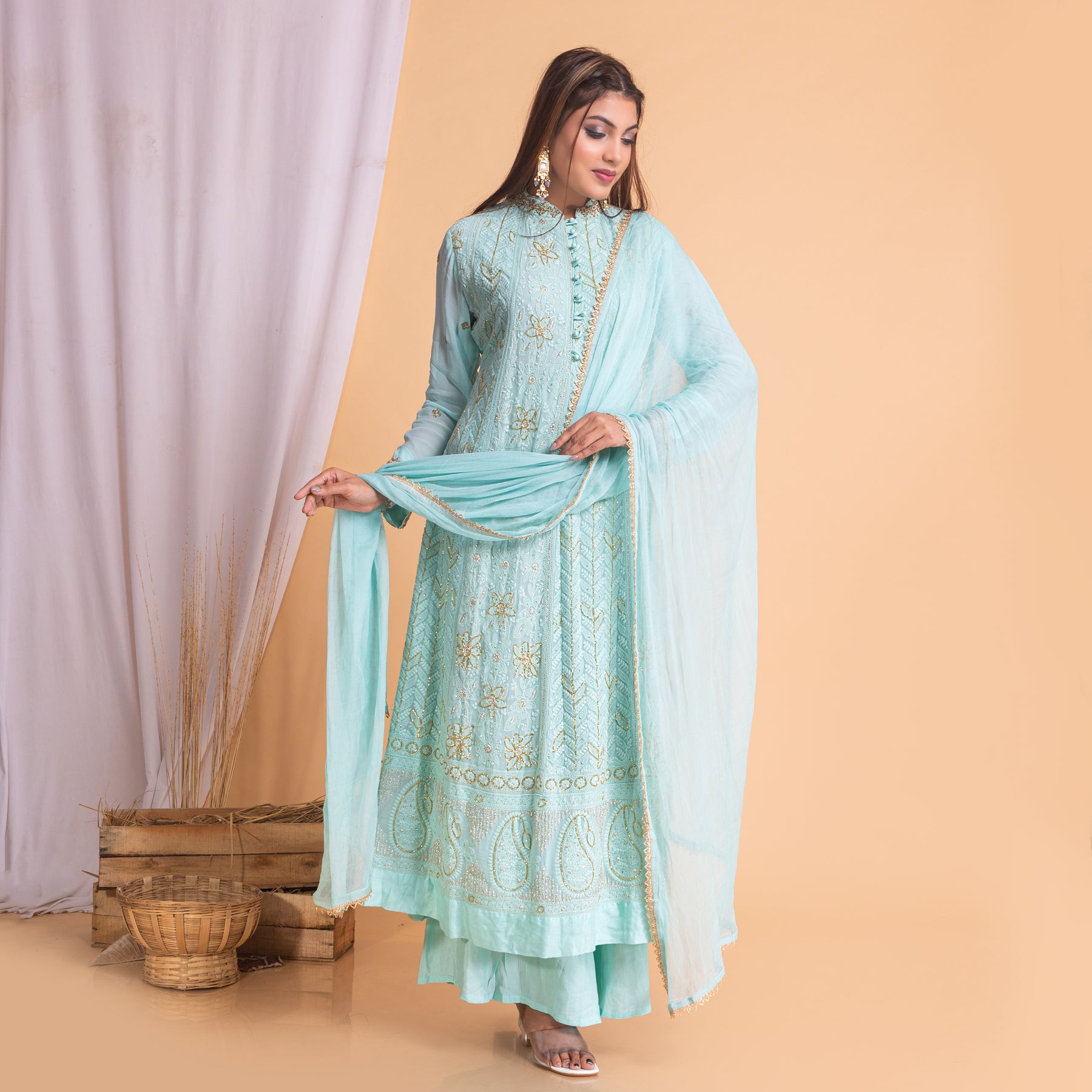 Admire the beauty of chikan fabric wearing our long A line kurta which comes with plazo and dupatta with handwork of cutdana on chikan.