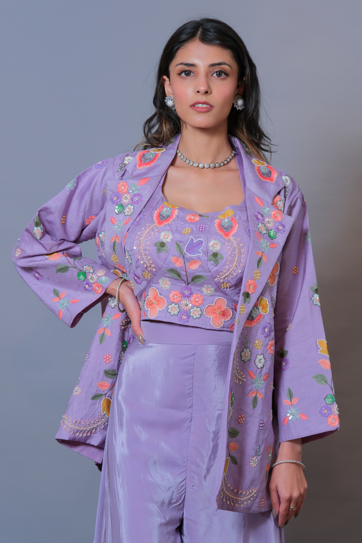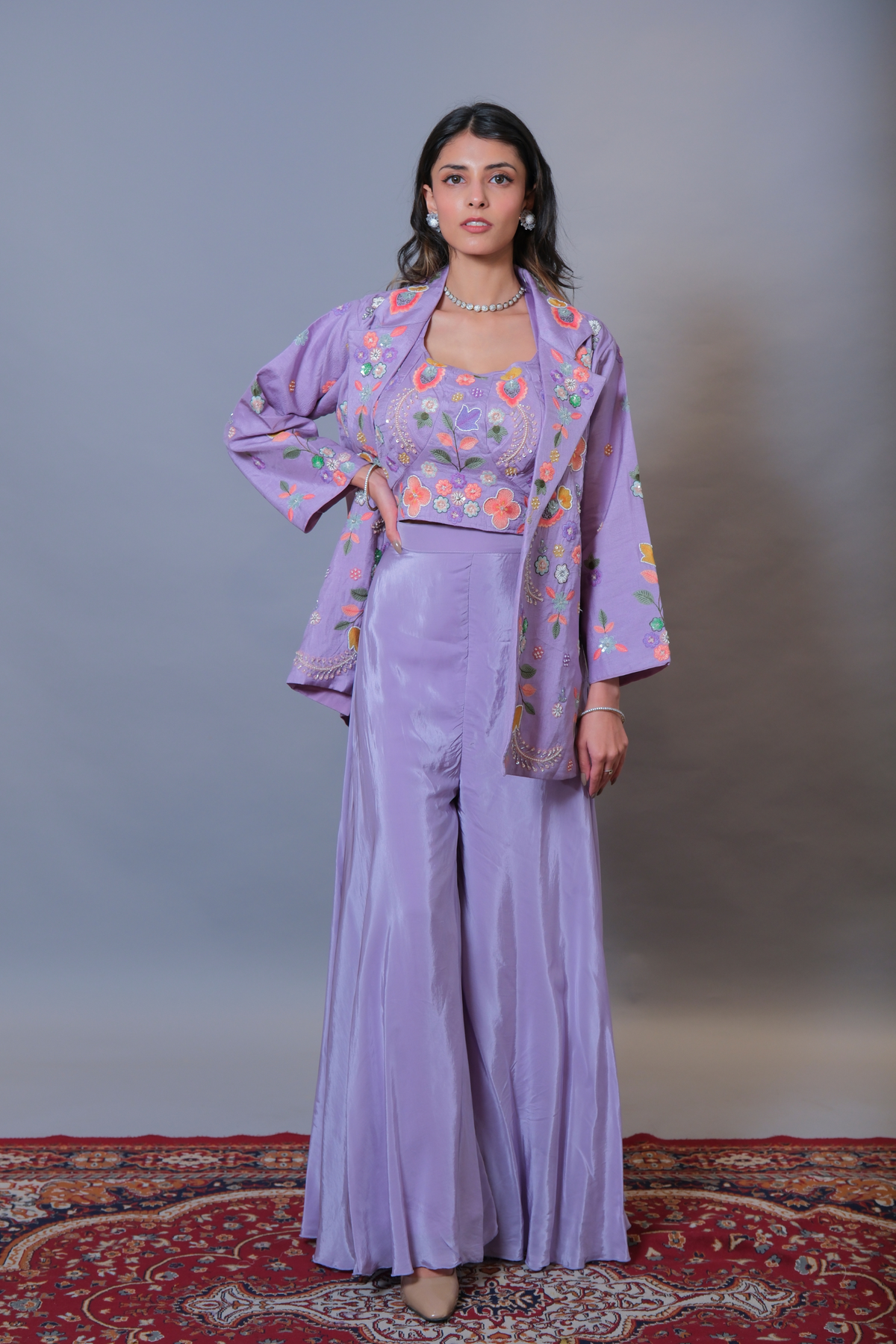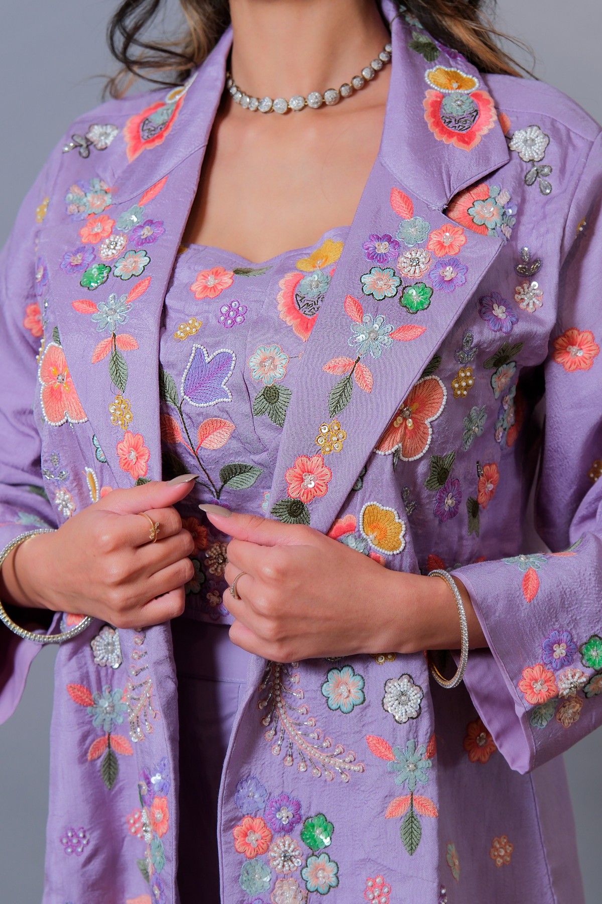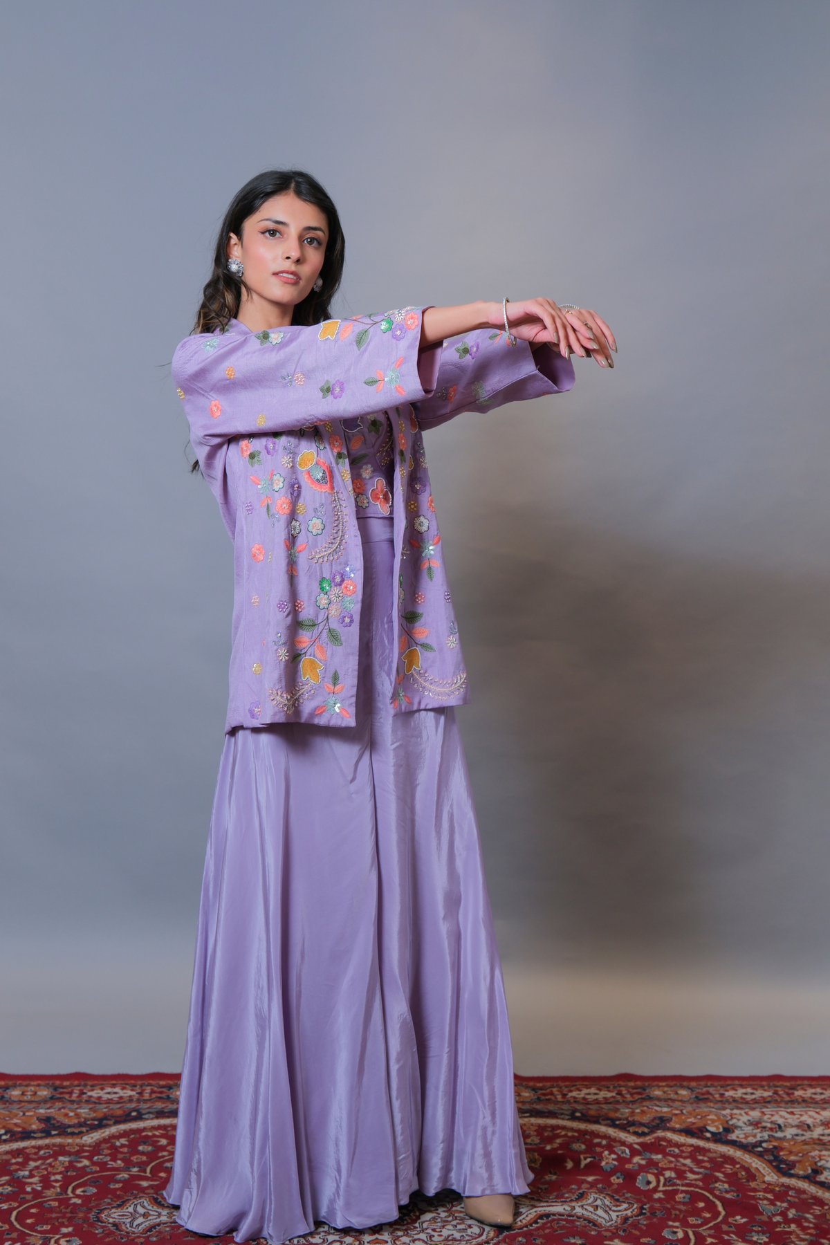 Paint the town lavender with this pastel hue of lavender co-ord set with jacket and handwork of Resham, Sequin, Beads. Dive into theh dreamy hues and make every moment a runway.