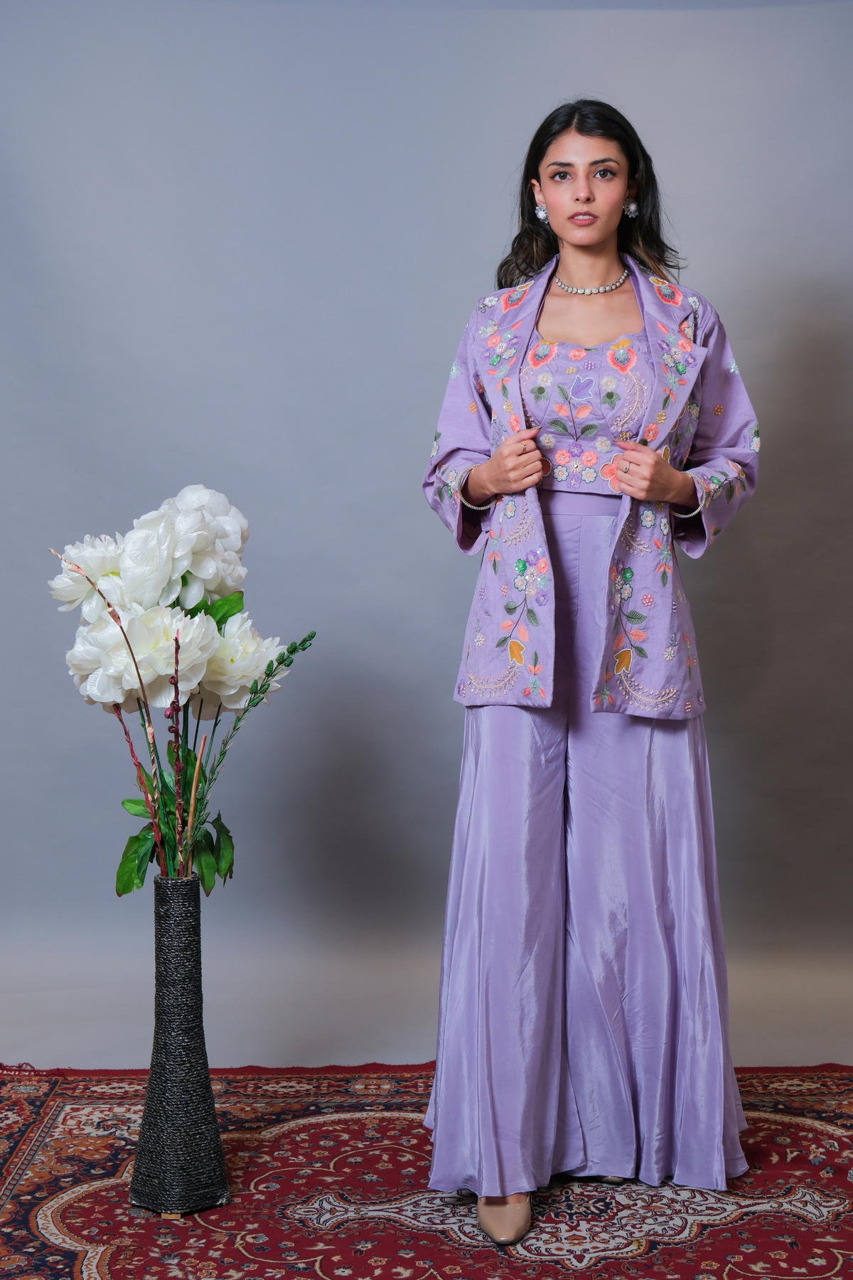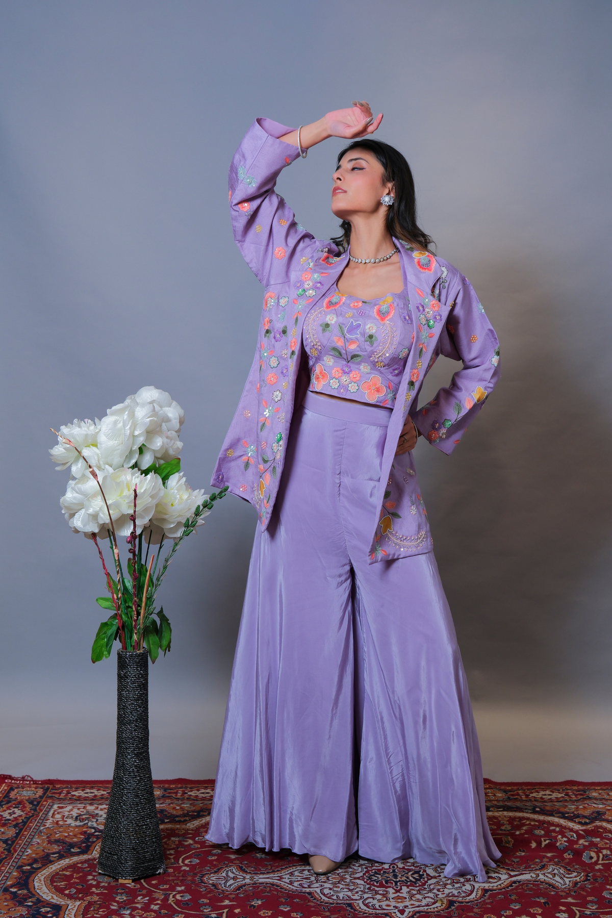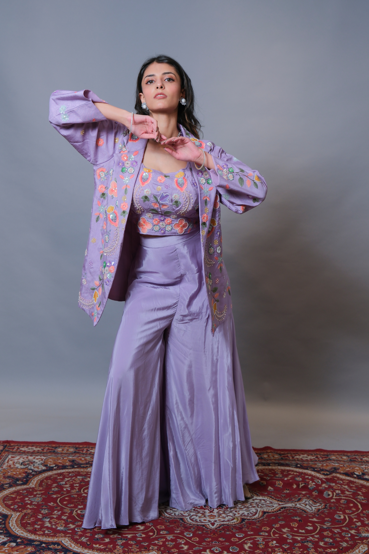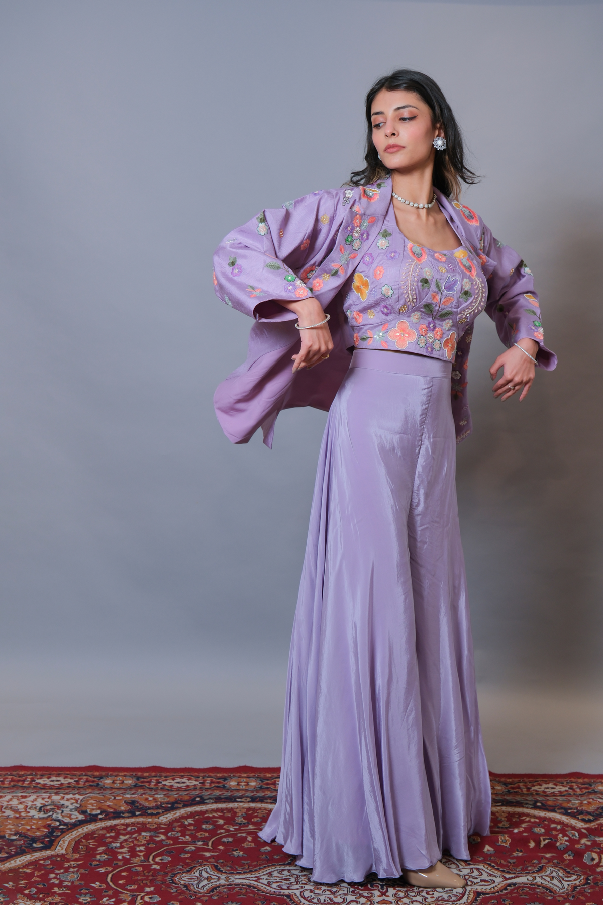 Paint the town lavender with this pastel hue of lavender co-ord set with jacket and handwork of Resham, Sequin, Beads. Dive into theh dreamy hues and make every moment a runway.
