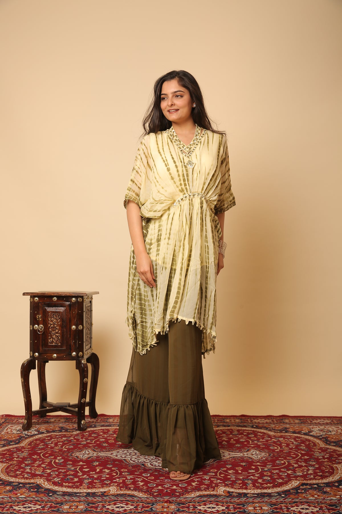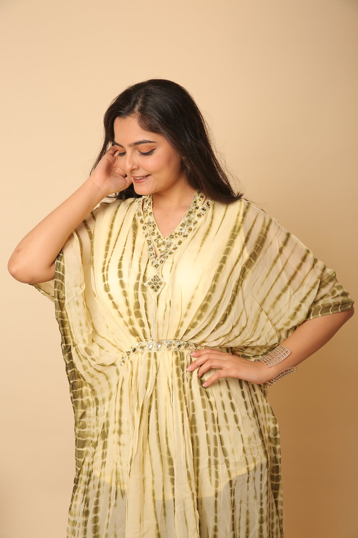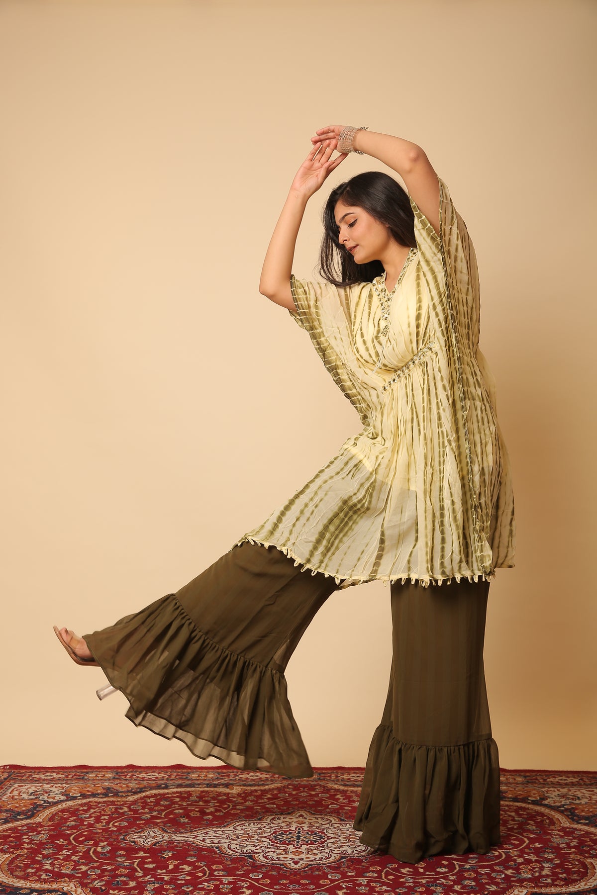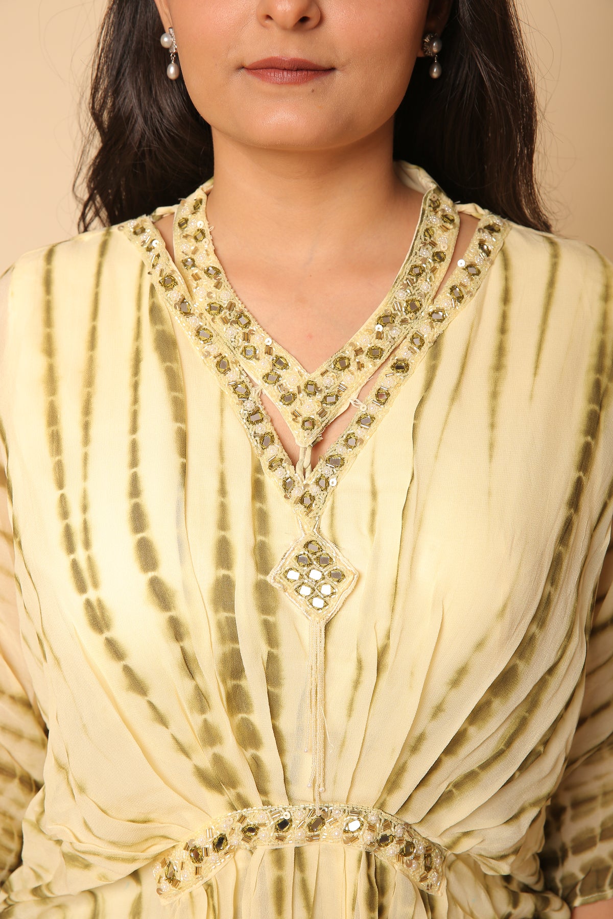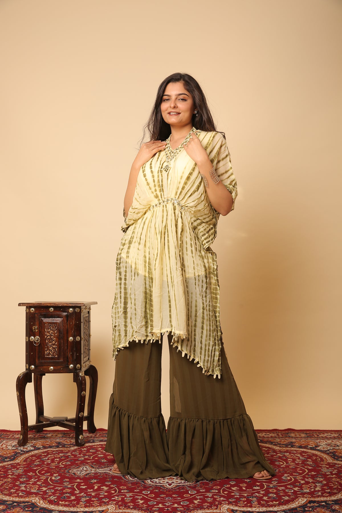 Get high on style and elegance by laying your hands on this exclusive Shibori-dyed kaftan made on pure georgette fabric with mirror and thread work. Comes with plazo to give it a perfect look.
