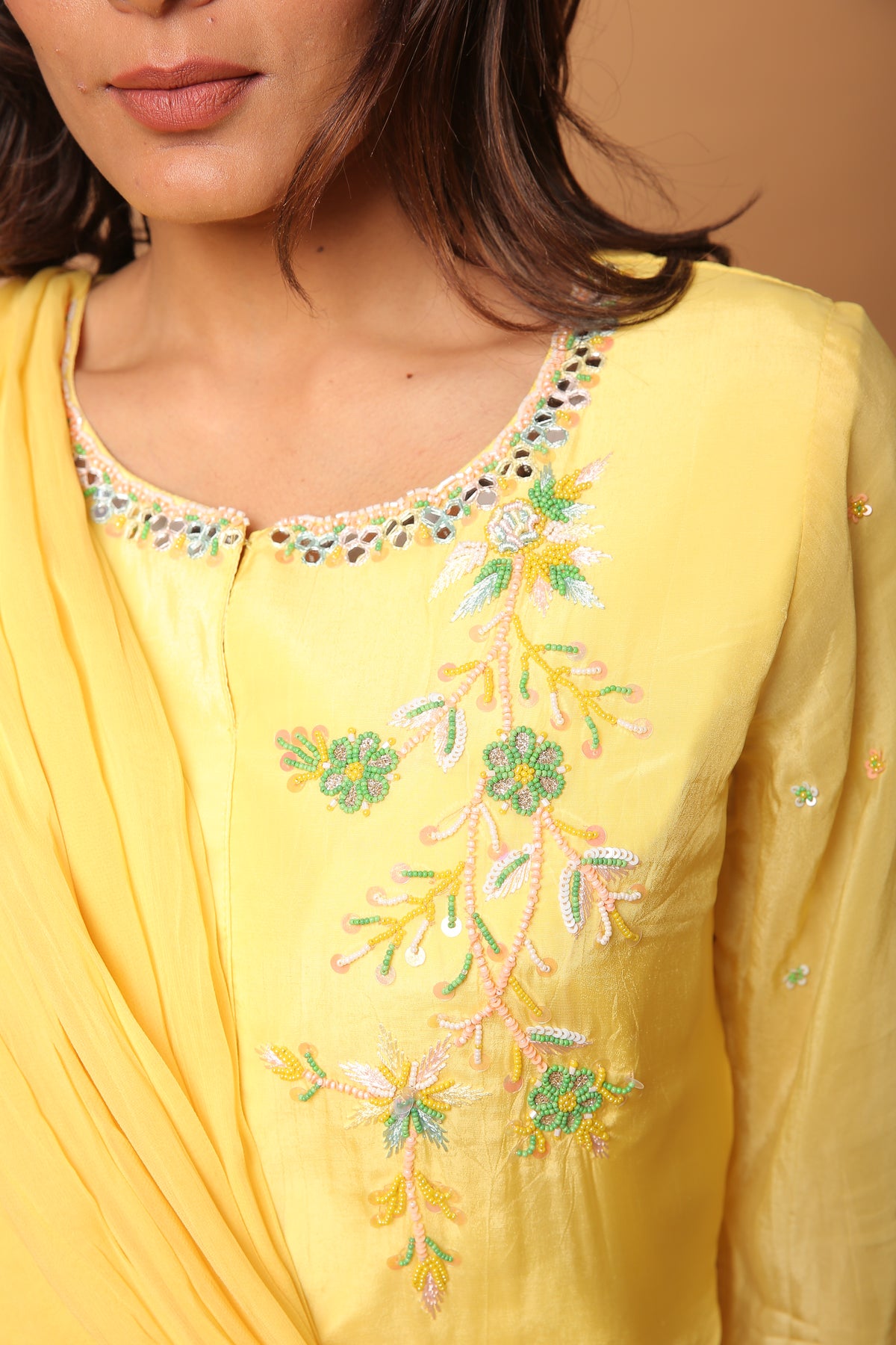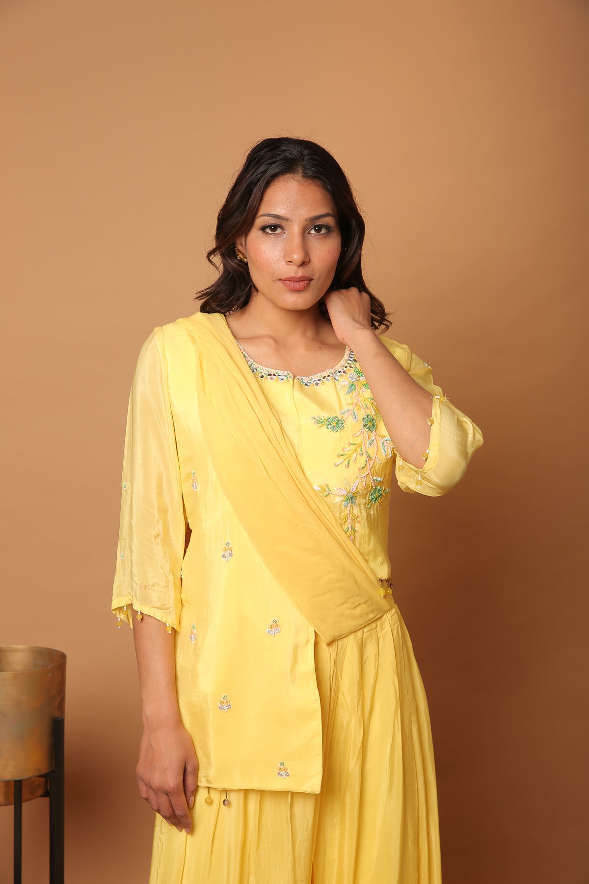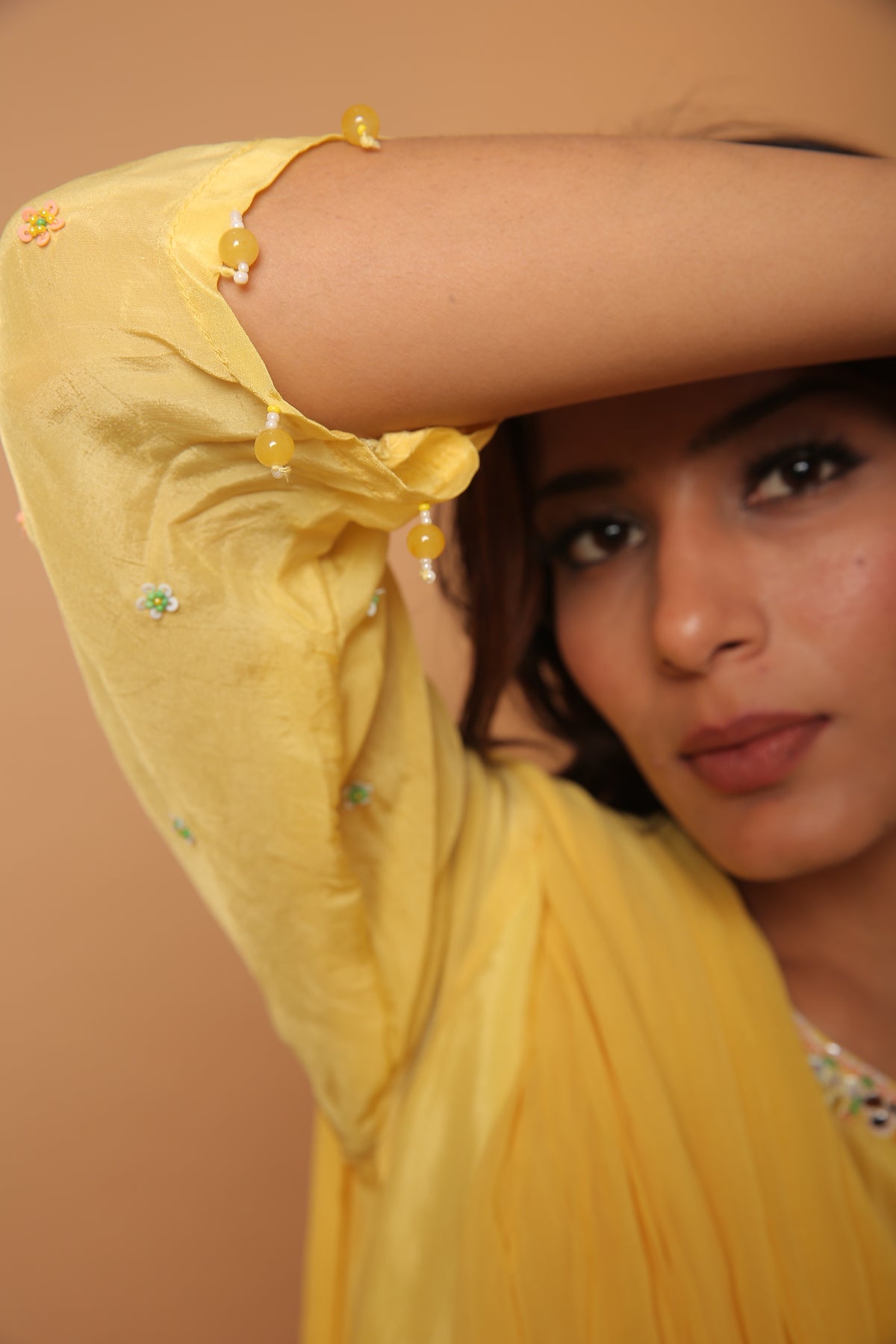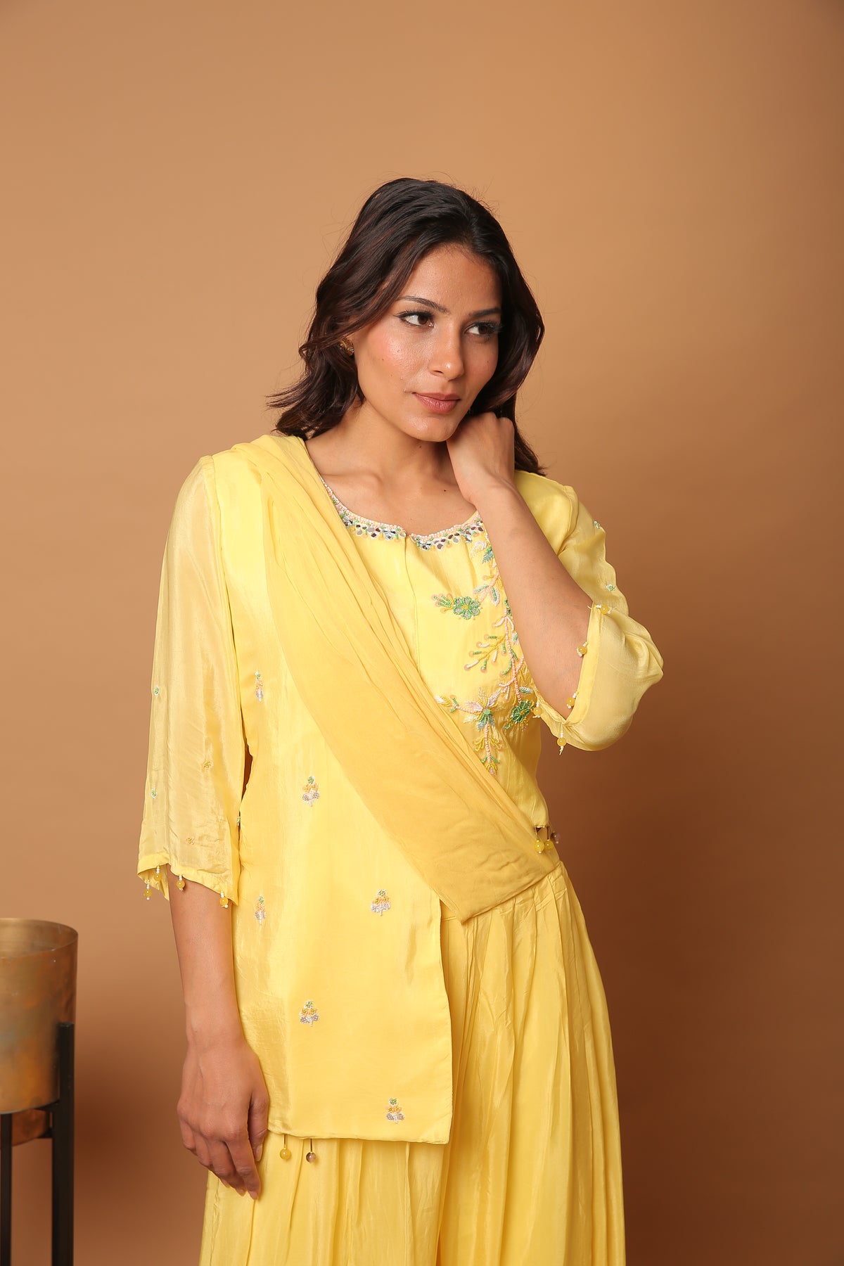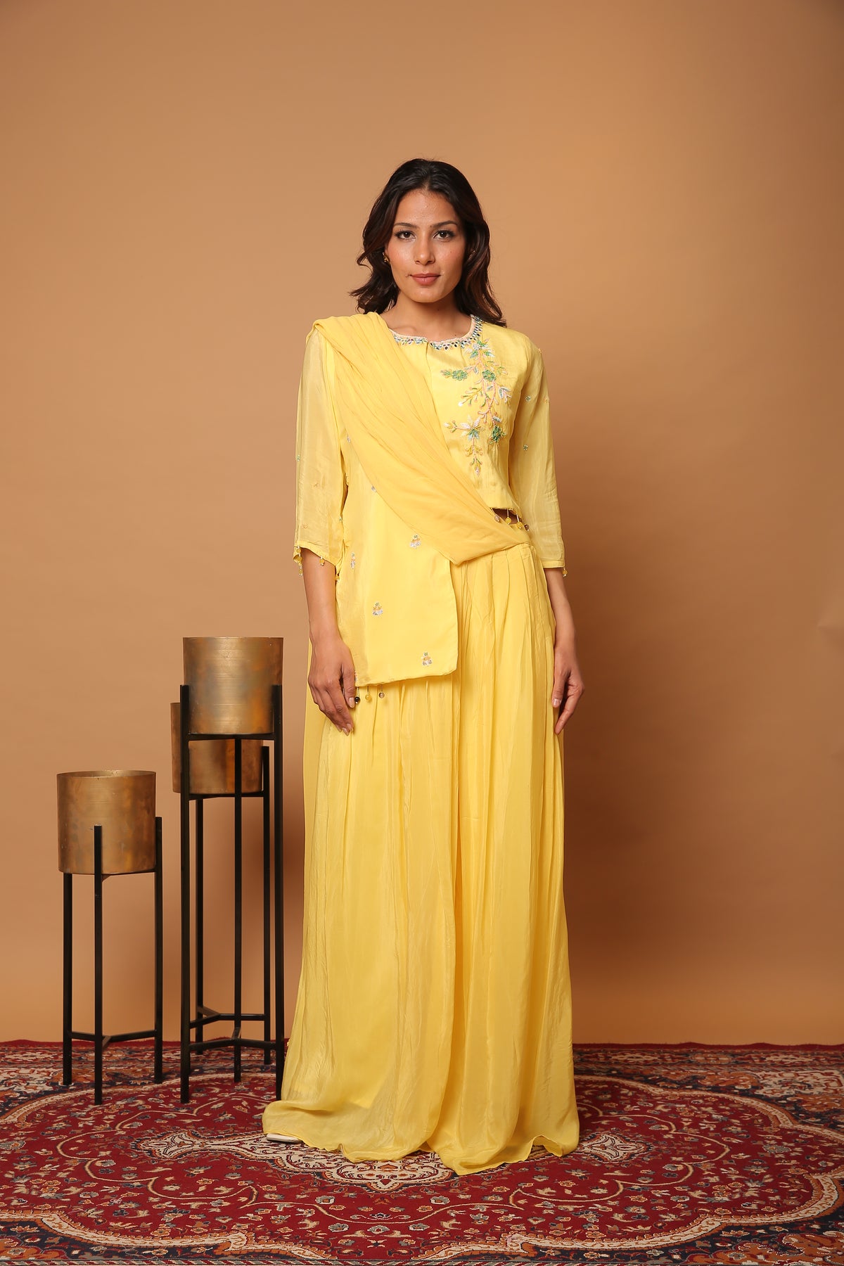 Step out gracefully with this stunning High Low top and Plazo outfit. Crafted from lavish georgette fabric the plazo features a classic drape that dances with each stride. The blend of Vibrant Sequins, Beads and Mirrors along with the thread work are artistically woven to beautifully narrate your story.