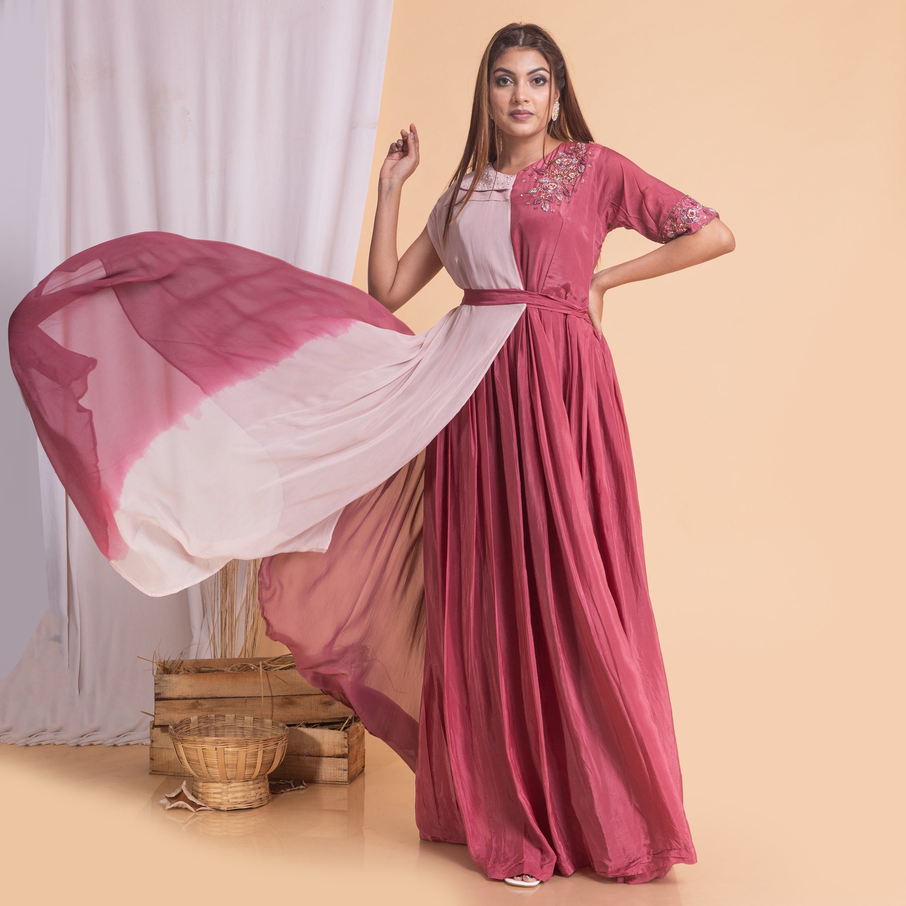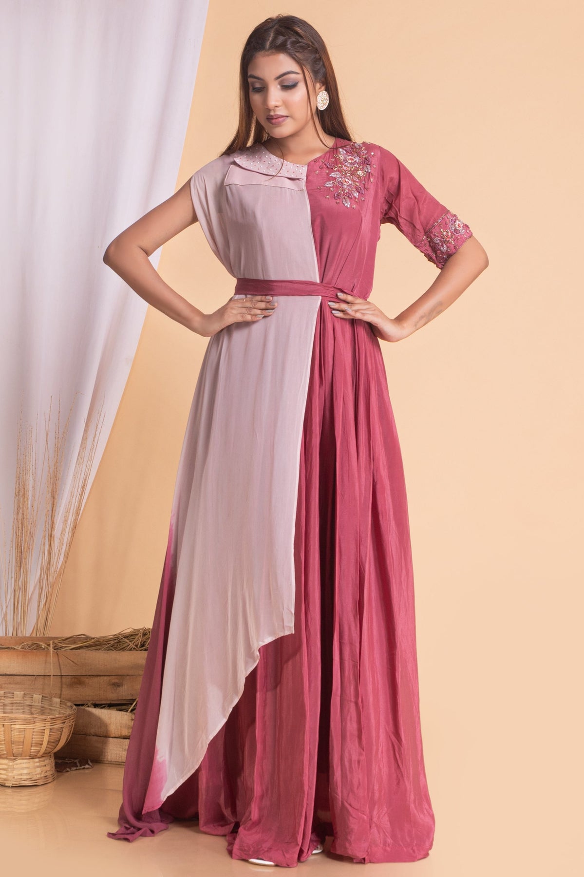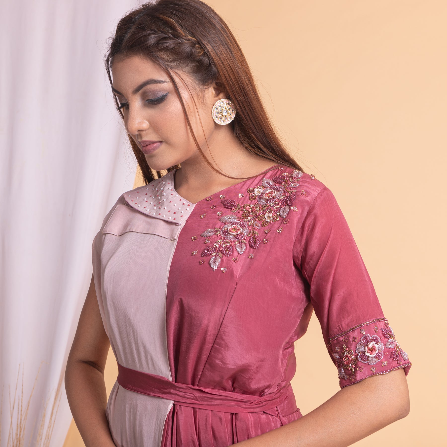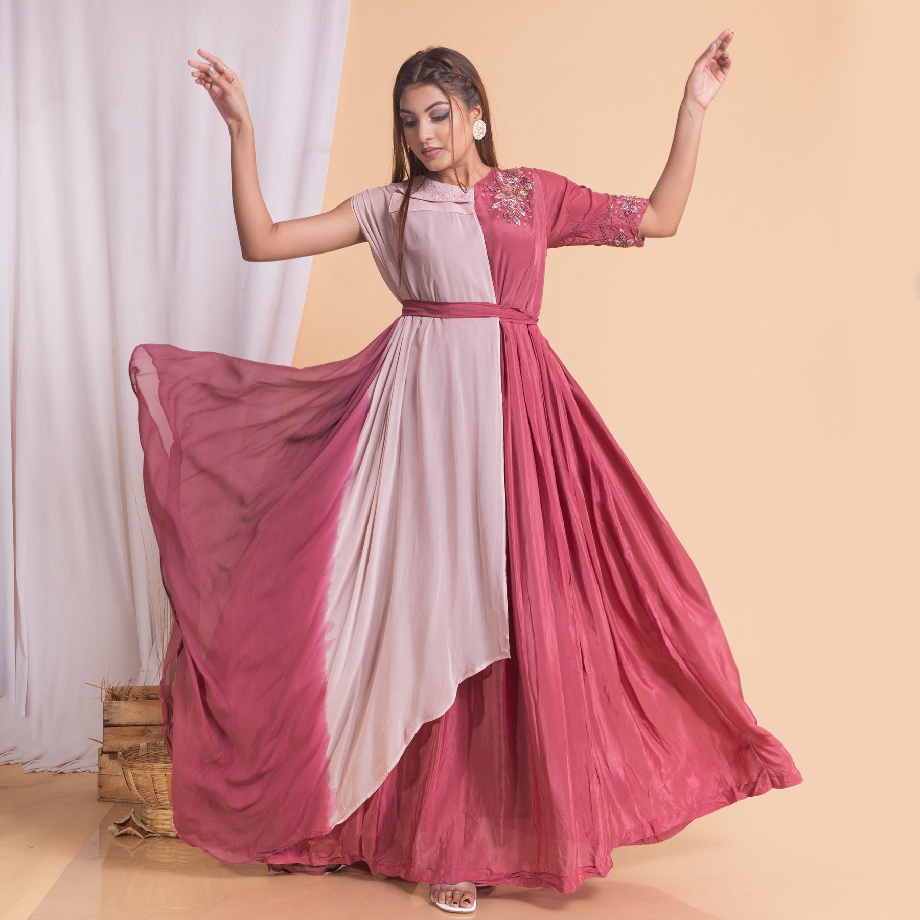 Festive montage, forever treasured- Two shade embroidered belt gown made of crepe and georgette fabric with handwork of cutdana, zardosi and sequin. Pastels that remain our go to for any occasion with collar neck and one sided drape.
