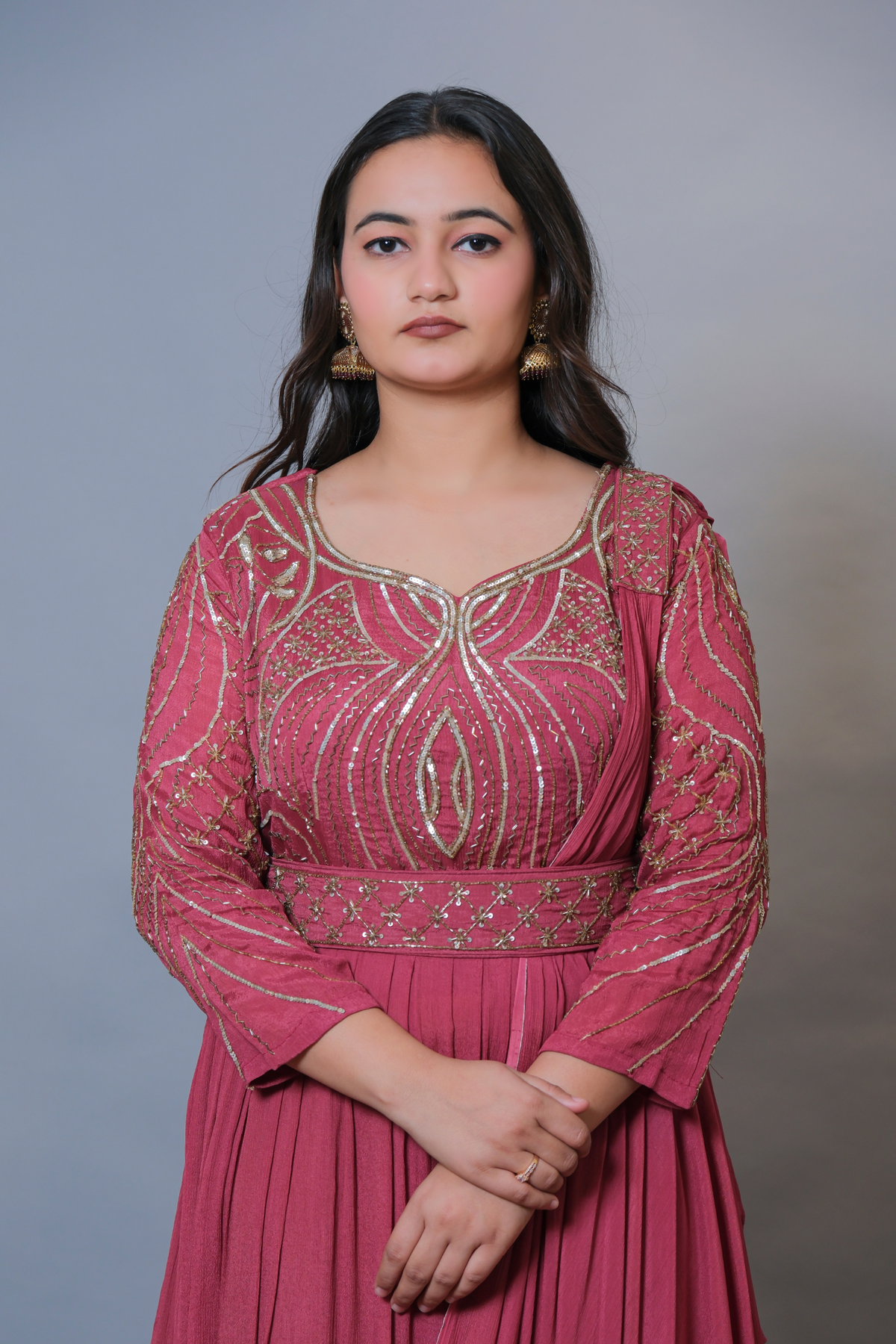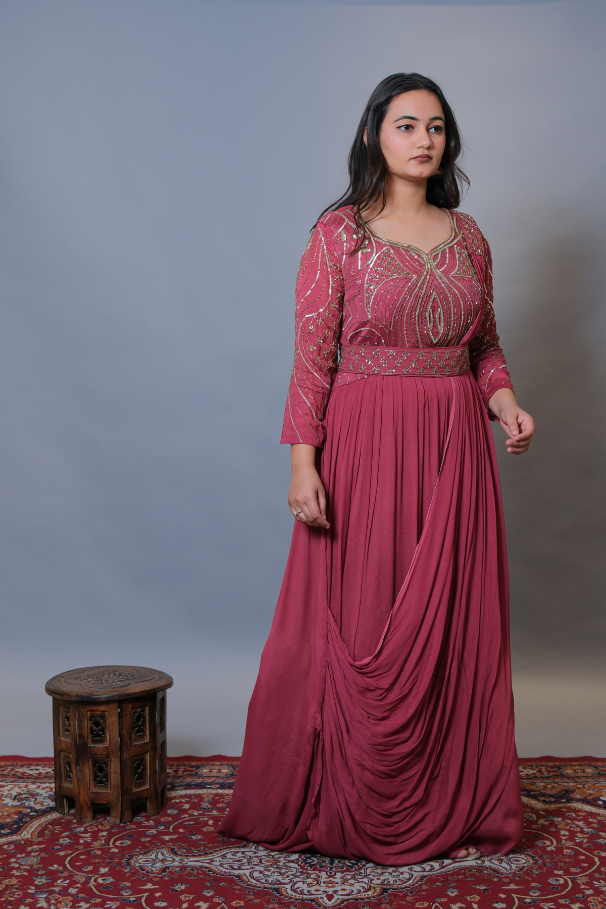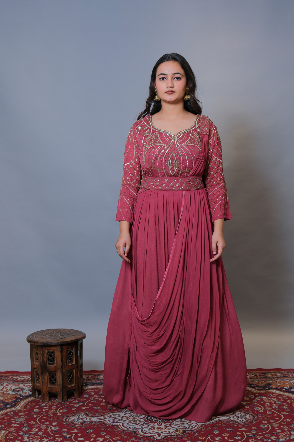 Wrapped in the richness of maroon skirt drape with intricate handwork of golden cutdana and shimmering sequins- a masterpiece that sparkles with every detail.