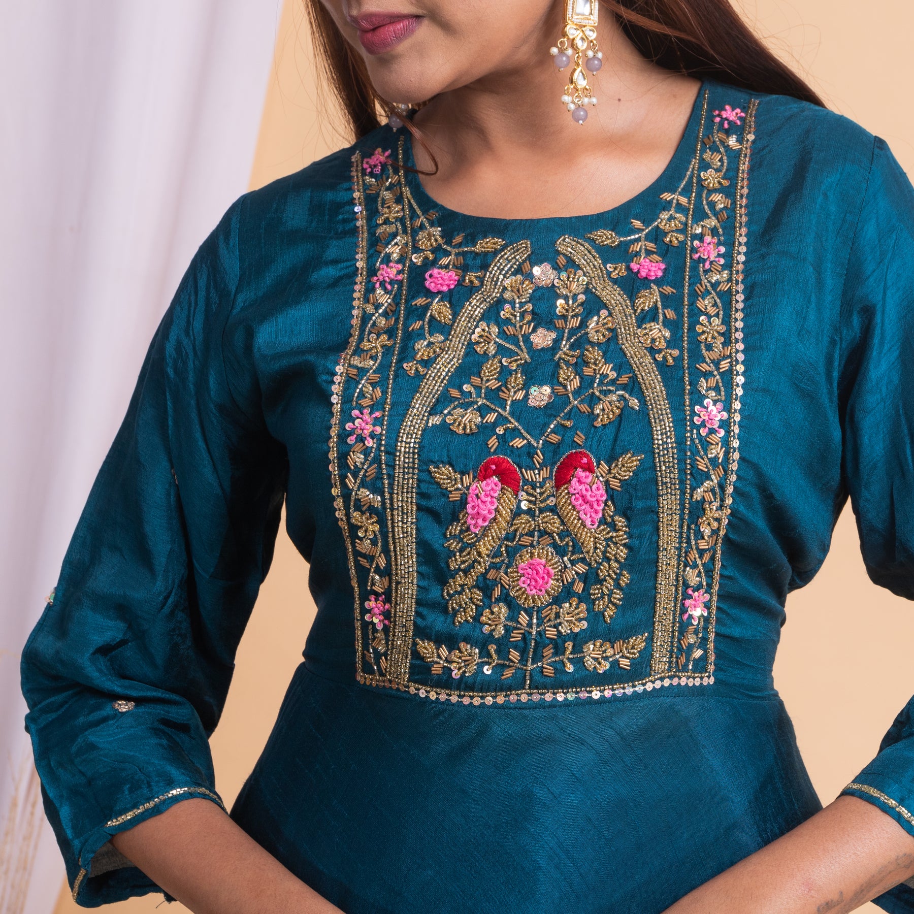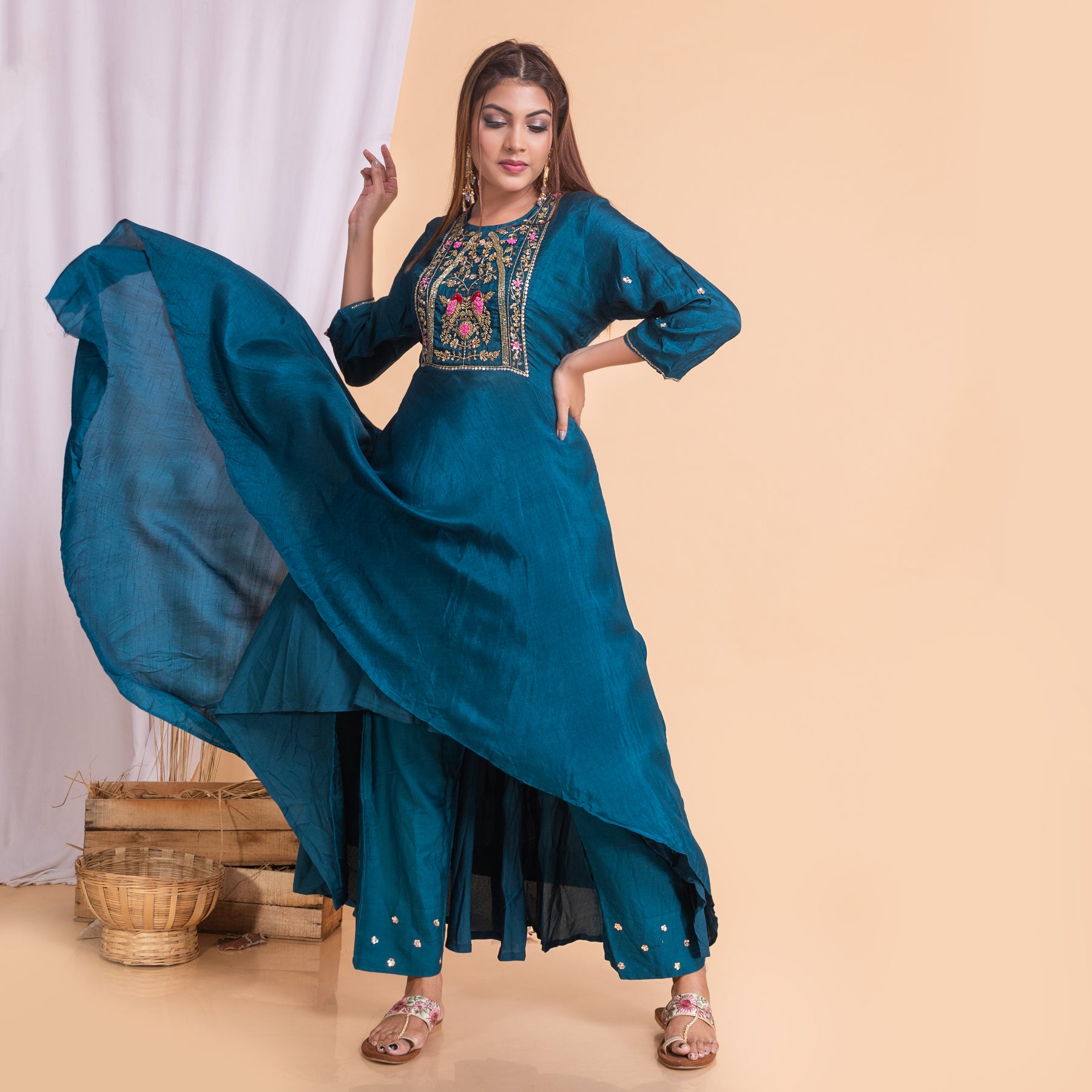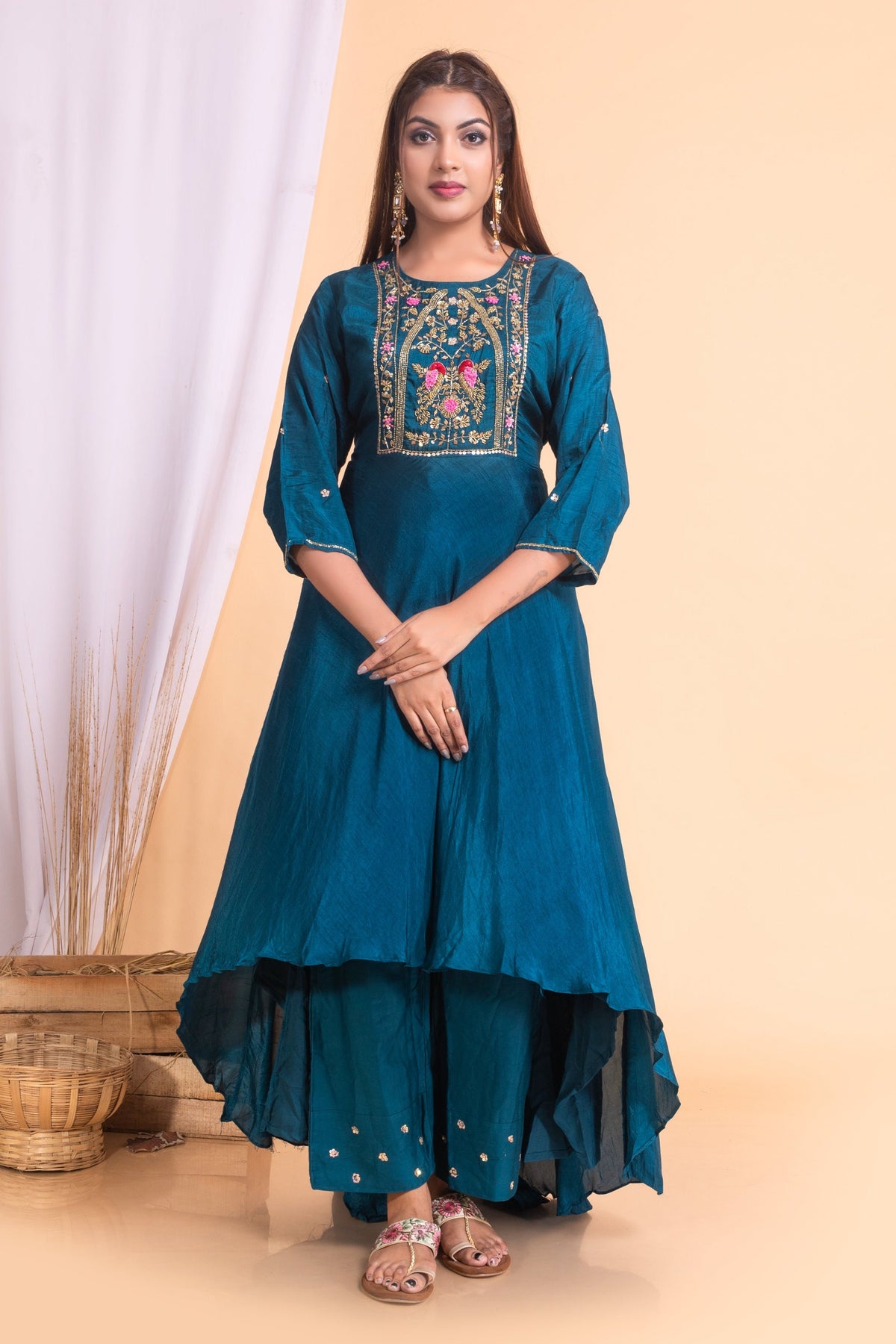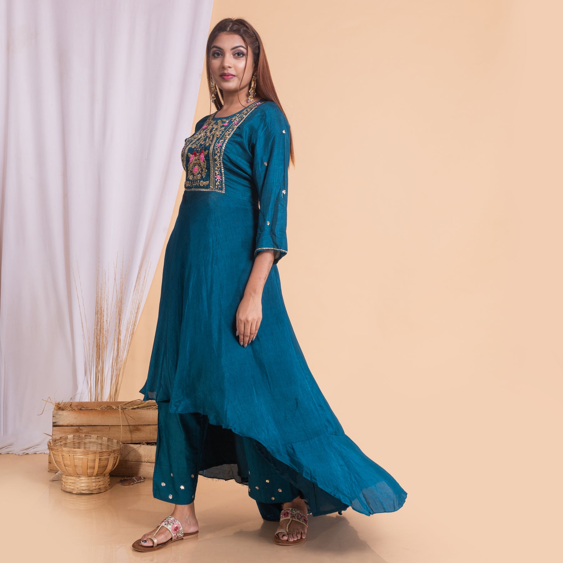 Witness the charm of artisitional hand embroided on beautiful ocean blue color high-low kurta with pants of muslin silk fabric. Handwork of cutdana,resham and zardosi.