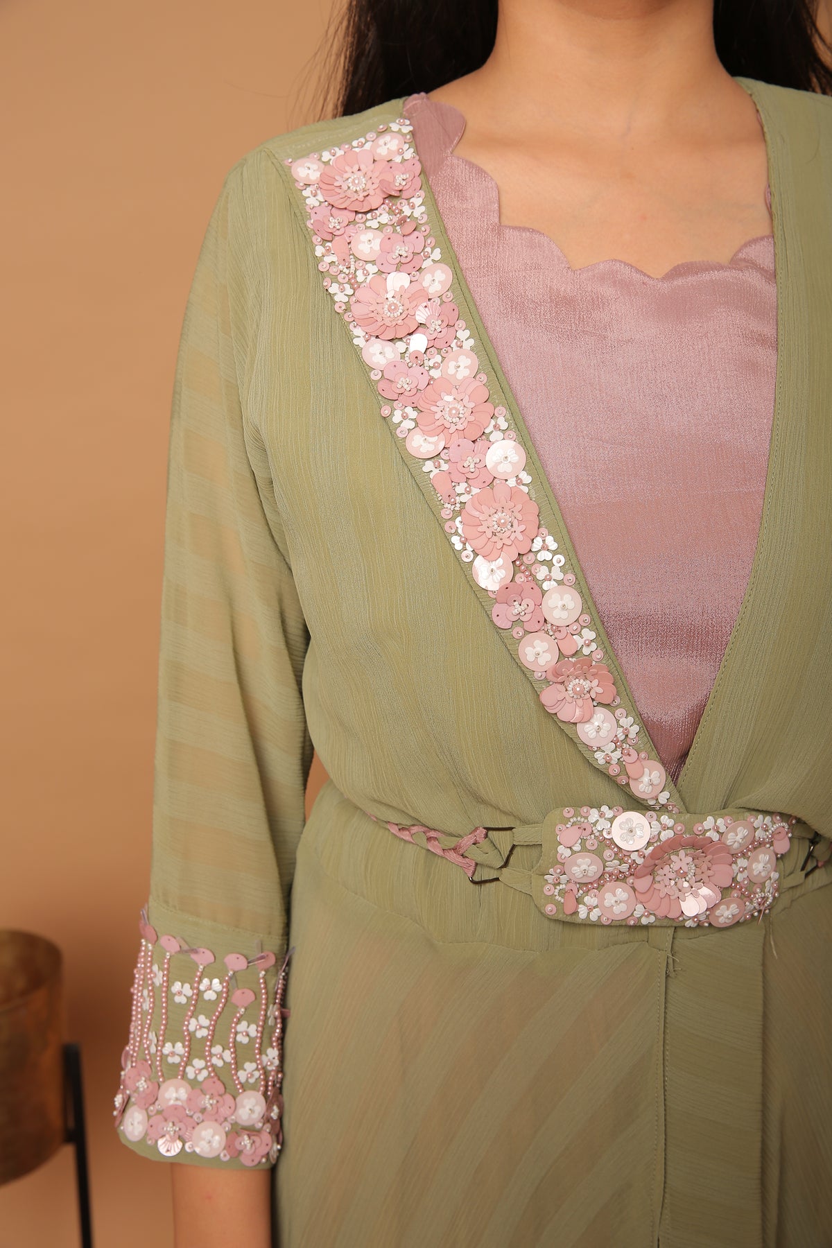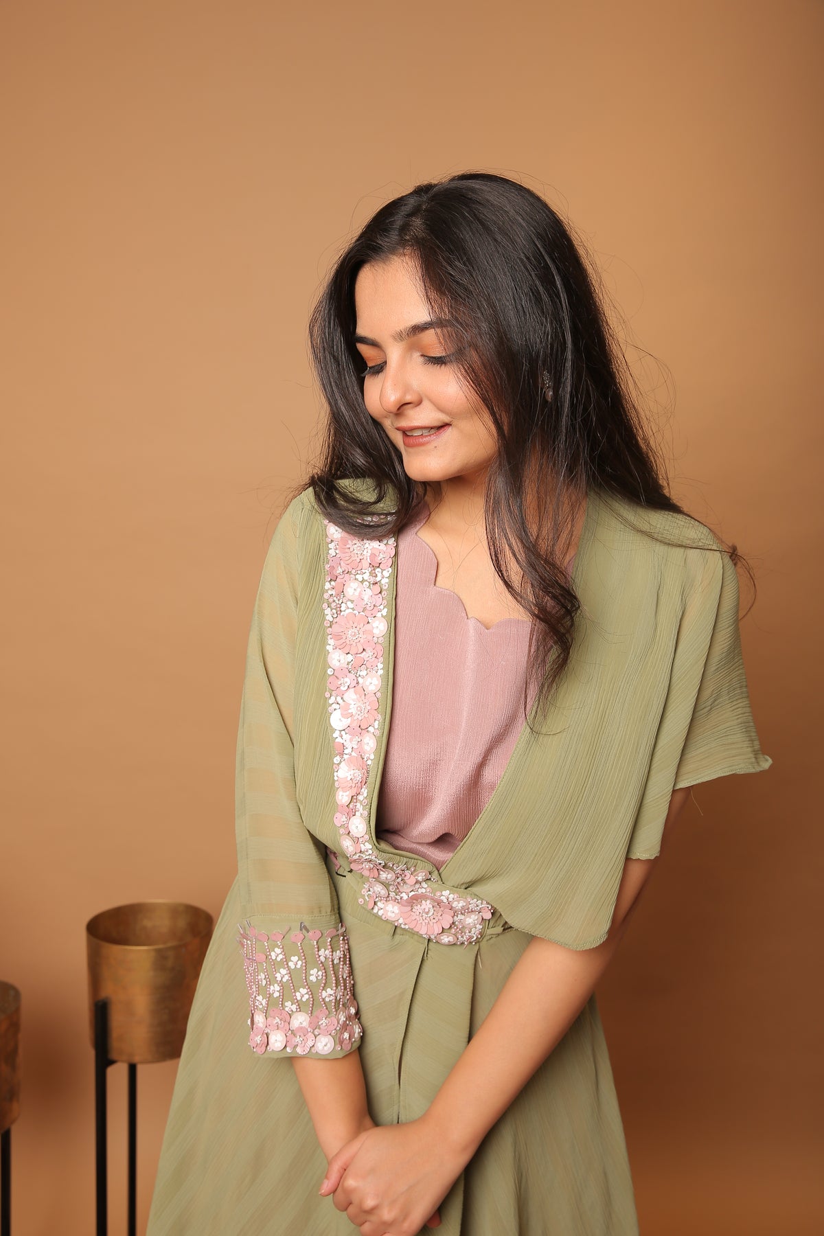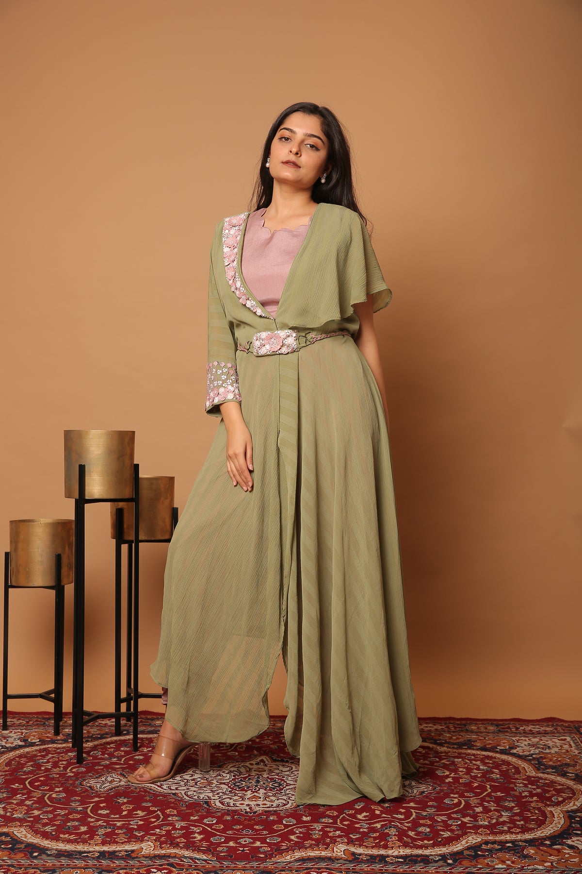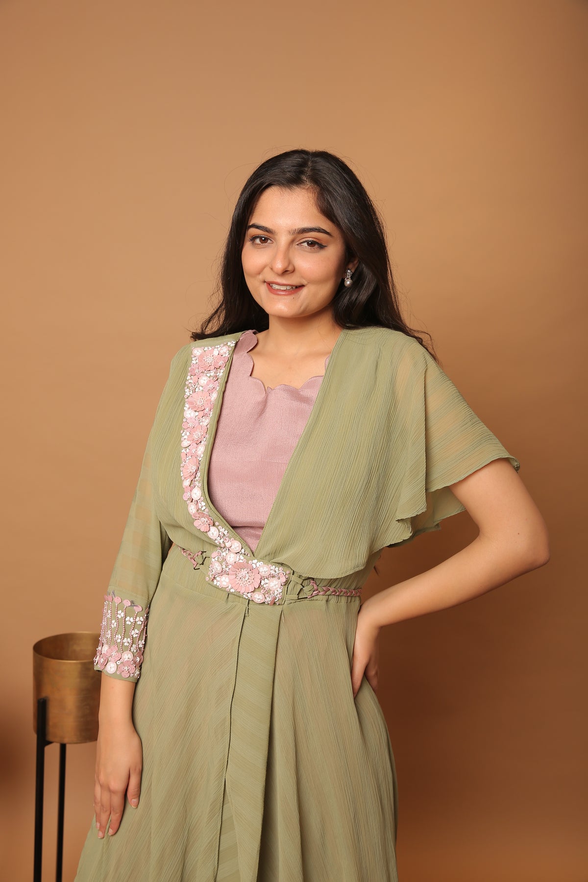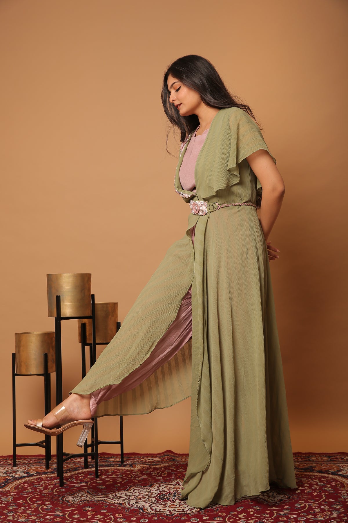 This diwali stand out in our exquisite outfit- a crop top, dhoti and a stylish cape. Complete with a chic belt to enhance your look. Crafted from luxurious chinon fabric, it showcase intricate handwork on one sleeve, the collar and the belt featuring vibrant multi color sequins and lustrous perals. shine bright this diwali