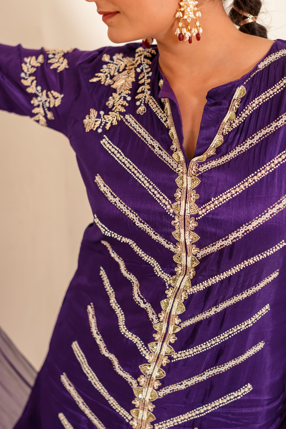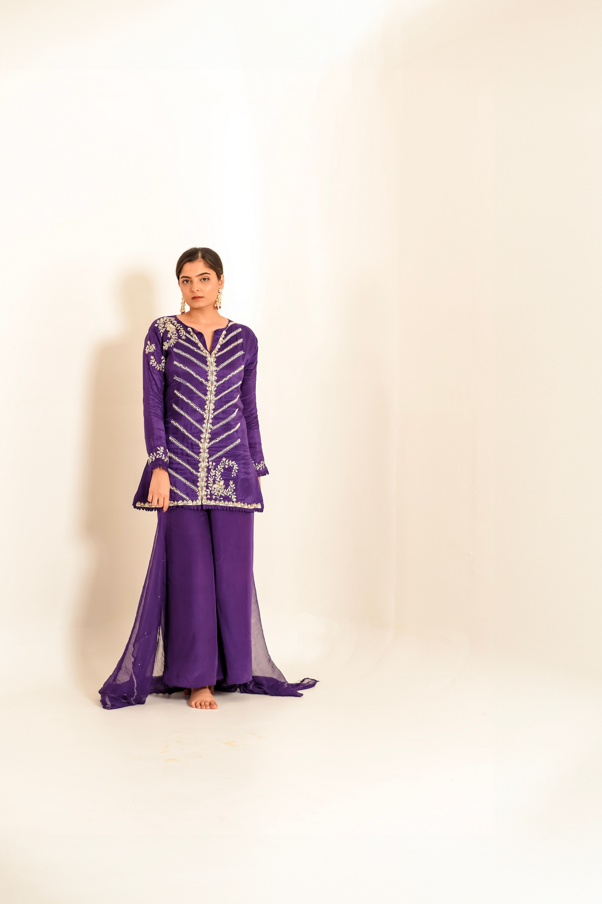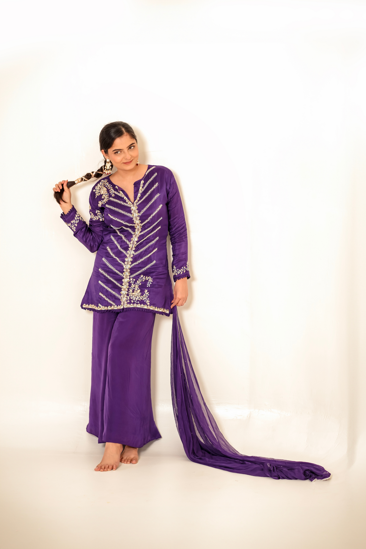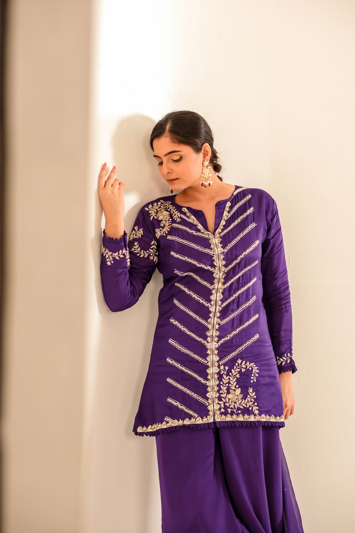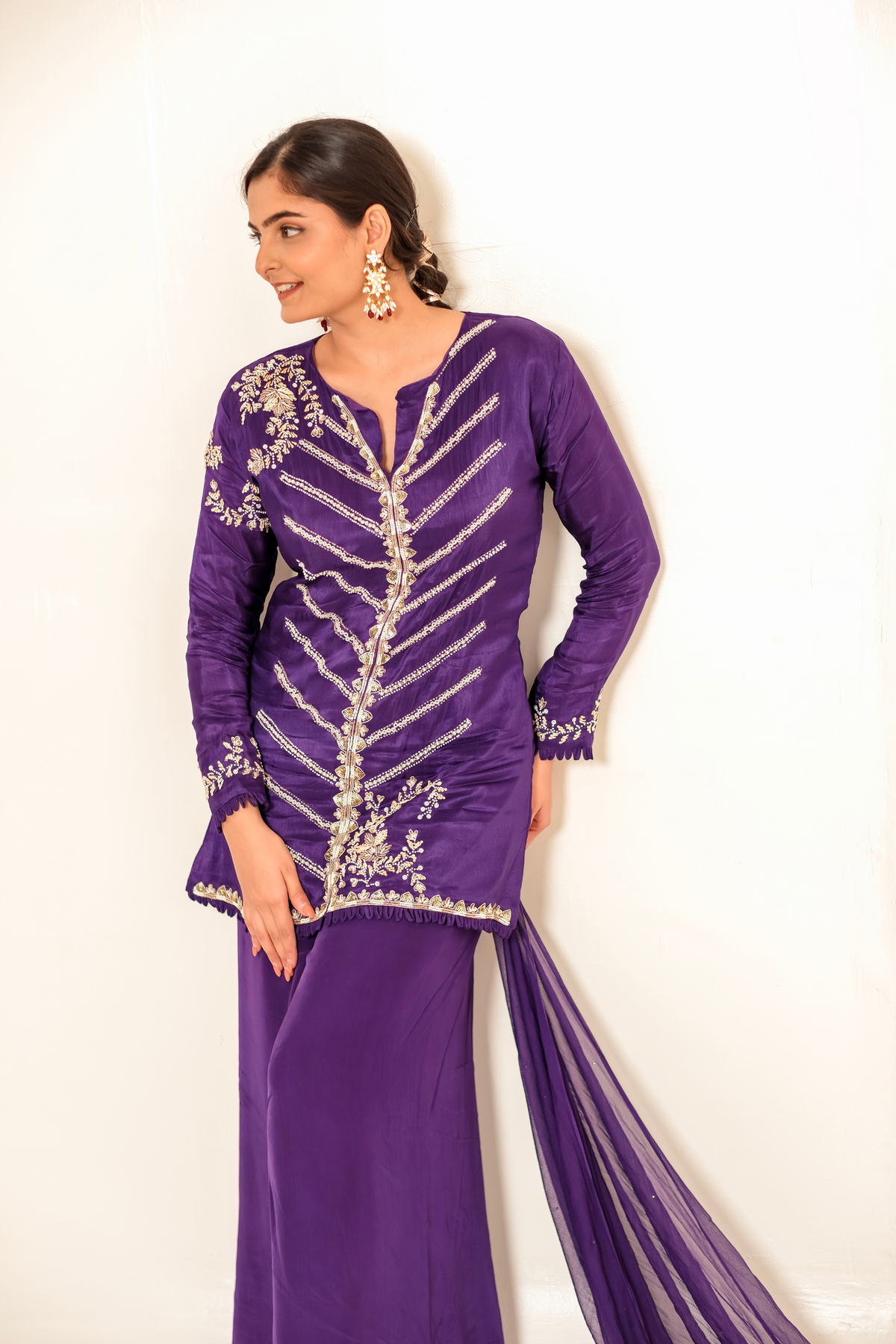 This elegant purple short kurta is adorned with exquisite handwork of zardosi, pearls, and cutdana, adding a touch of luxury and sophistication. Paired with matching plazos and a beautifully designed dupatta, this ensemble is perfect for festive occasions, blending traditional craftsmanship with contemporary style.