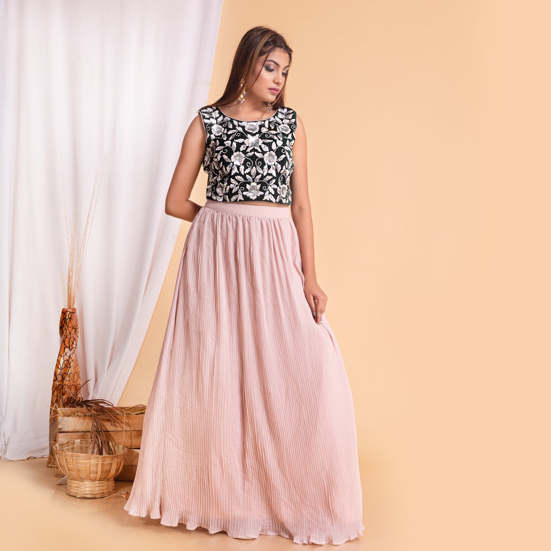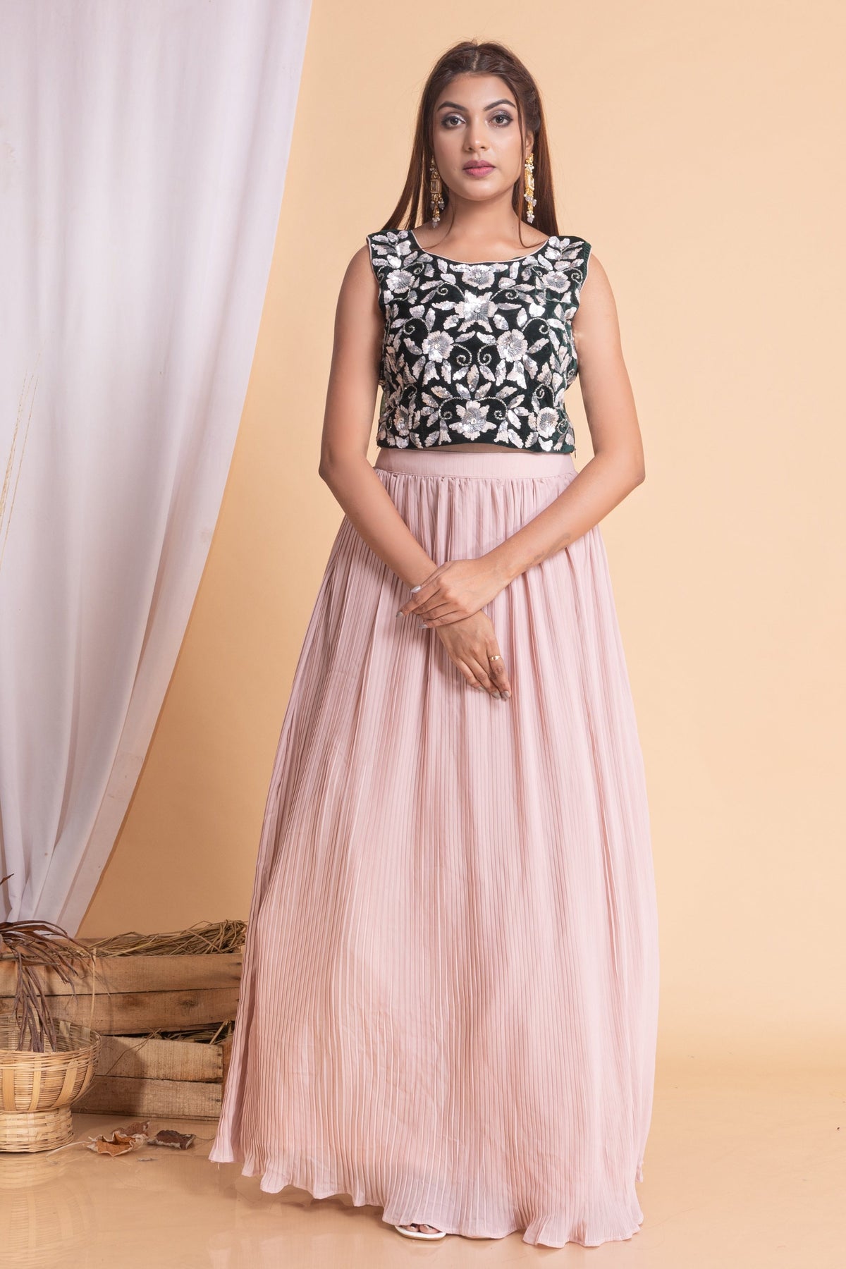 Discover the beauty of mani's ethinic lehenga. This lovely pleated skirt in silk is carefully handmade with multicolor sequin and cutdana on velvet fabric blouse. The attention to detail in each pleat will leave you amazed.
