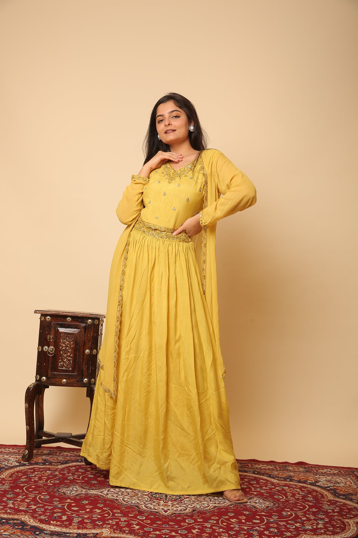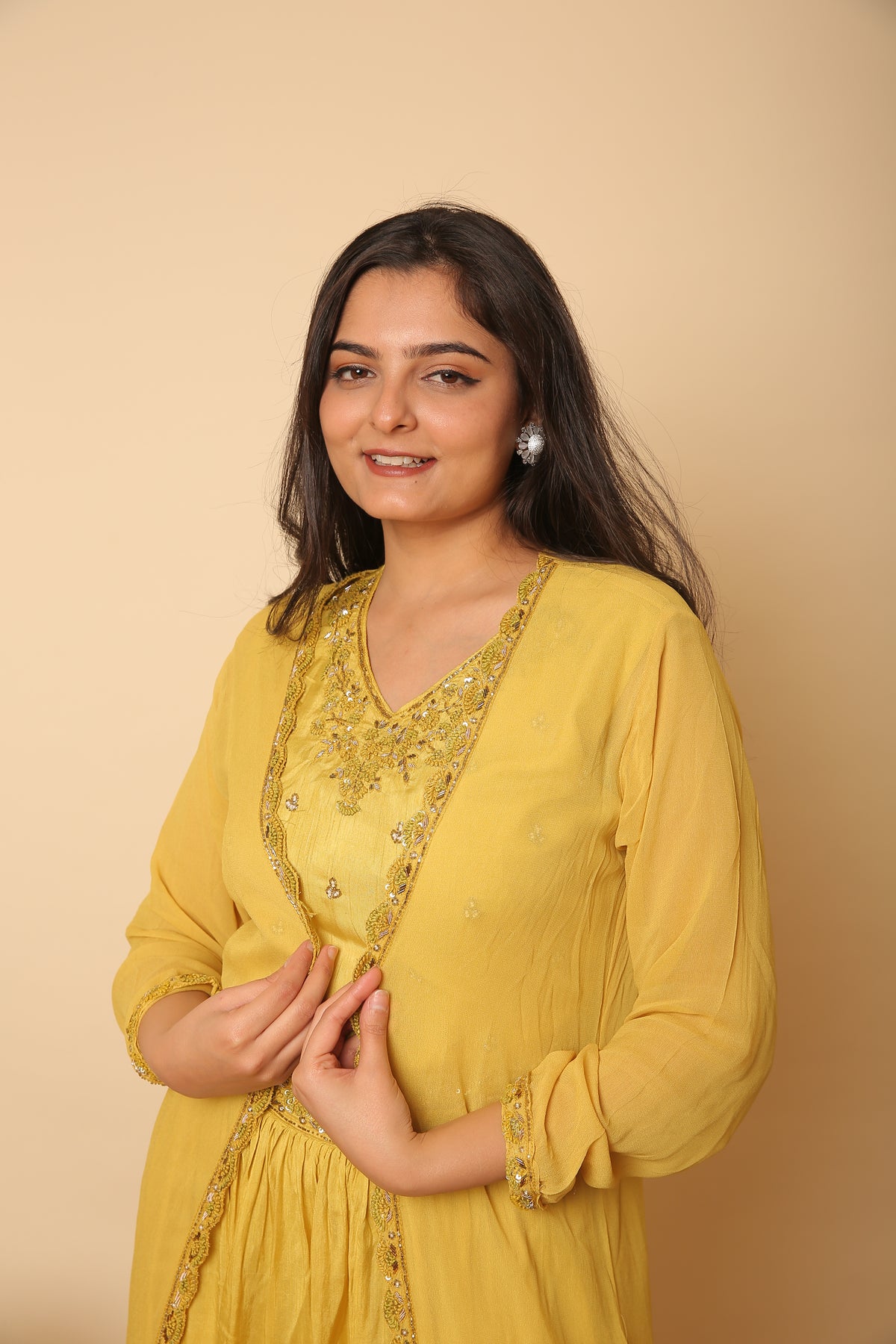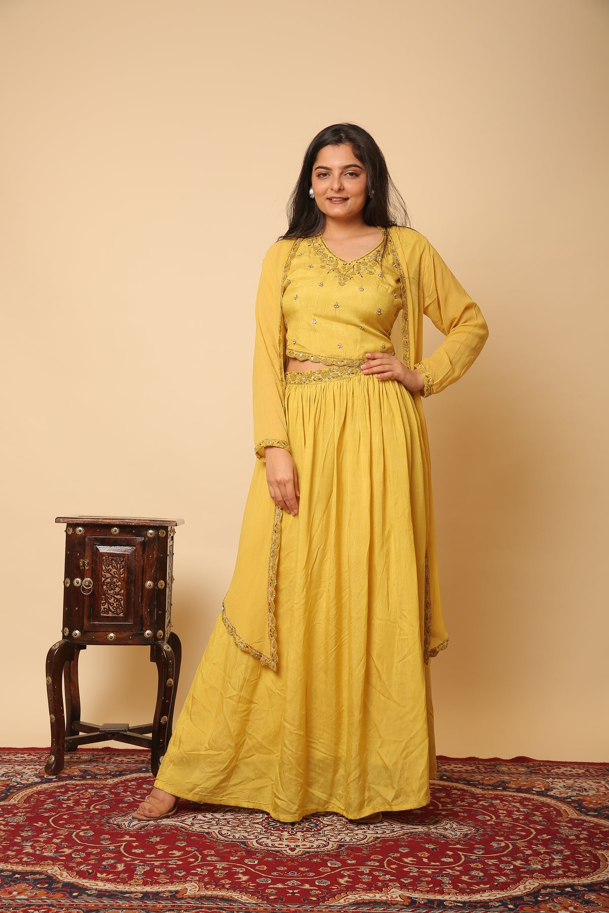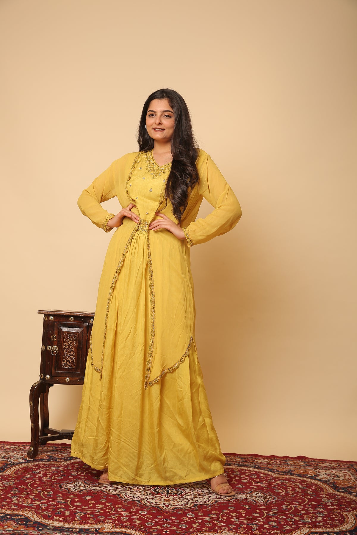 The blouse and skirt are exclusively handworked on luxurious muslin silk of mirror, pearl, resham and cutdana. Adding on to the glamour of this dress is a georgette jacket that elevates your style