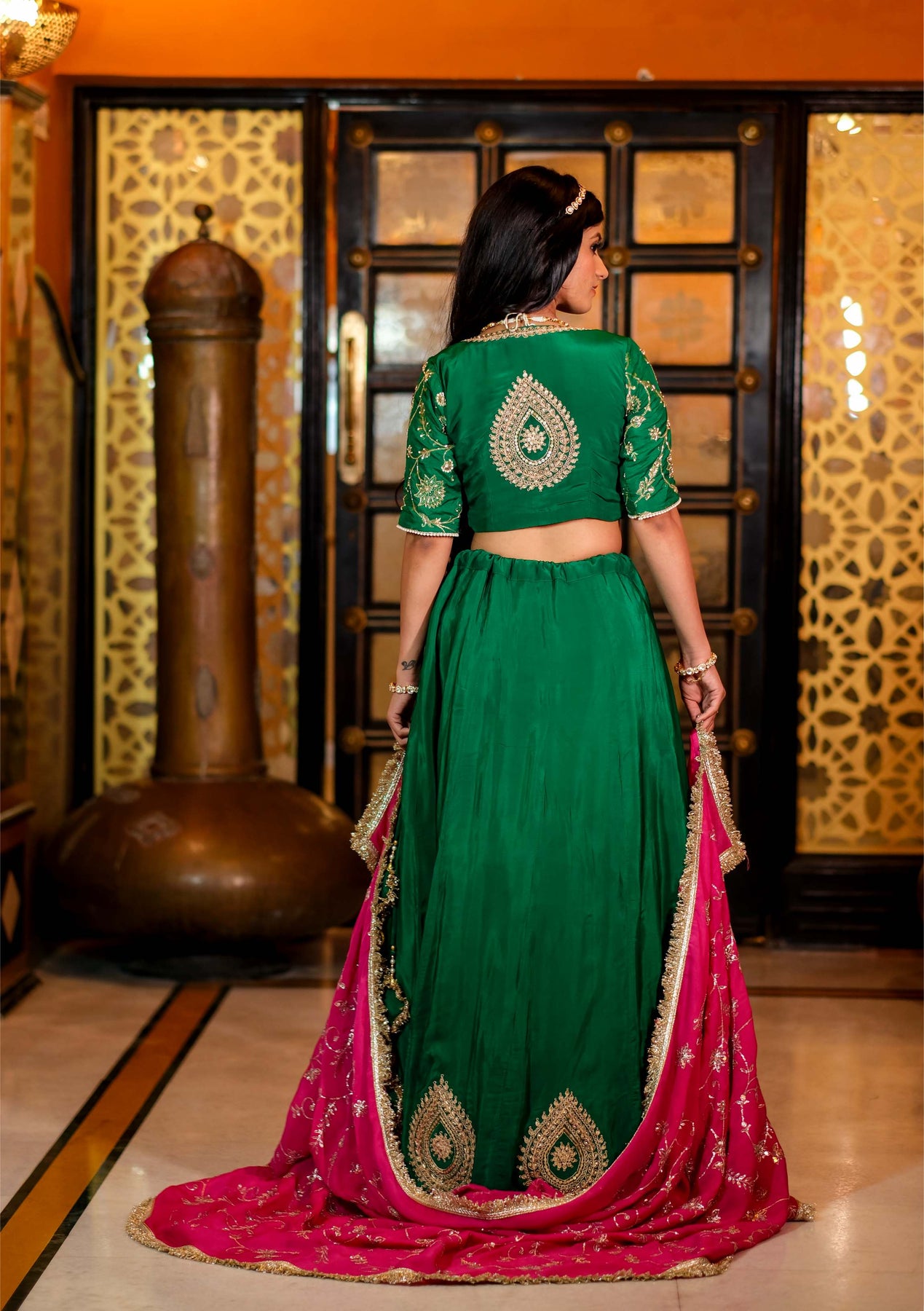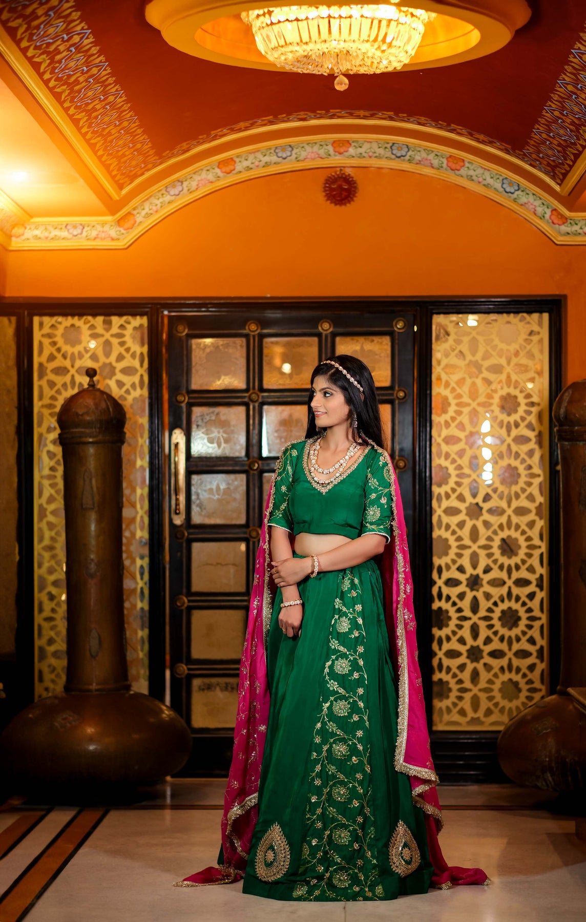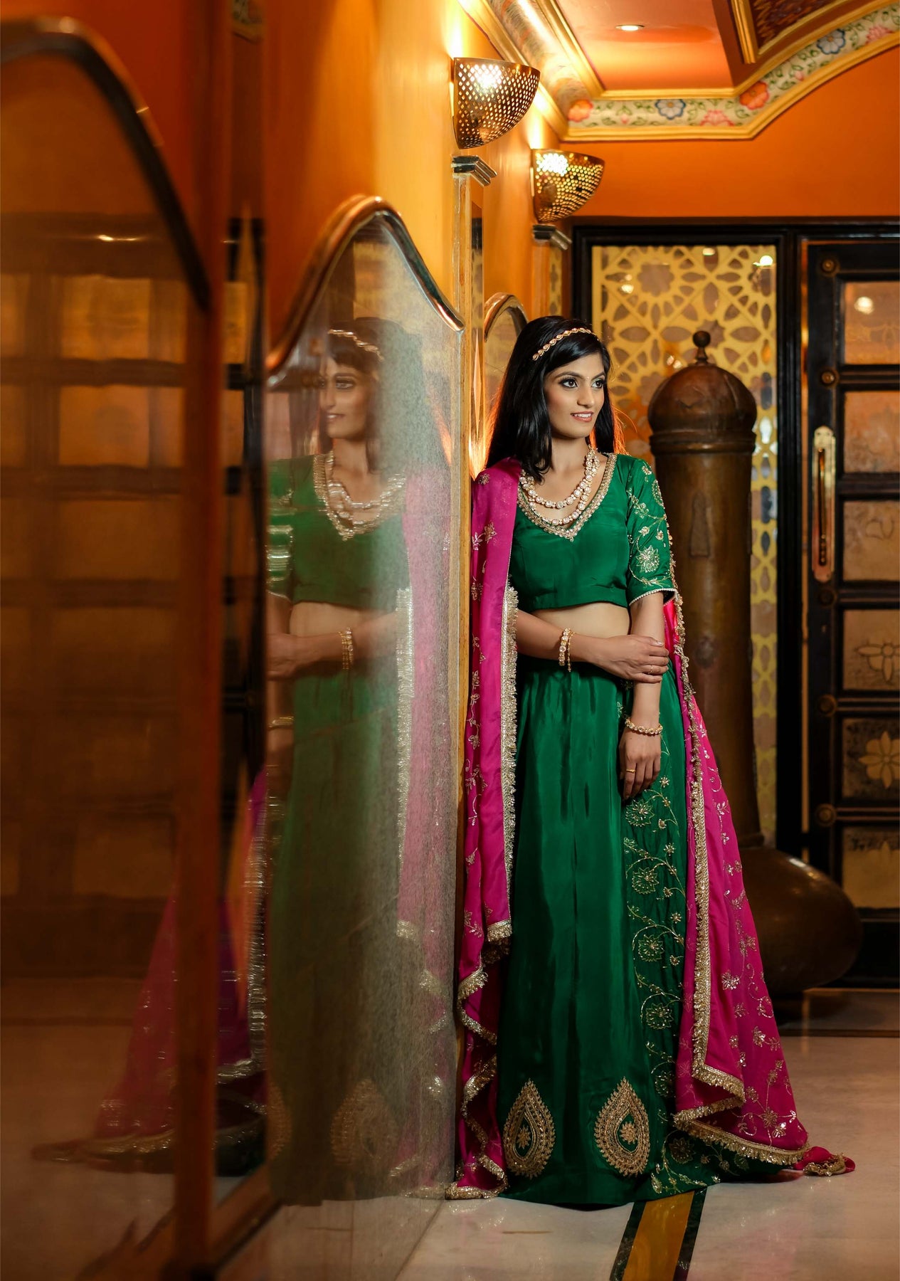 Forest green lehenga is on crepe fabric adorned with intricated embroidery on it. It is having 12 kallis in which 11 kallis are having hand embroidery of marodi. The 13th kalli is highlight of this lehenga,made on banarsi fabric with highlight of cutdana and pearl. paired elegantly with an embroidered blouse. The blouse is having marodi embroidery on the back as wee. The dupatta is in full jal work and in contrast. Dupatta is having four sided fringes borders.