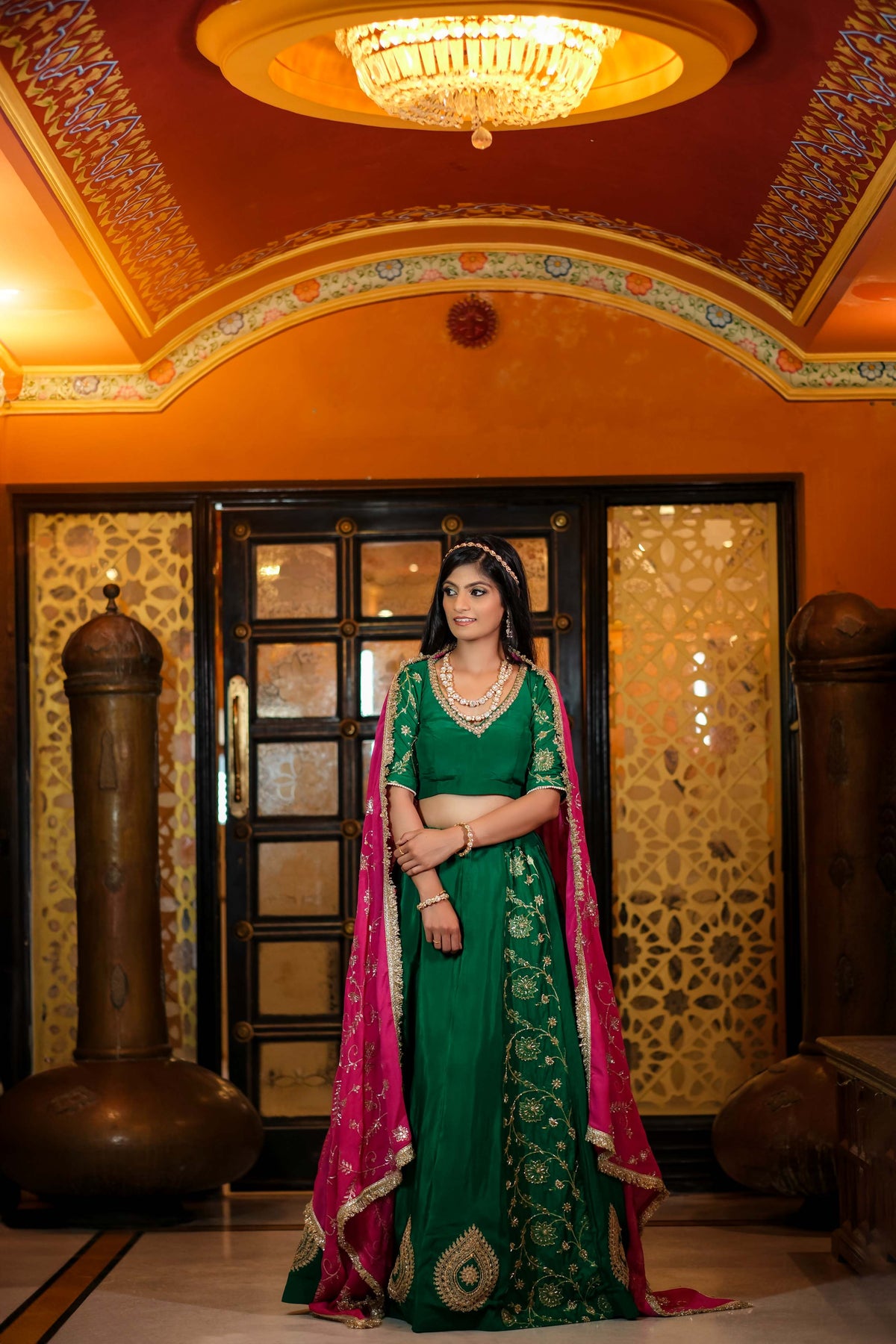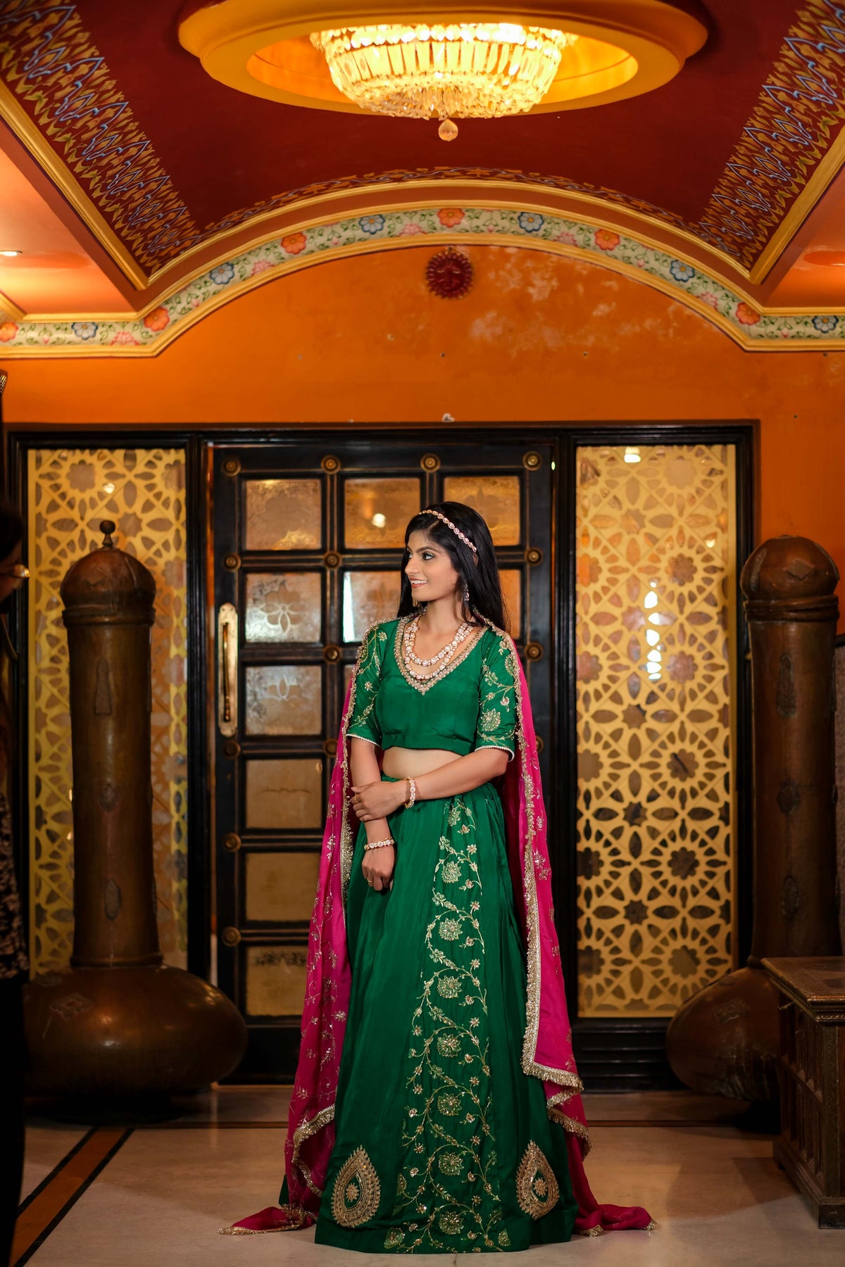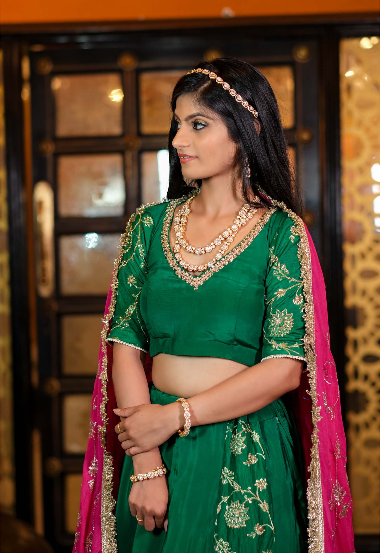 Forest green lehenga is on crepe fabric adorned with intricated embroidery on it. It is having 12 kallis in which 11 kallis are having hand embroidery of marodi. The 13th kalli is highlight of this lehenga,made on banarsi fabric with highlight of cutdana and pearl. paired elegantly with an embroidered blouse. The blouse is having marodi embroidery on the back as wee. The dupatta is in full jal work and in contrast. Dupatta is having four sided fringes borders.