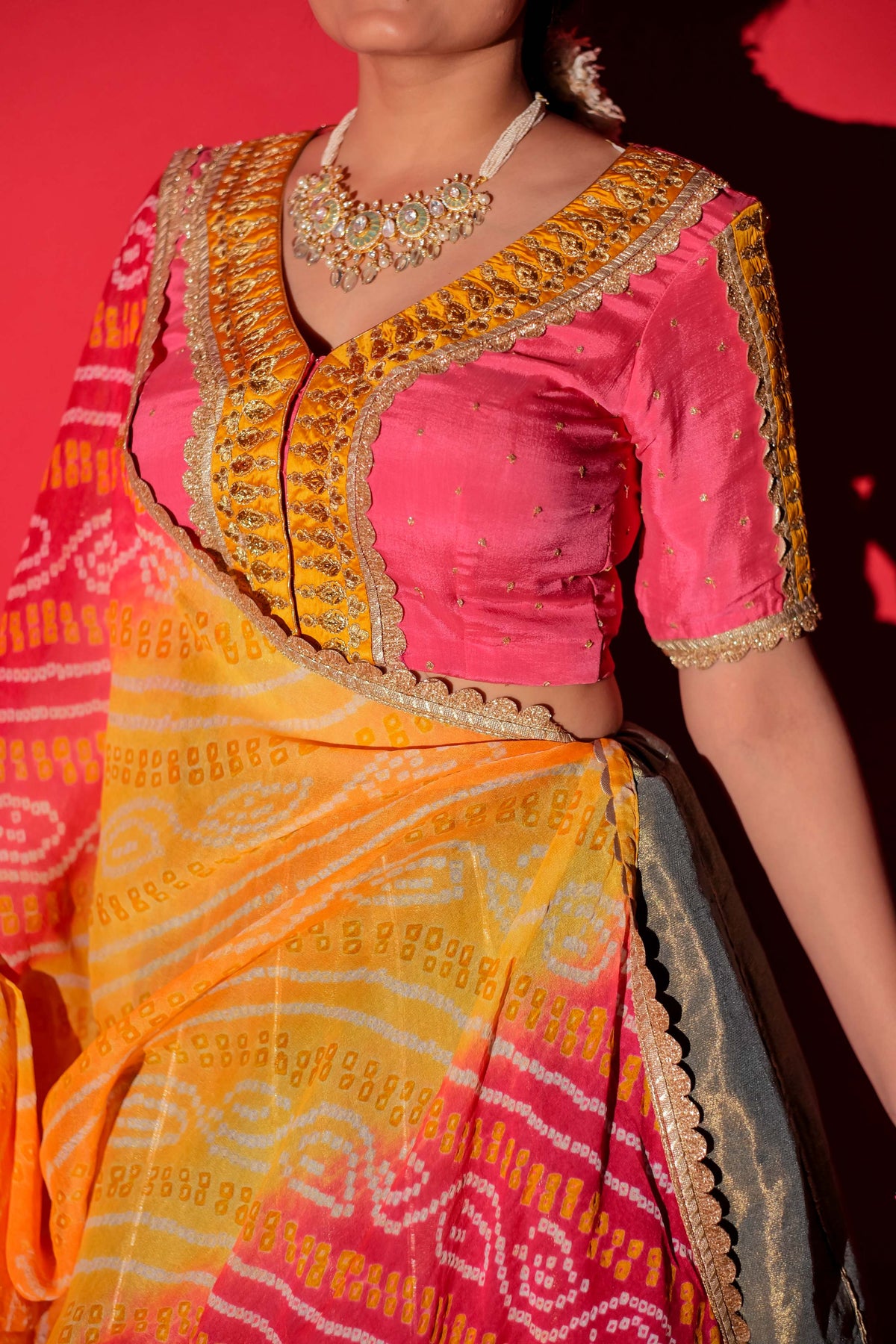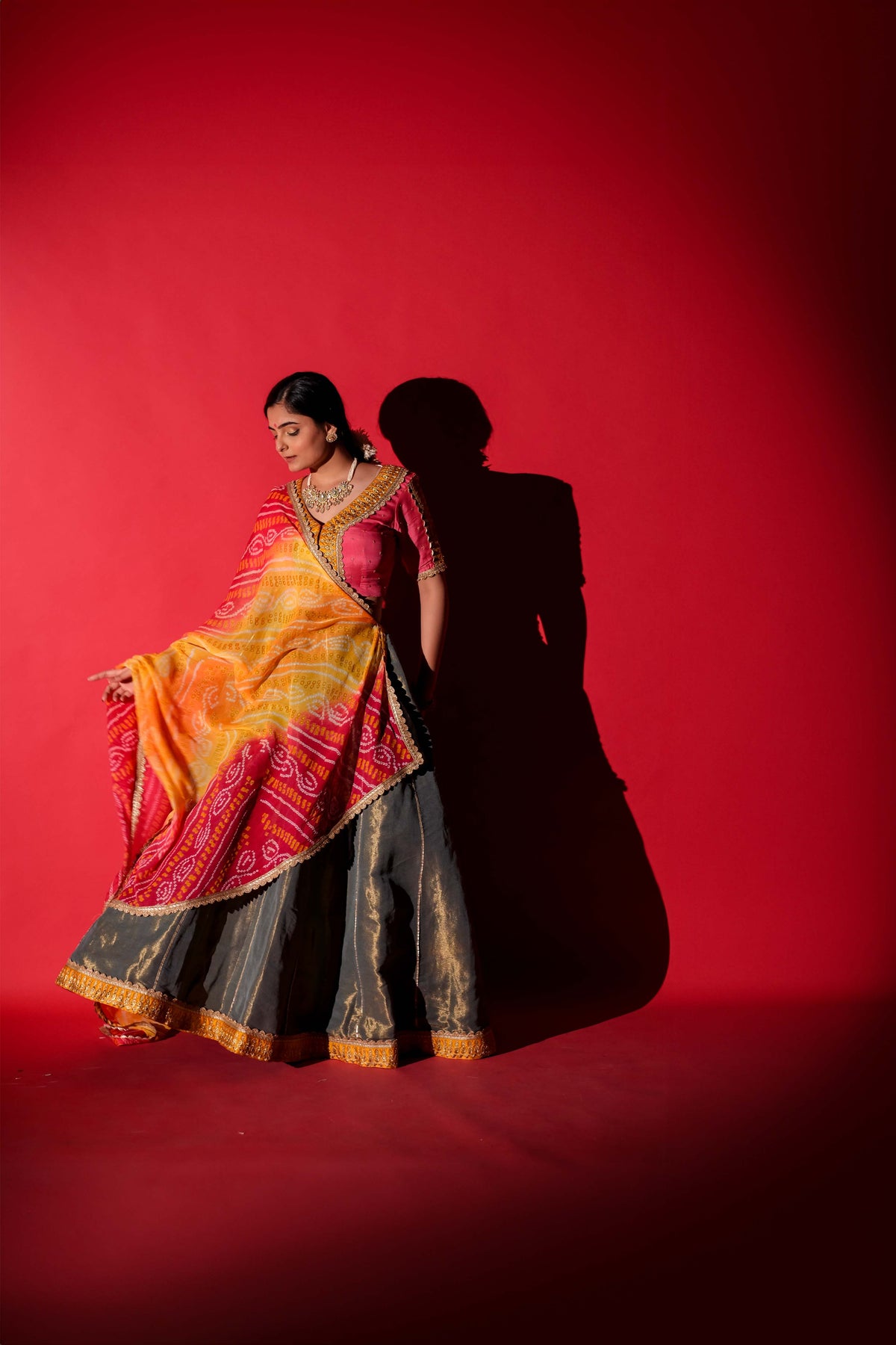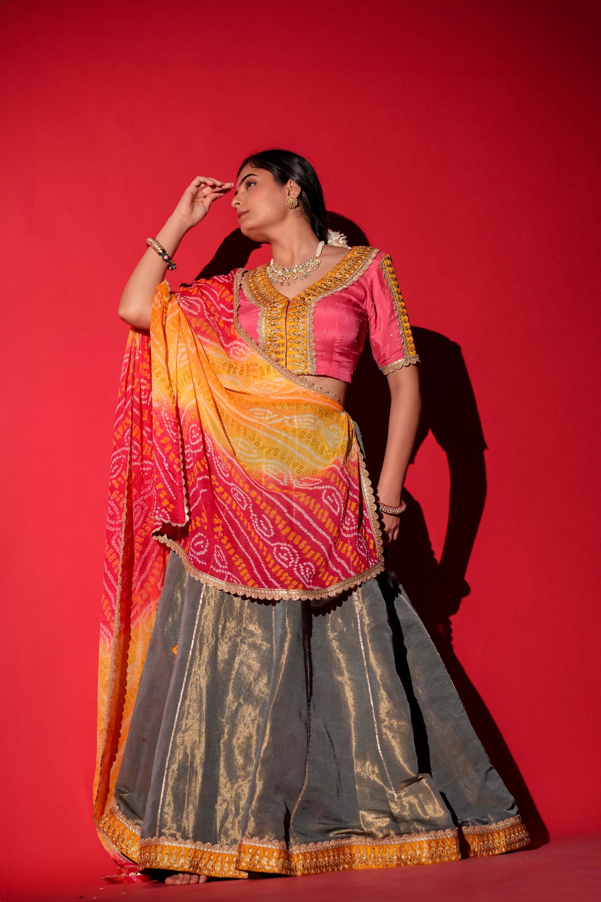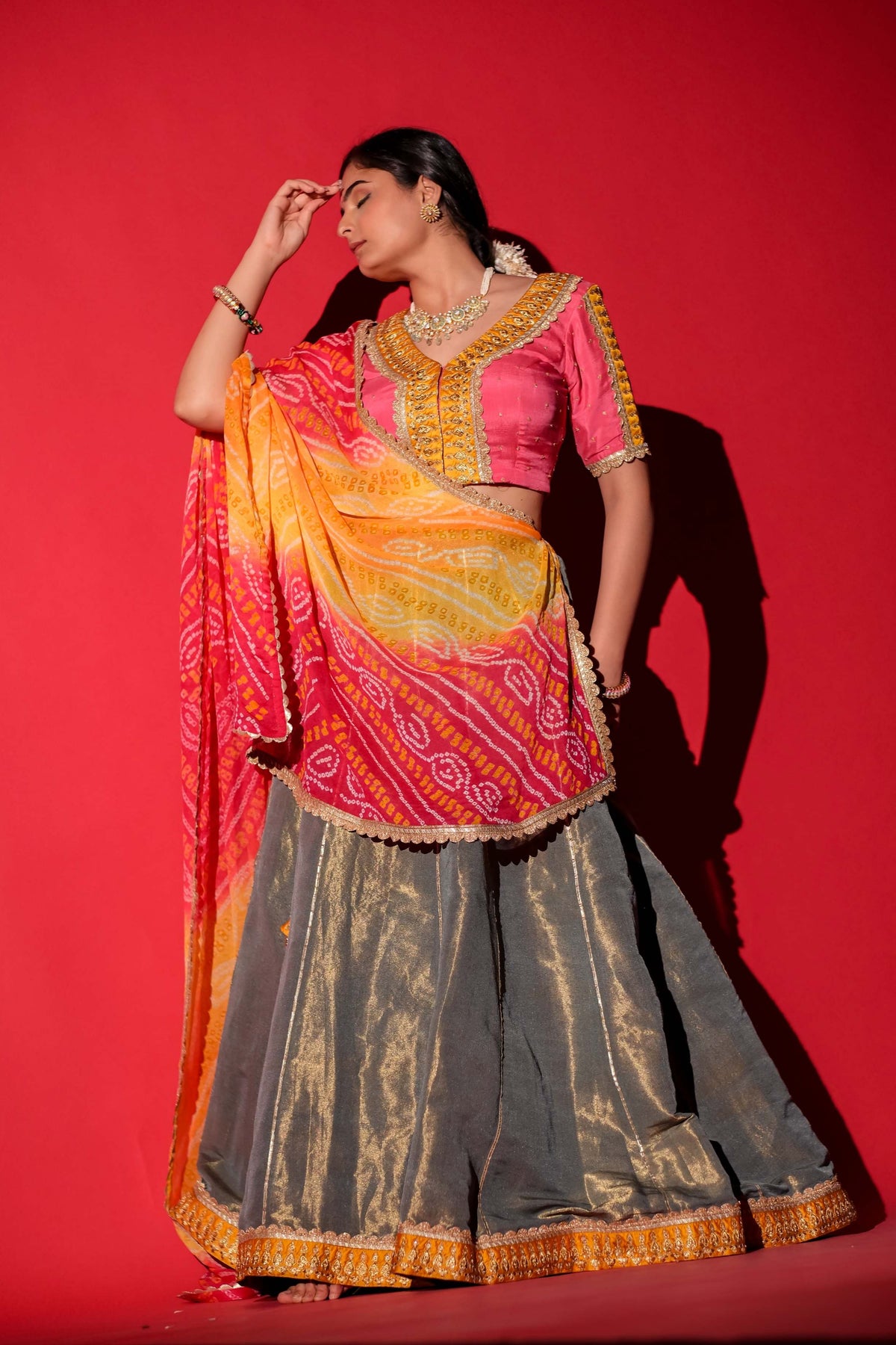 The lehenga features a beautiful flow and a soft sheen that catches the light perfectly, creating a mesmerizing effect. Paired with a delicate chinon blouse, it showcases intricate lace work along the vertical seams of the sleeves, adding a touch of sophistication and flair.Completing the ensemble is a pure bandhej dupatta, rich in traditional patterns and vibrant colors, elegantly adorned with lace that complements the lehenga and blouse.