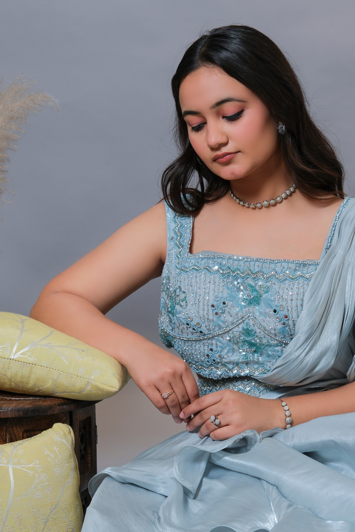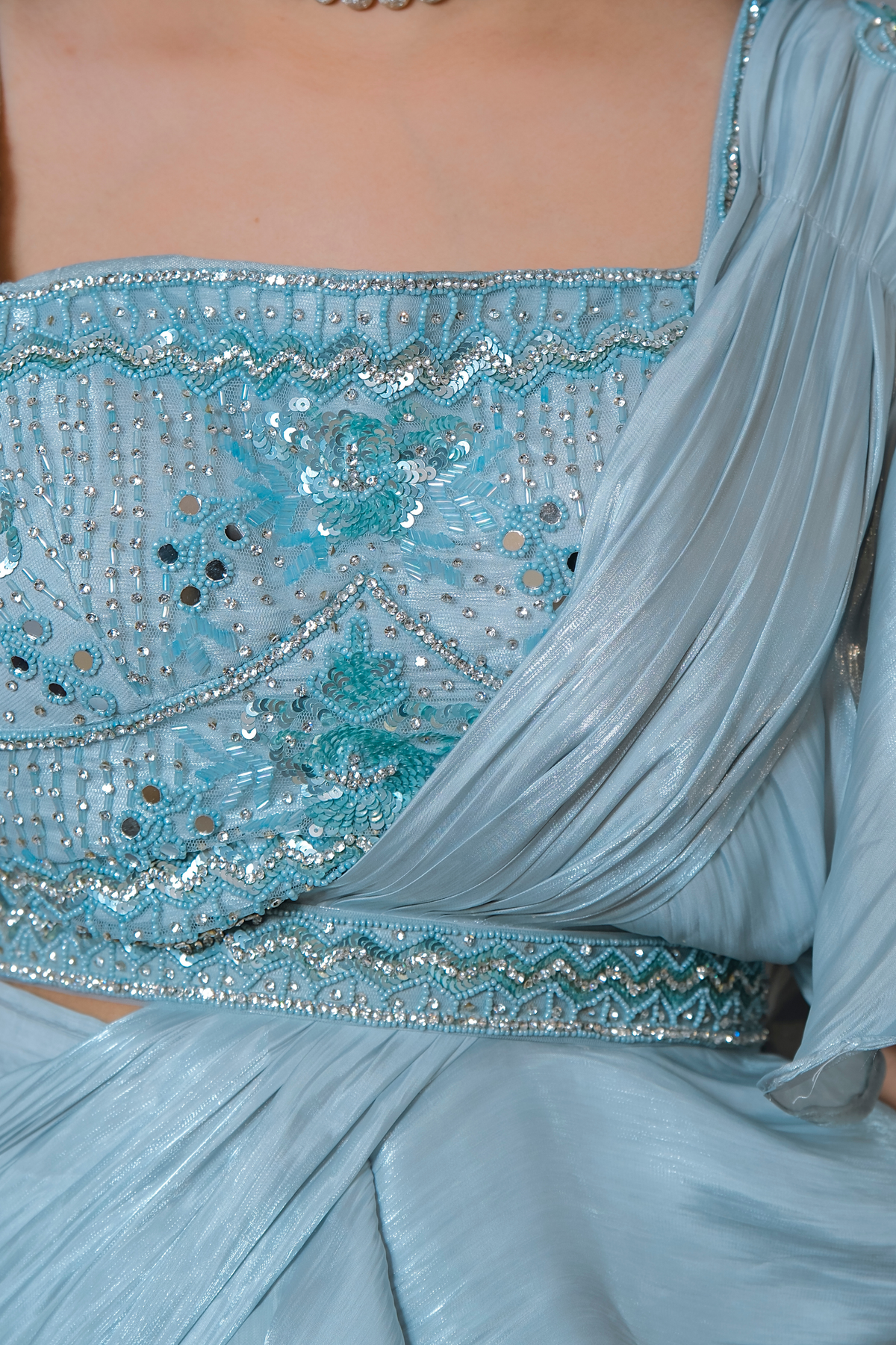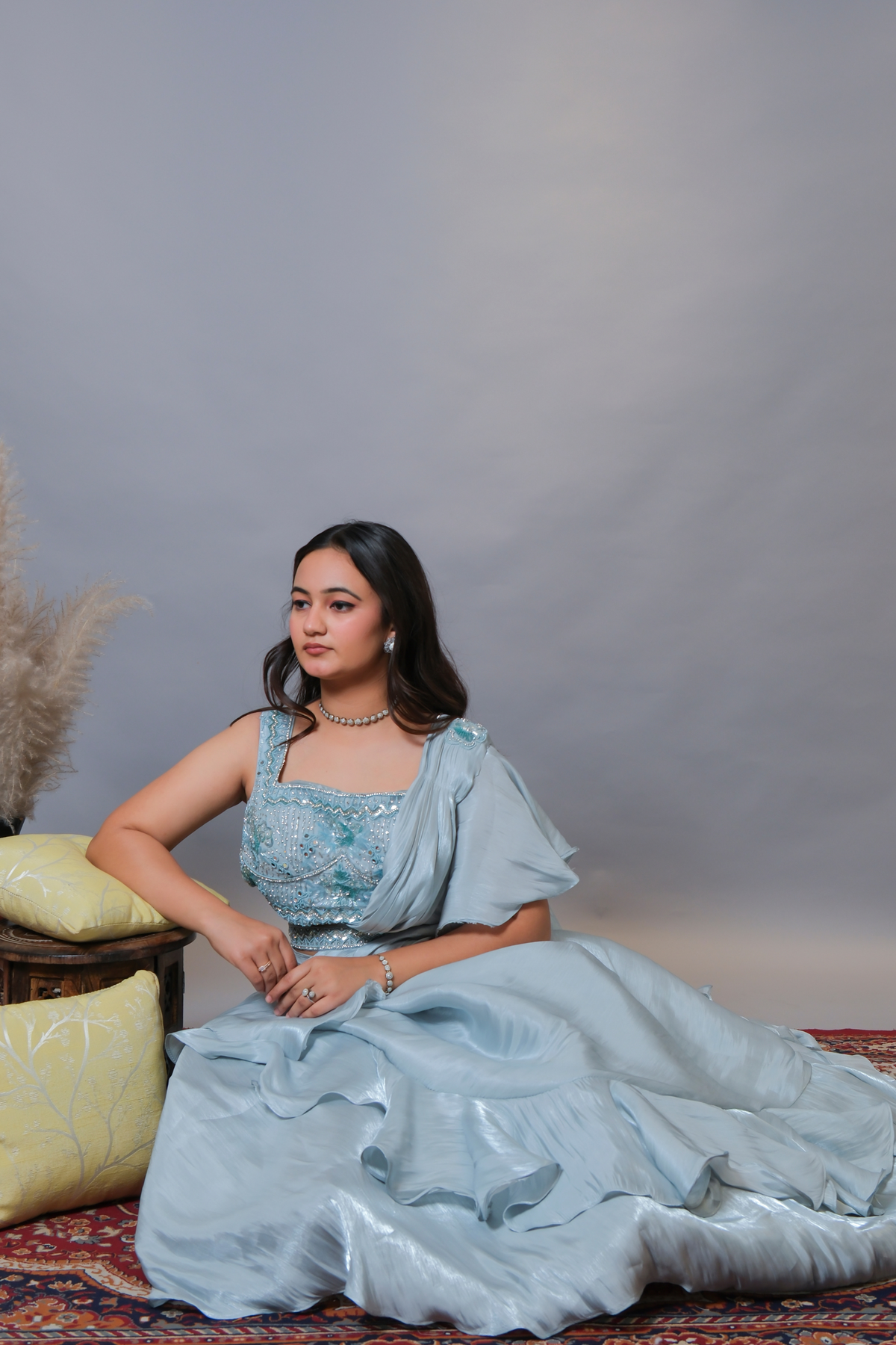 Drape in the cool hues of ice blue lehenga drape with handwork of iceblue and silver cutdana, sequin and beads on blouse and a motif on shoulder, a mesmerizing tale of grace unfolds