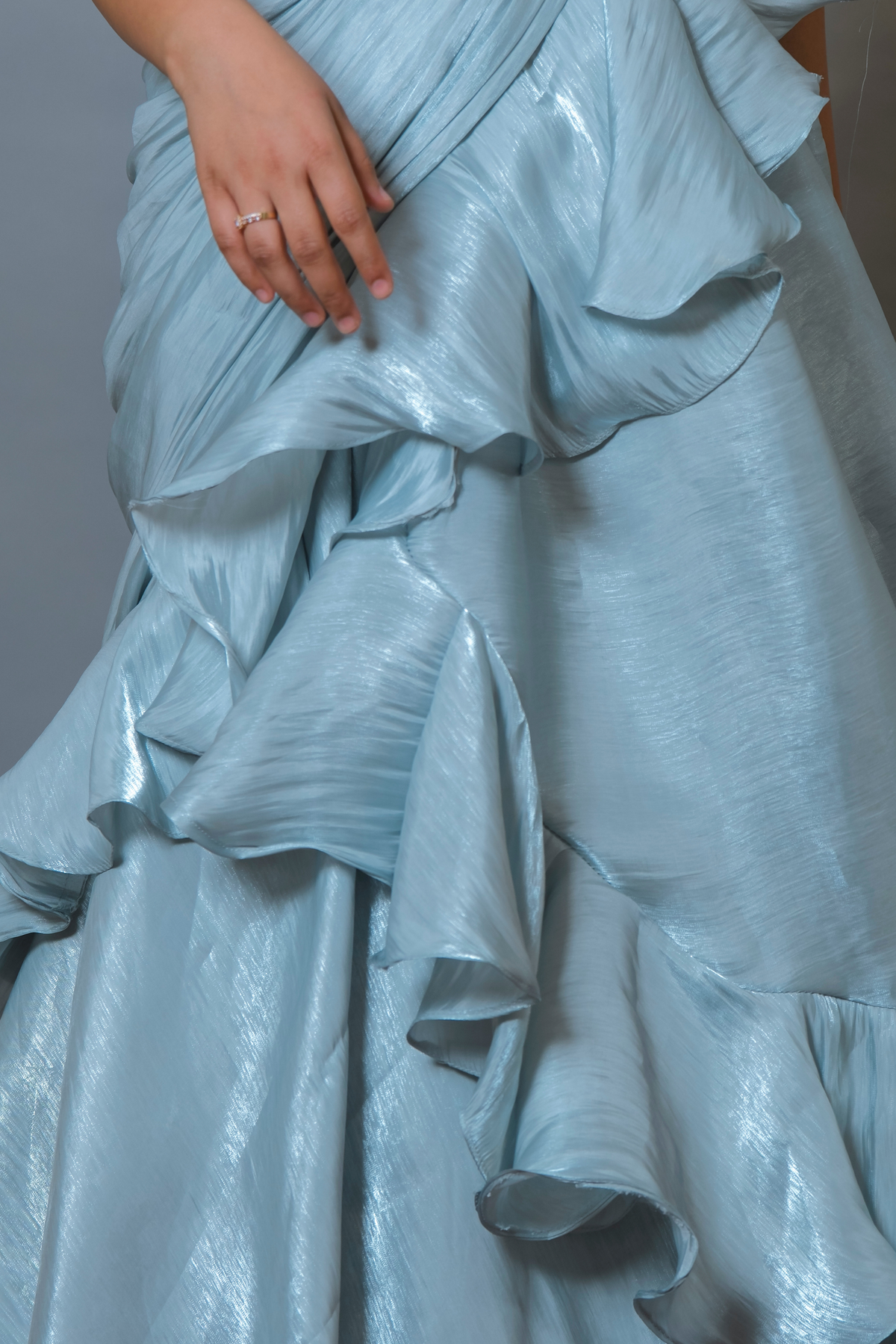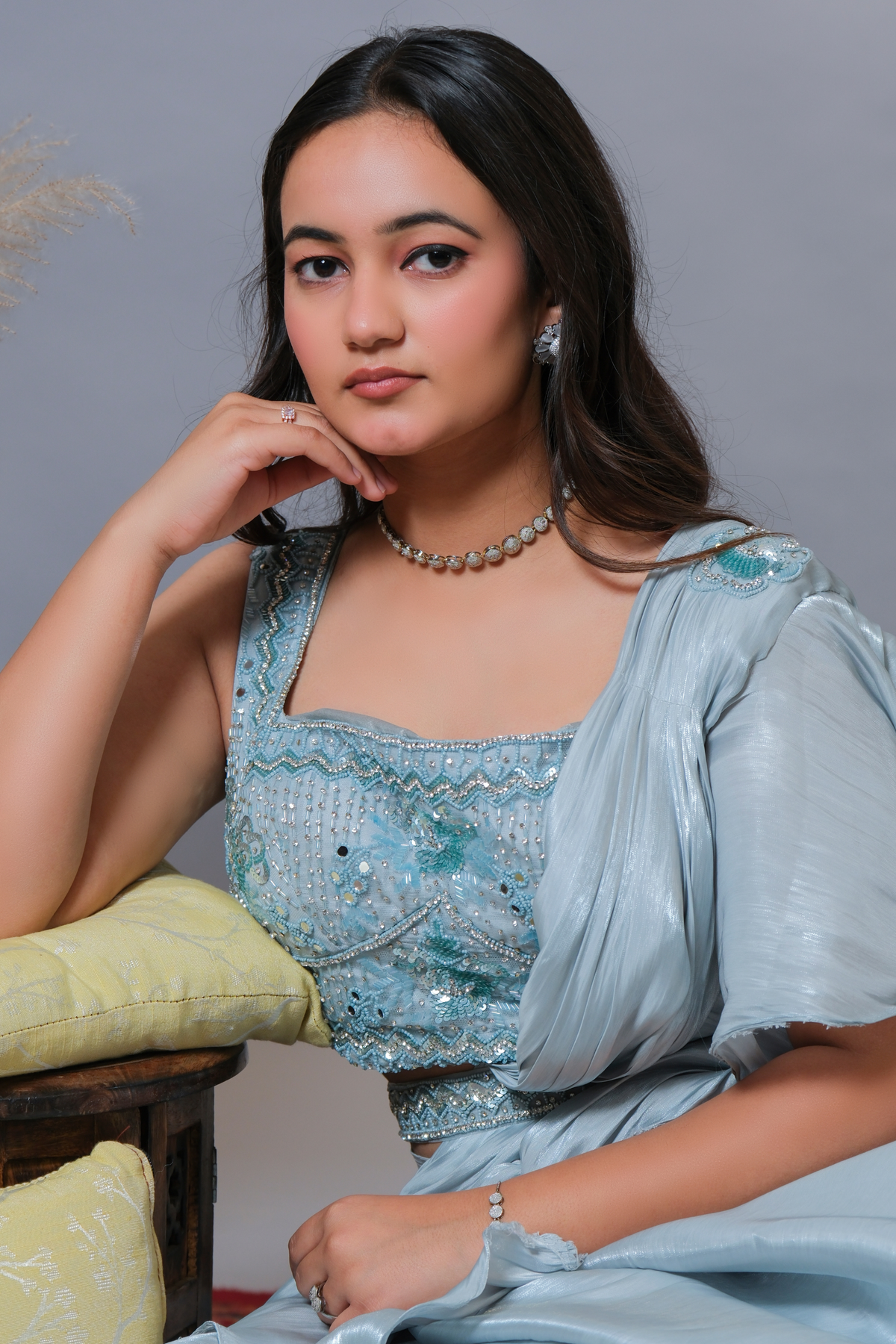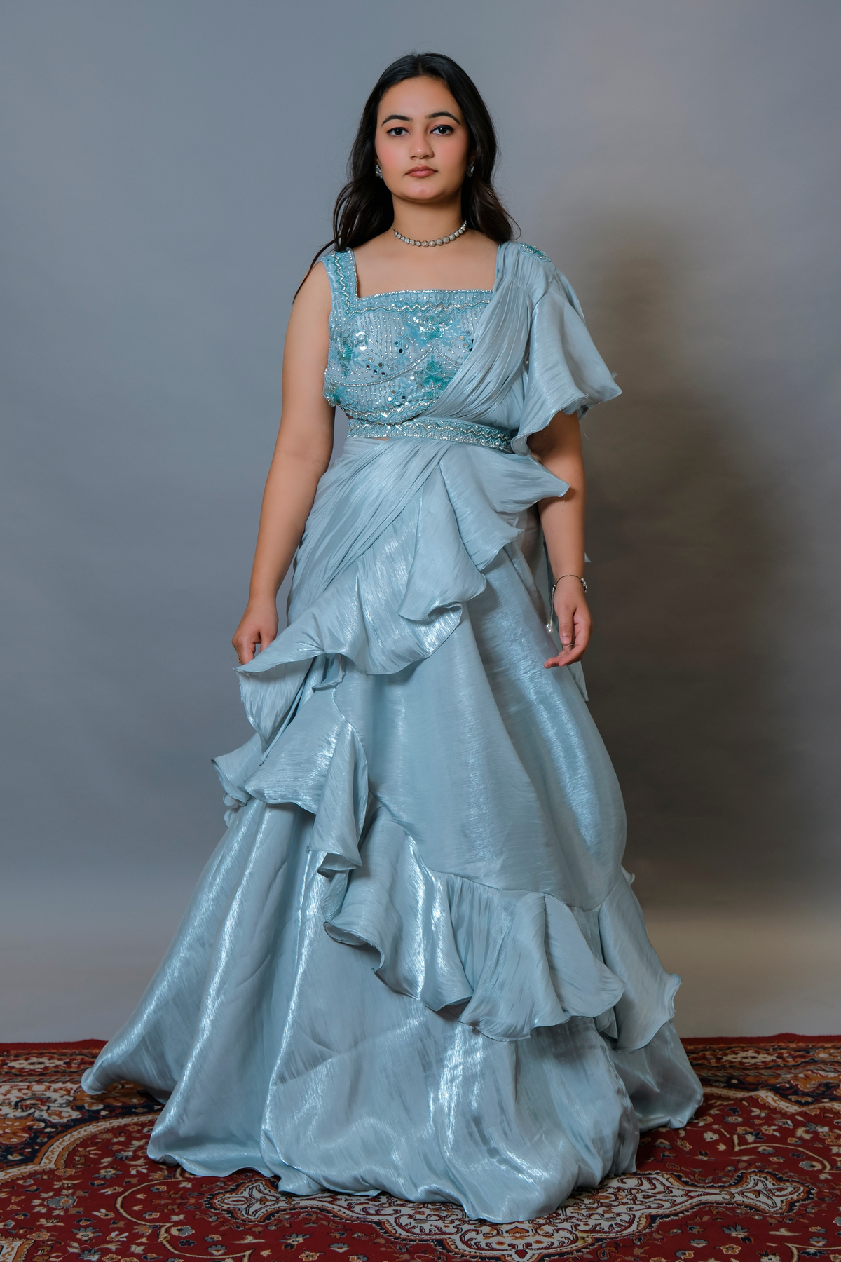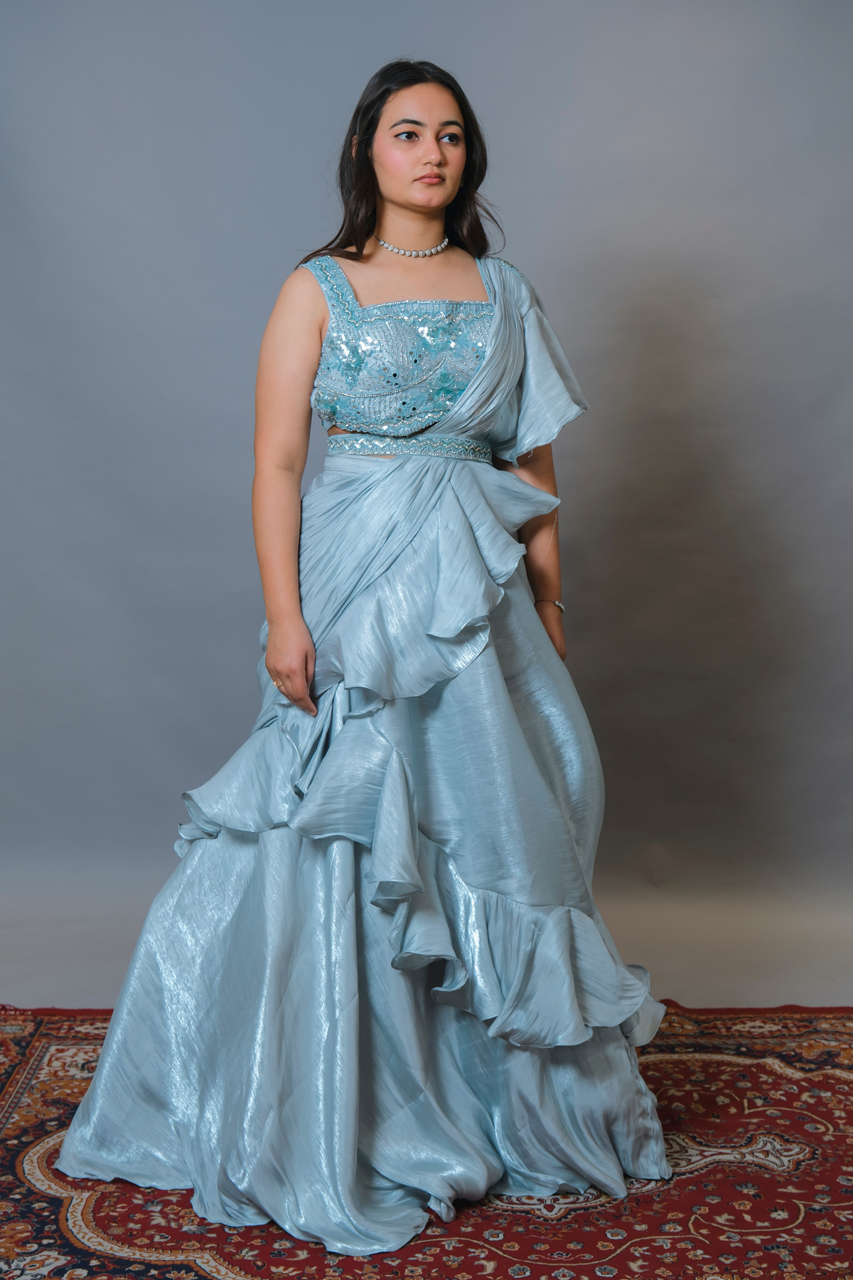 Drape in the cool hues of ice blue lehenga drape with handwork of iceblue and silver cutdana, sequin and beads on blouse and a motif on shoulder, a mesmerizing tale of grace unfolds
