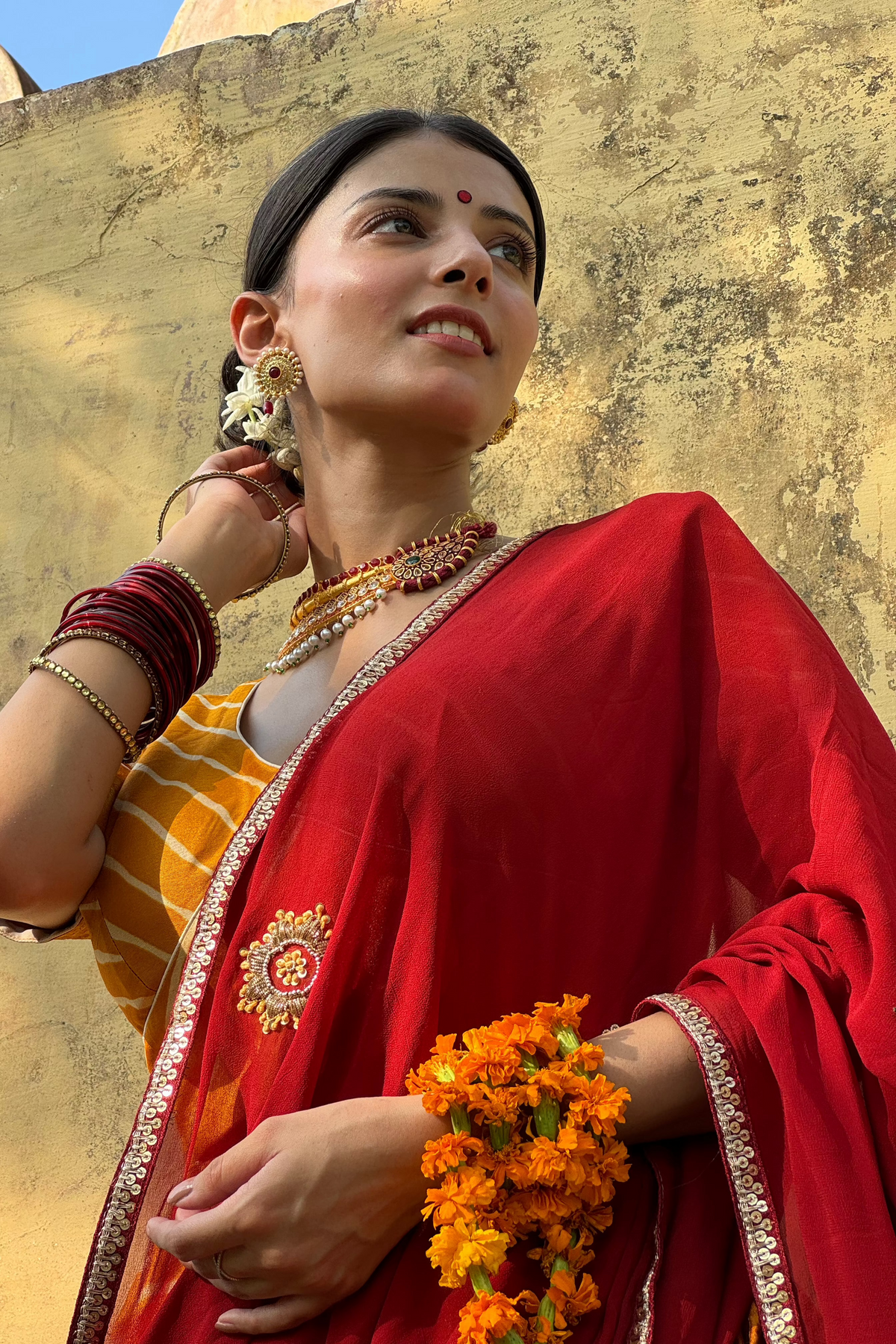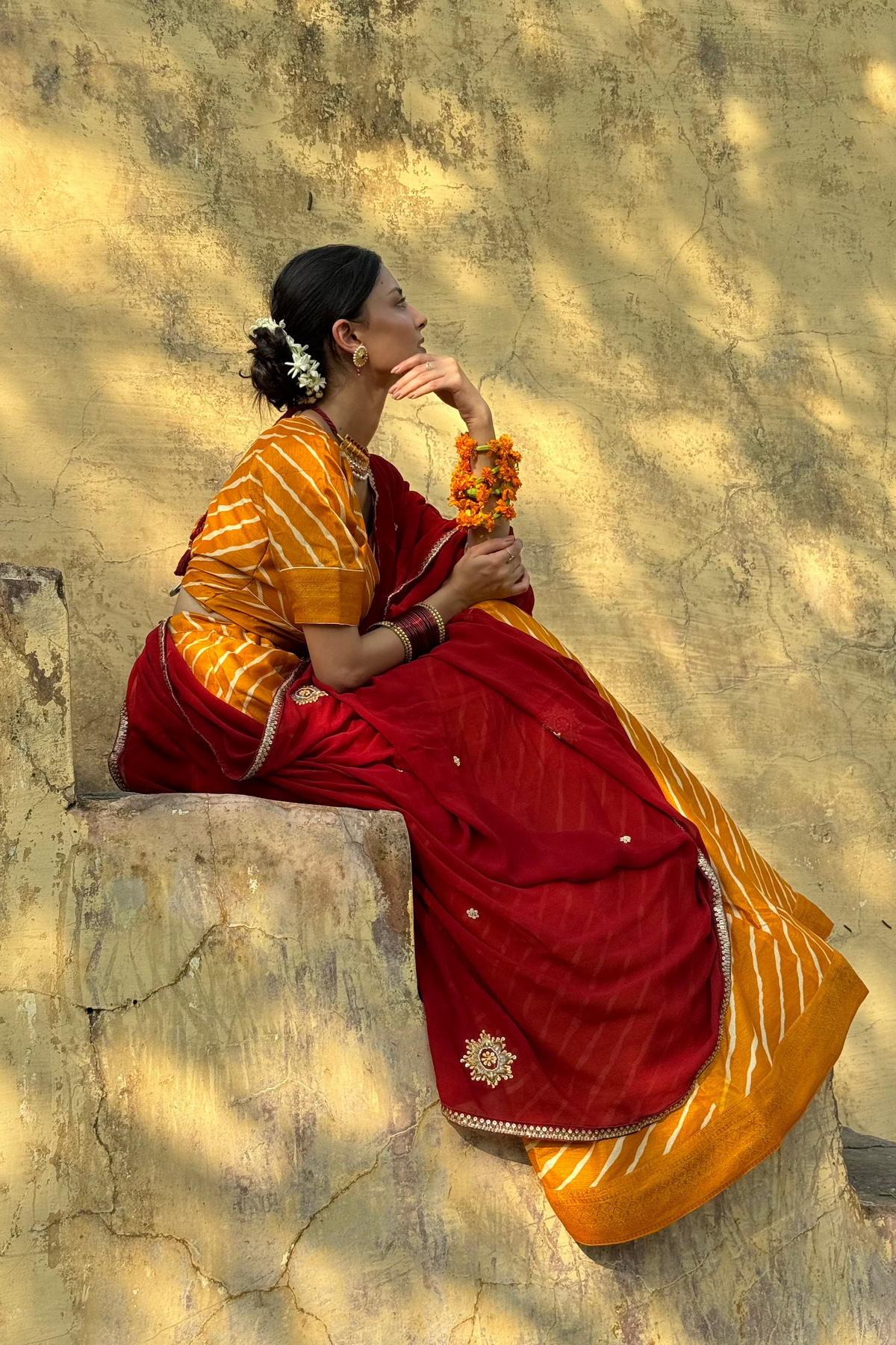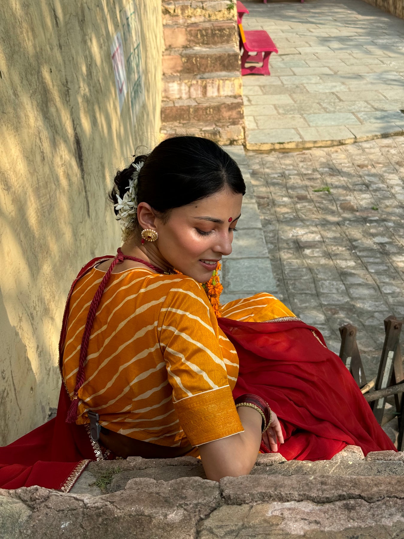The mustard lehenga and blouse is in leheriya print on muslin silk fabric. The lehenga is in kalli pattern and blouse is in sabyasachi design. The dupatta is in georgette fabric and having handwork of resham,zardosi and pearl work. The dupatta is in mahroon fabric with four sided boreders.