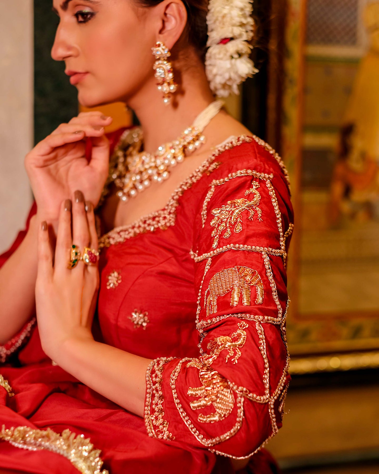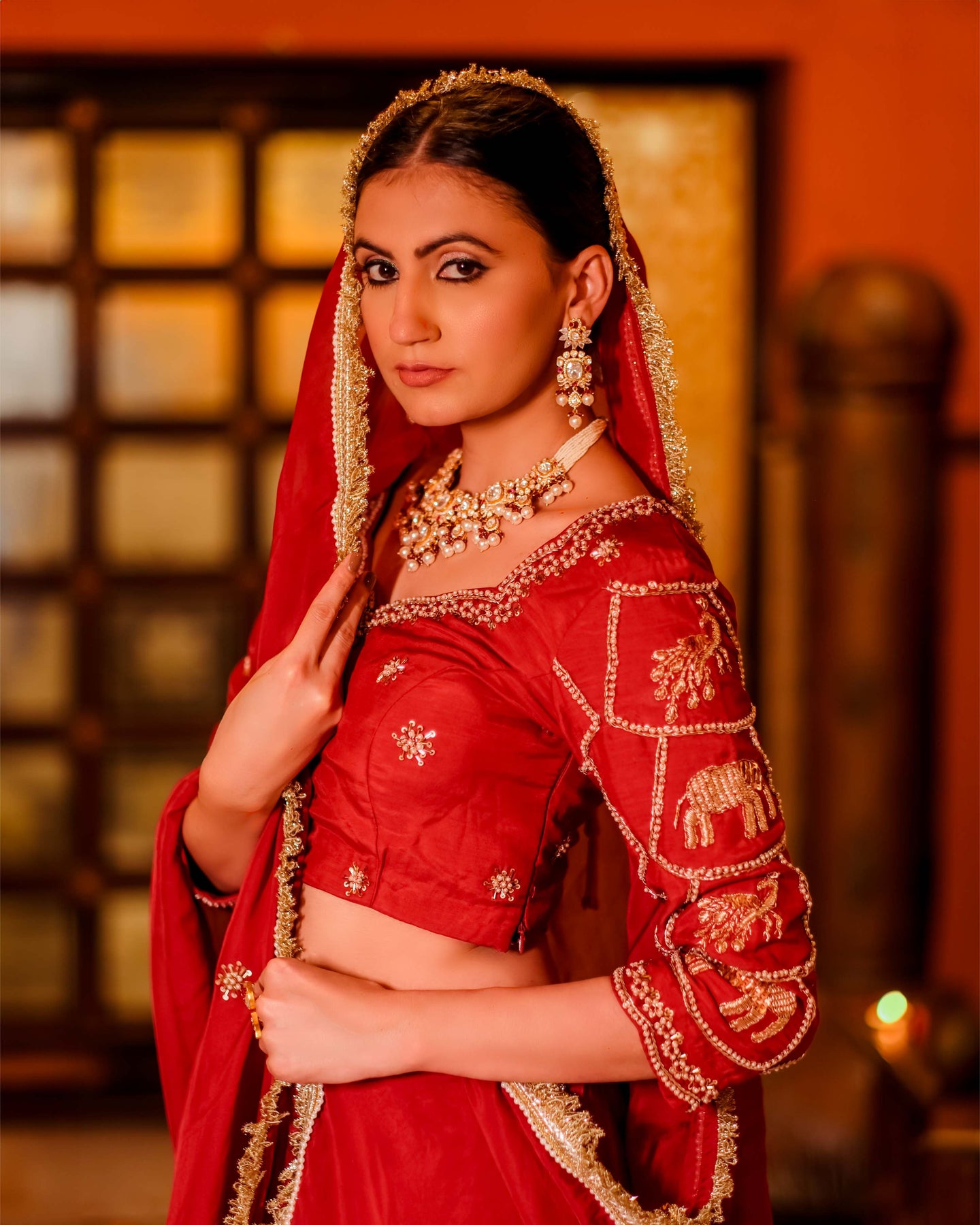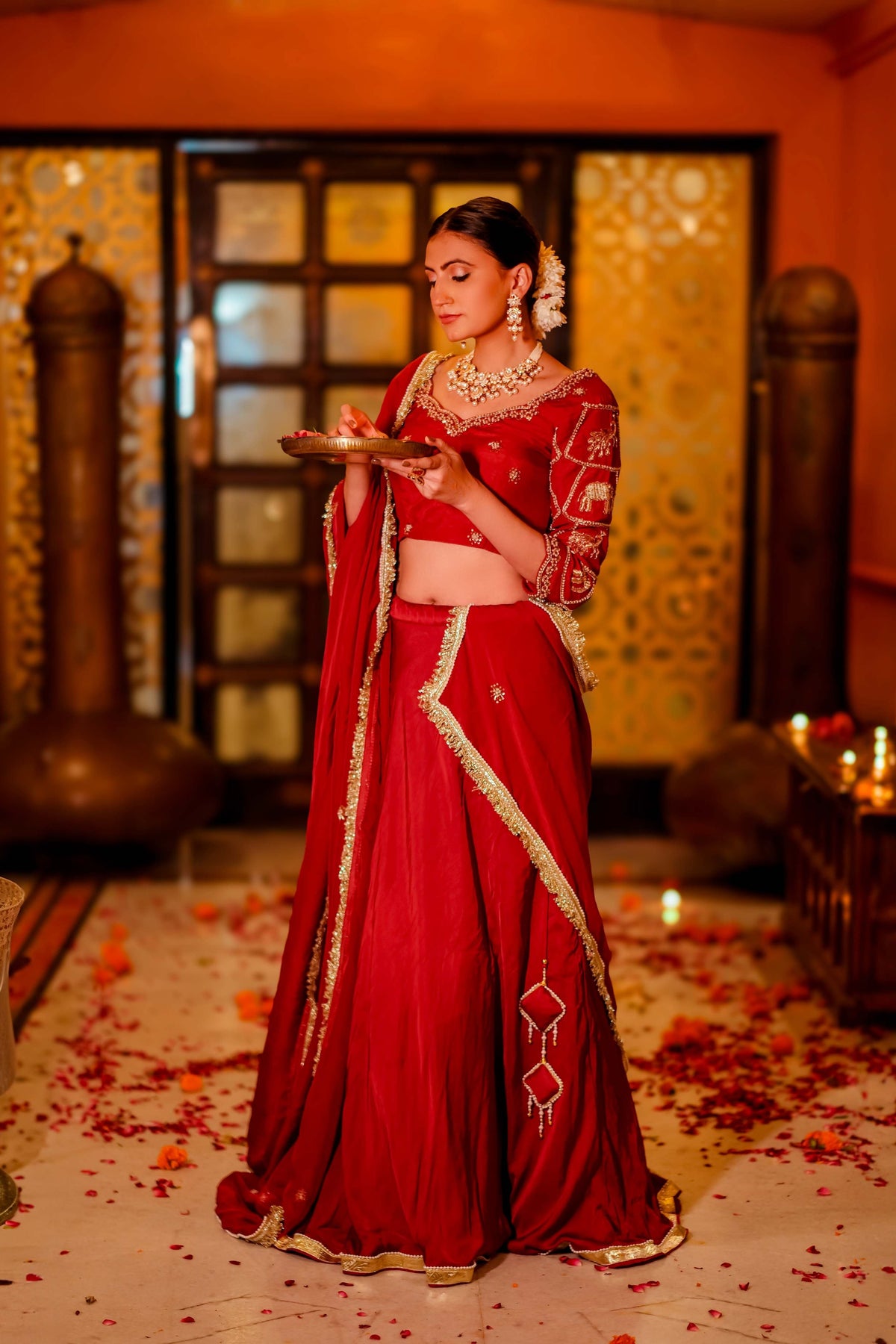 Imagine a stunning lehenga in a rich mahroon hue, radiating elegance and sophistication. The skirt flows gracefully, adorned with intricate borders that adds a touch of artistry. The craftsmanship highlights the intricate details on the sleeves of the blouse with traditional patterns that draw the eye. Having handwork of zardosi,sequins,pearl and thread on the sleeves. The dupatta is in organza silk fabric havinf hand embroidery butties on it with borders on it.