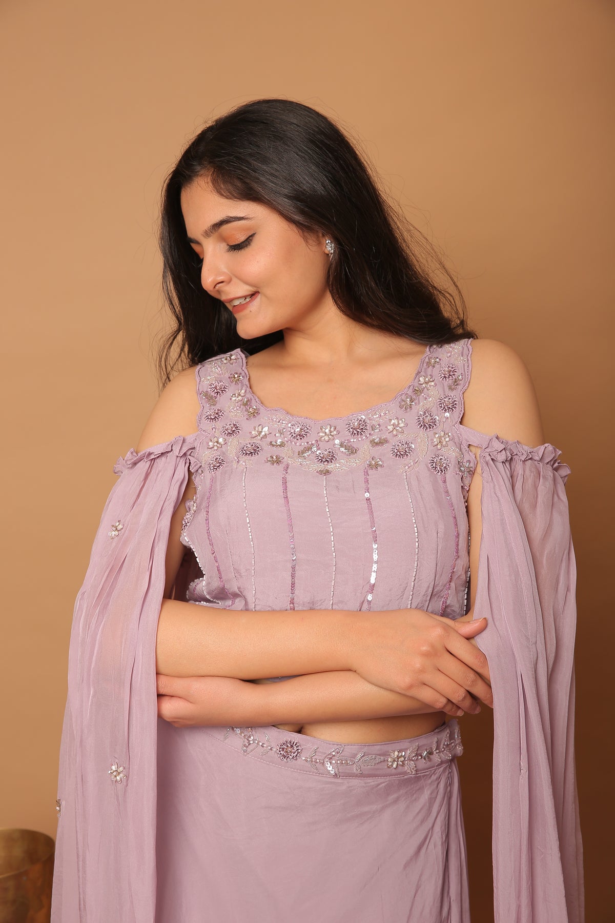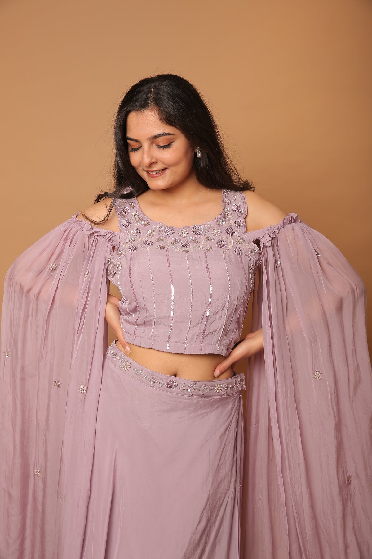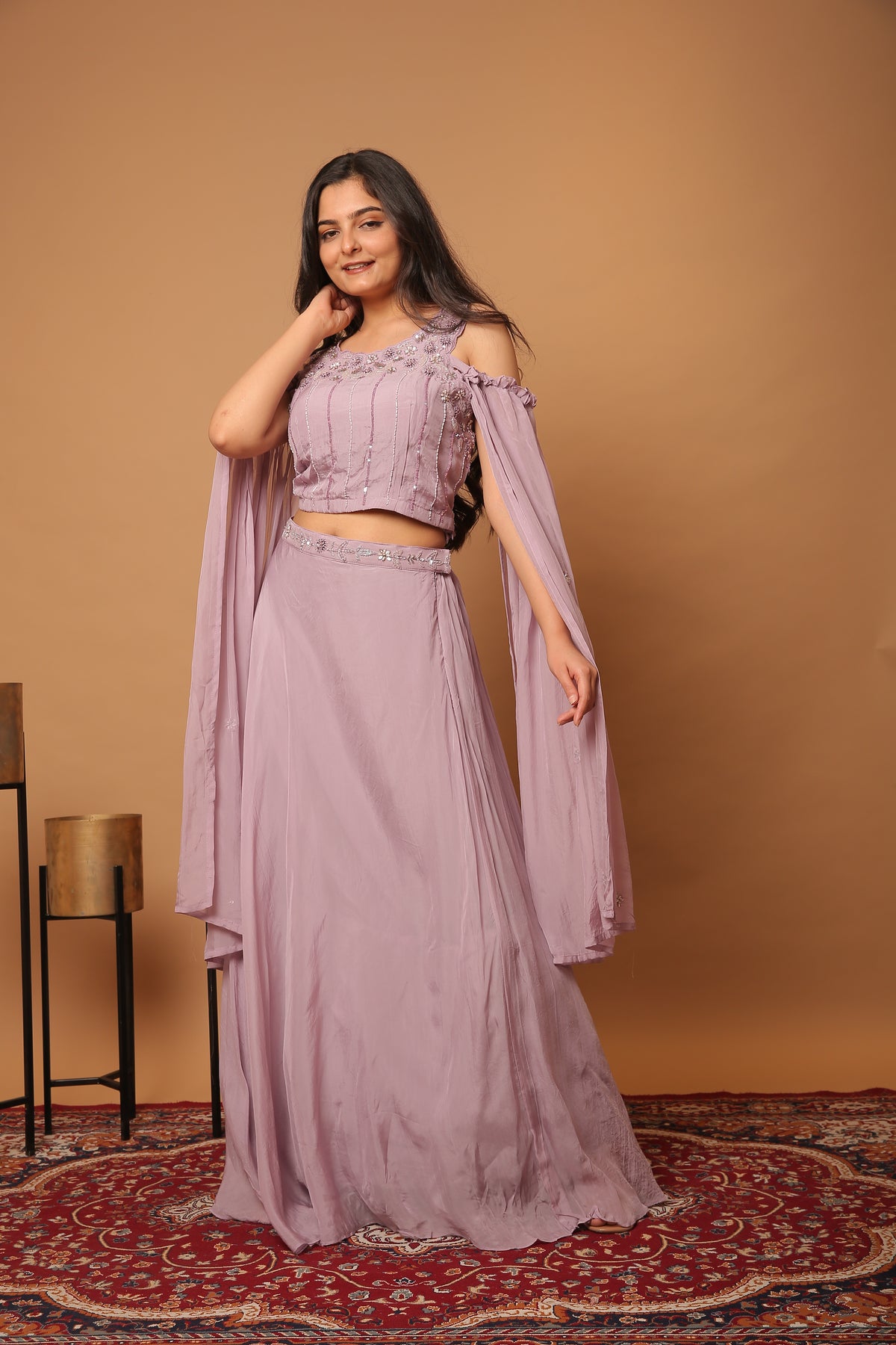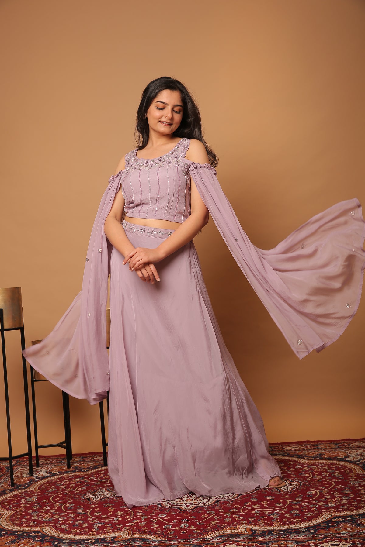 Elegance meets style with mani jaipur's plum croptop and skirt. Crafted from luxurious organza and silk, adorned with intricate handwork of pearl, cutdana, and sequins. The unique cold shoulder design and attached flowy sleeves redefine fashion.