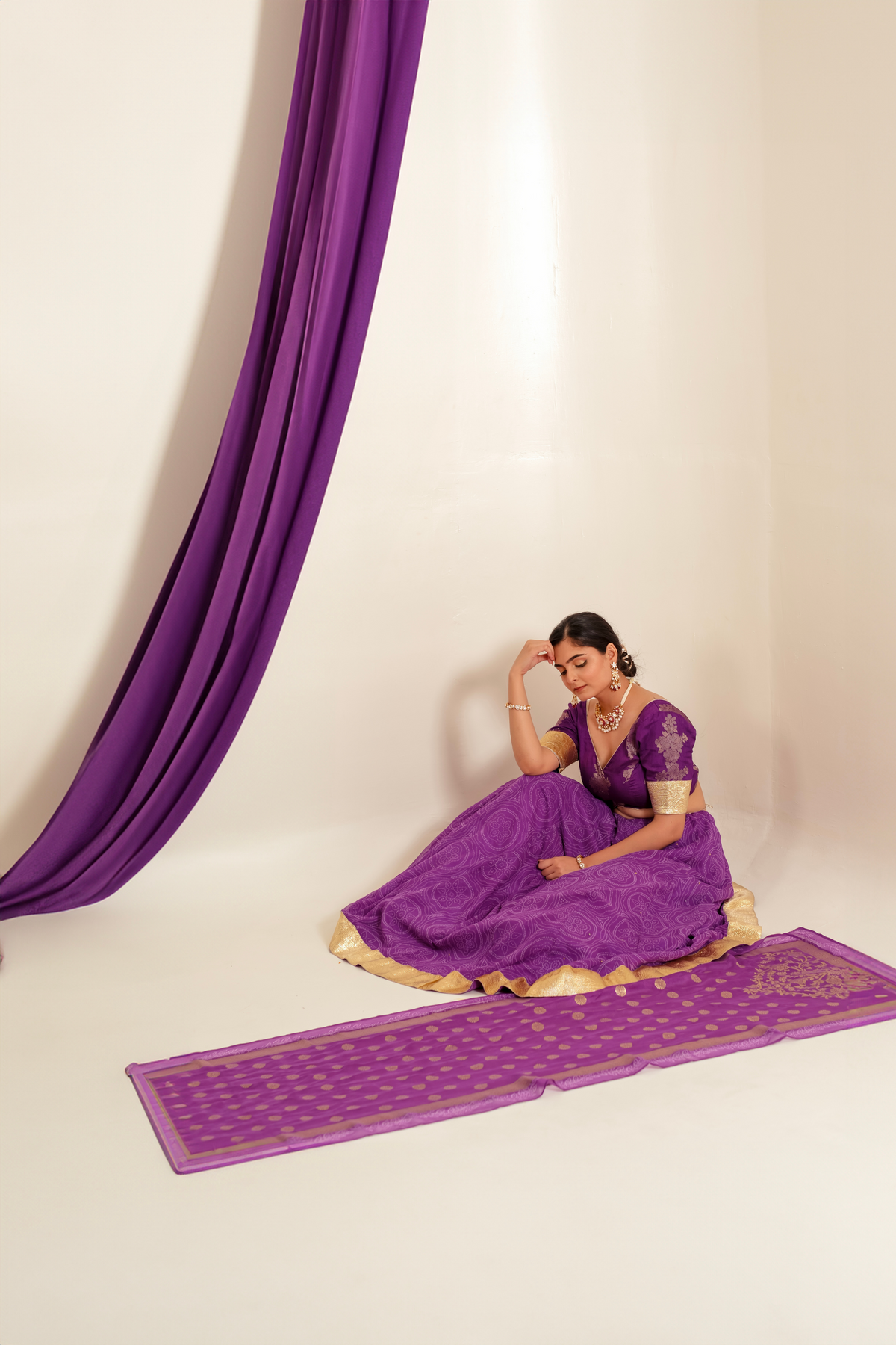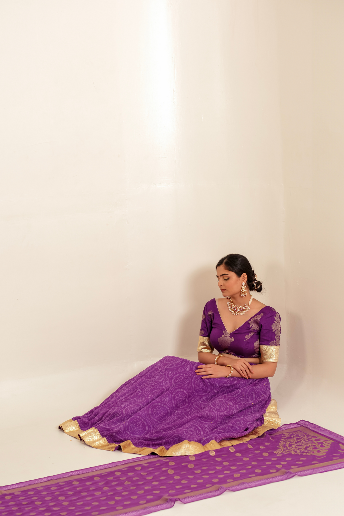 Georgette bandhej lehenga embellished with exquisite golden gota lappa work that adds a touch of opulence and intricacy. The lehenga’s flowing silhouette showcases, while the shimmering gota lappa detailing creates a beautiful contrast.This is paired with a luxurious Banarsi dupatta, rich in traditional motifs and adorned with golden borders, this ensemble exudes elegance