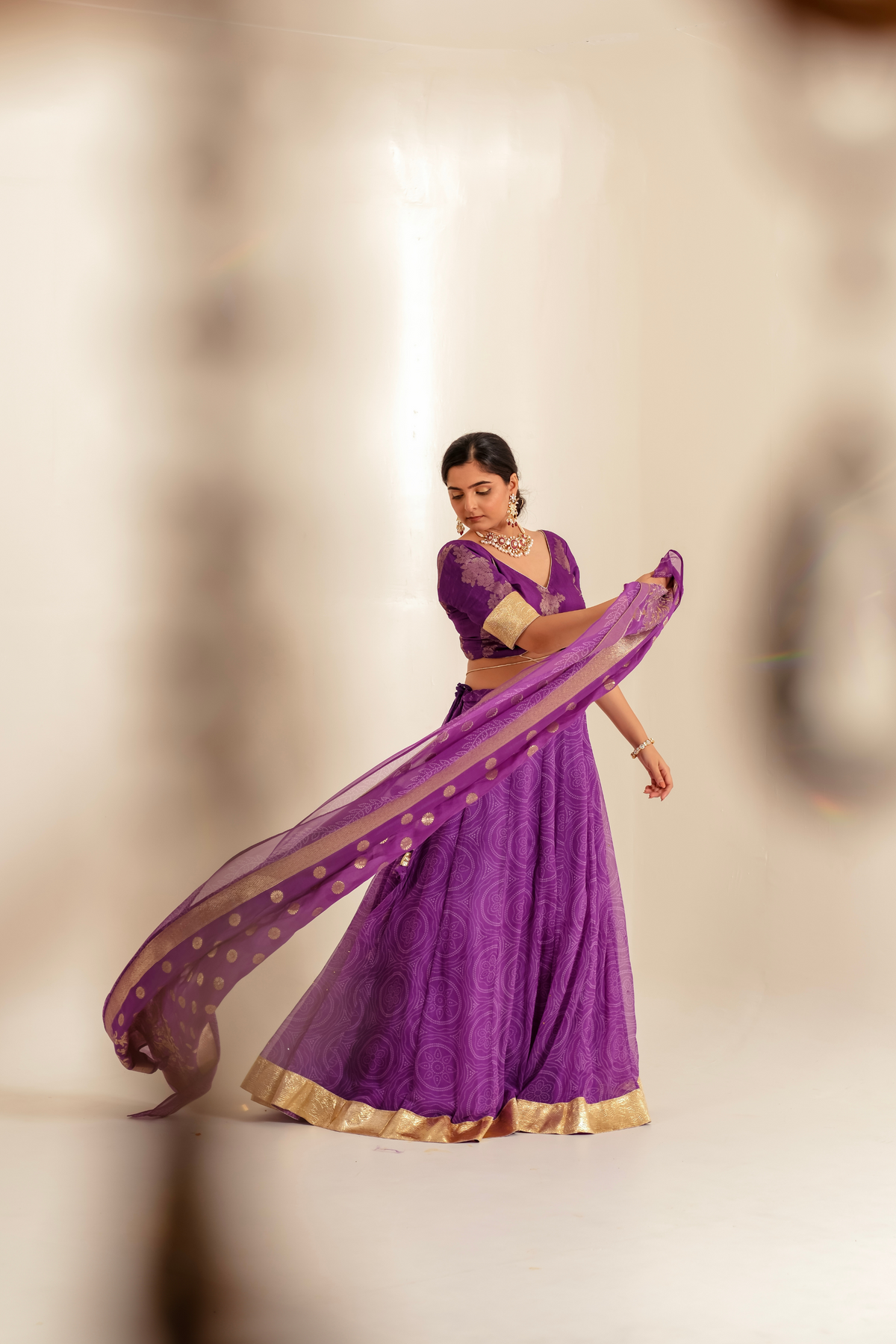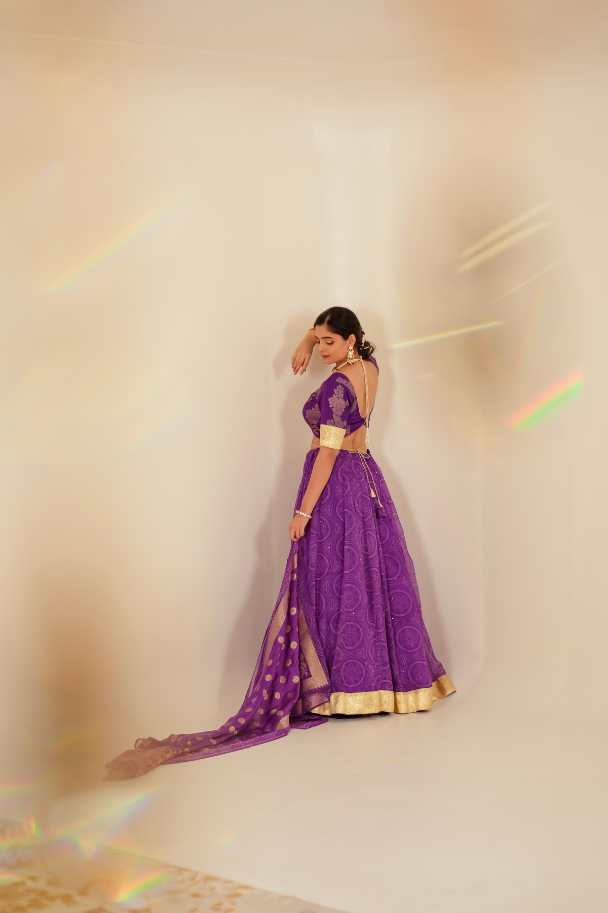 Material: Lehenga is in georgette fabric blouse is in dola silk and dupatta in dona banarsi silk.