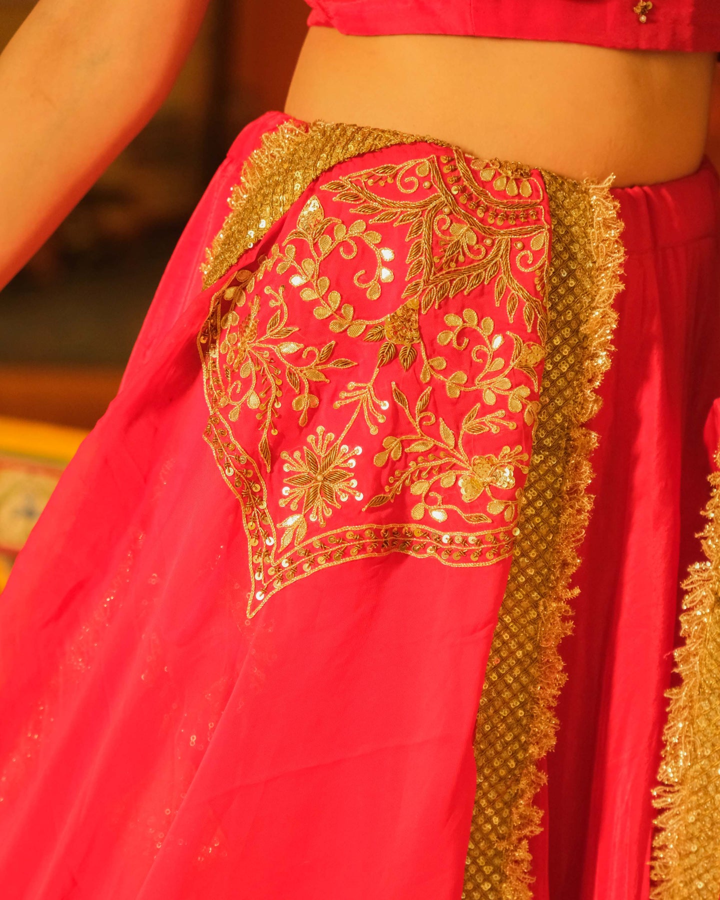 Material: Pure crepe fabric for lehenga and blouse. Organza silk for dupatta.