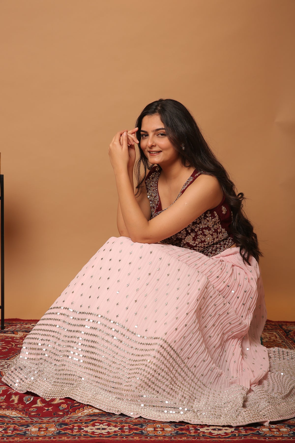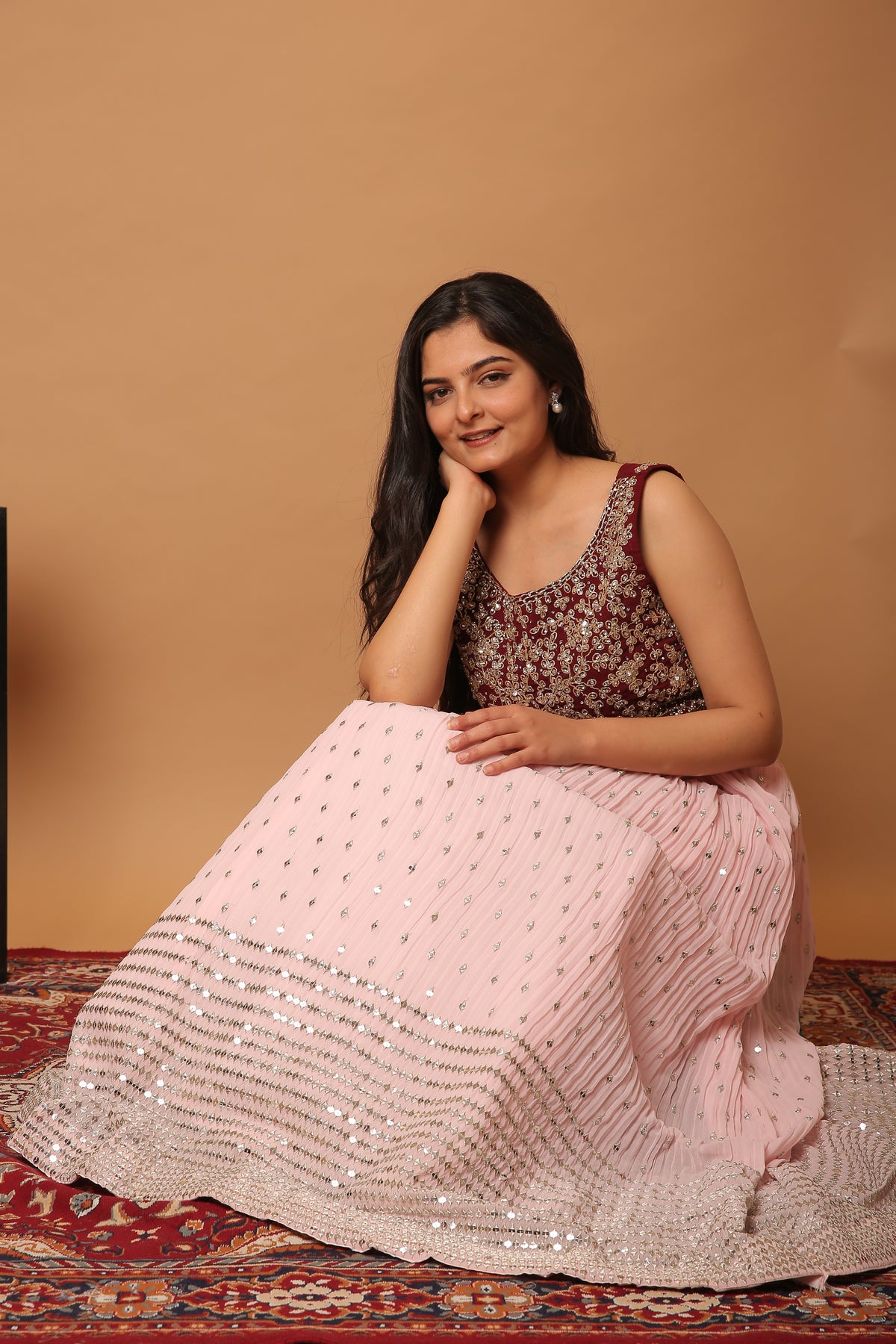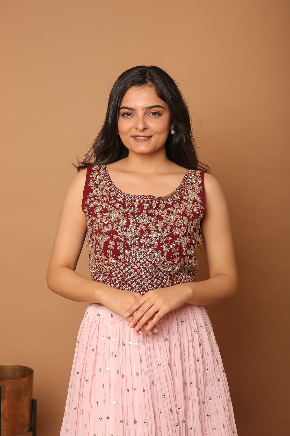 Rosewood pink crop top with pastel pink pleated skirt