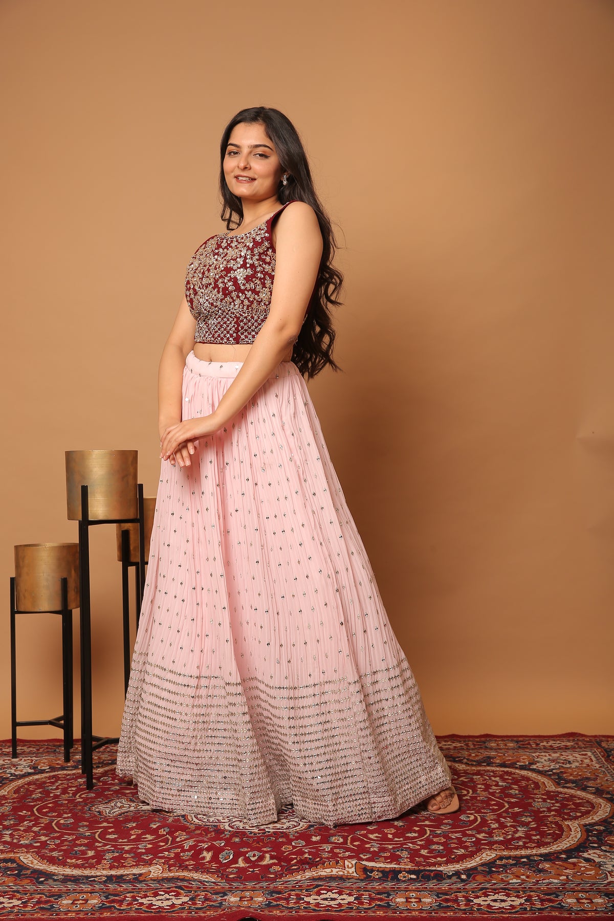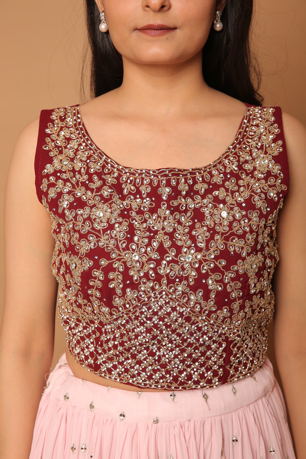 Embrace the perfect blend of style and elegance with must have Rosewood pink crop top with pastel pink pleated skirt made on georgette fabric with sequin and aari silver work on crop top.