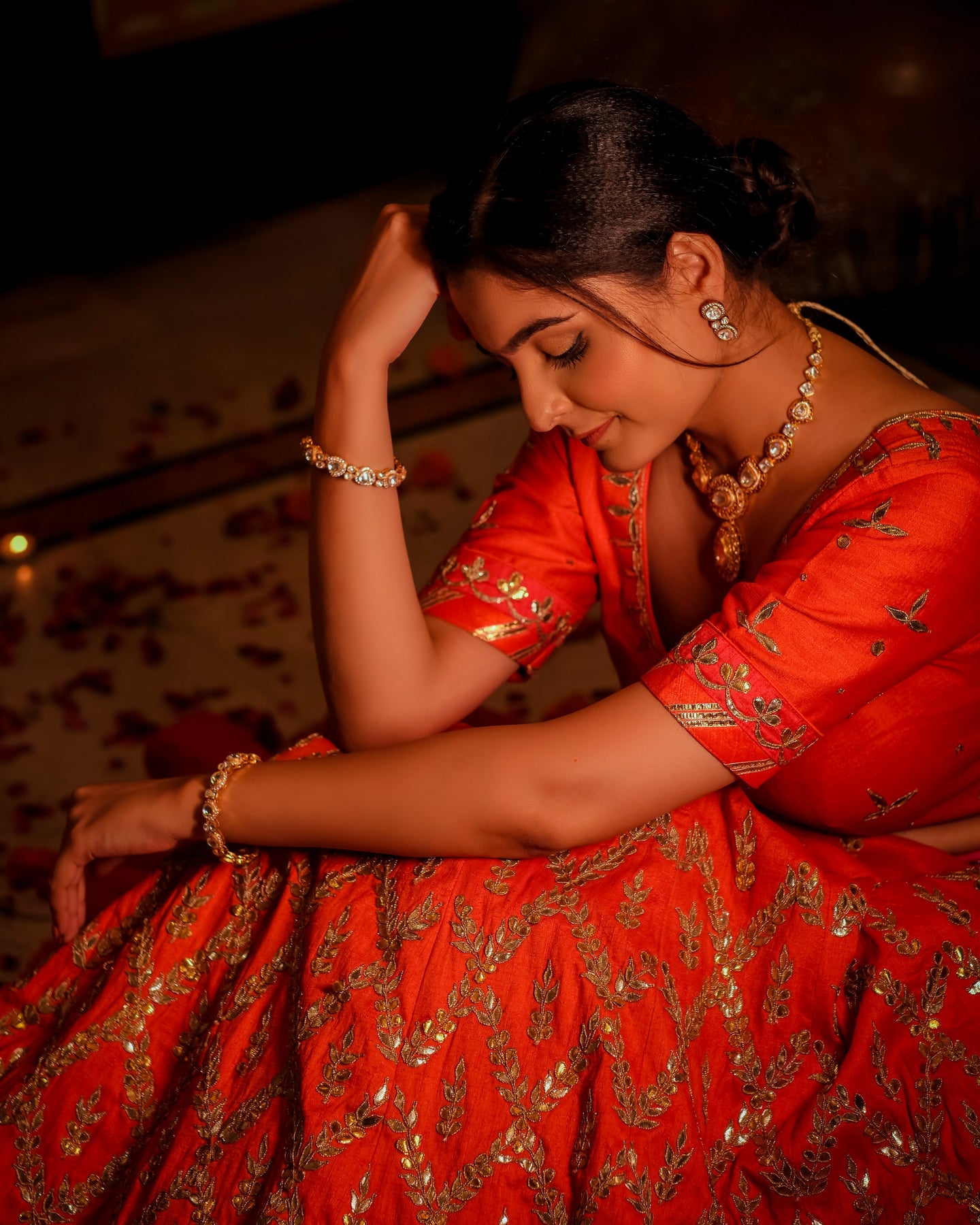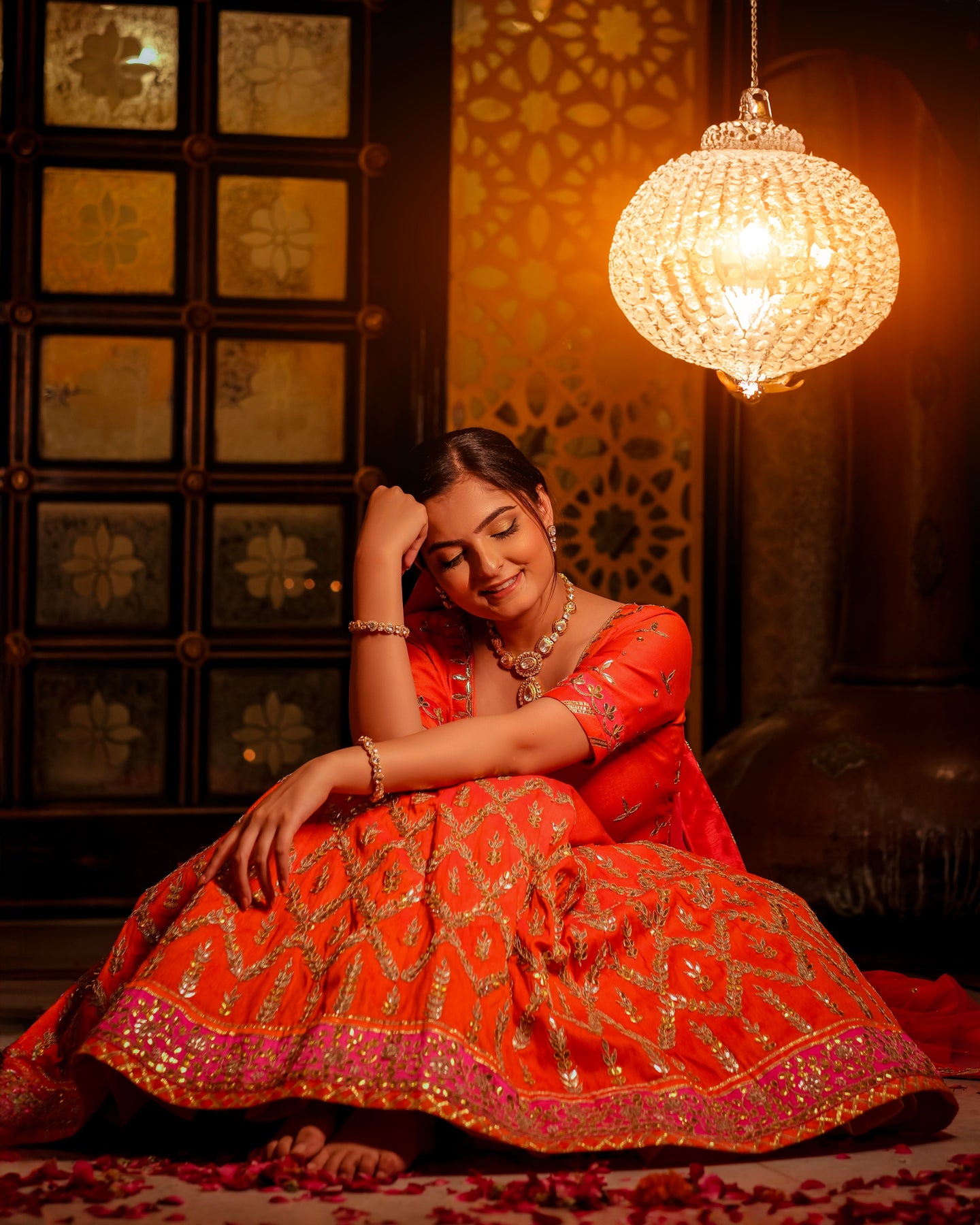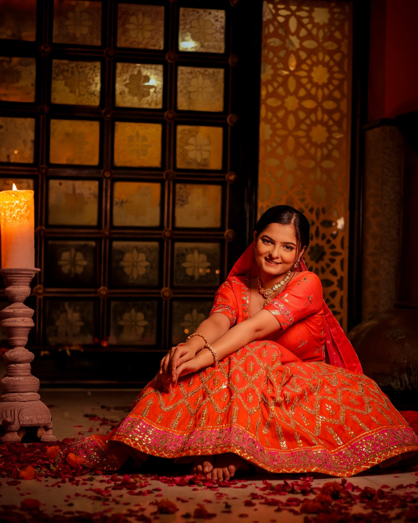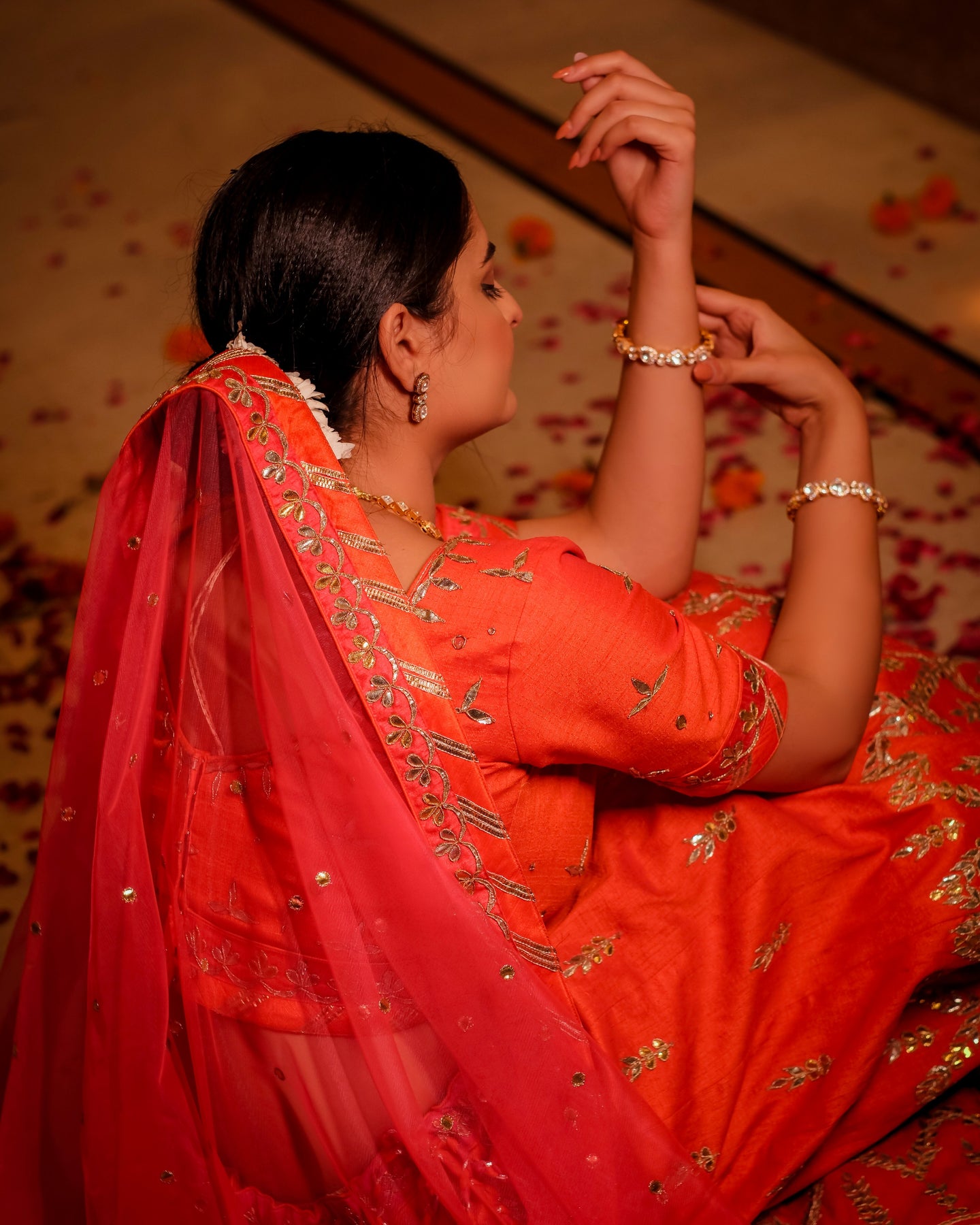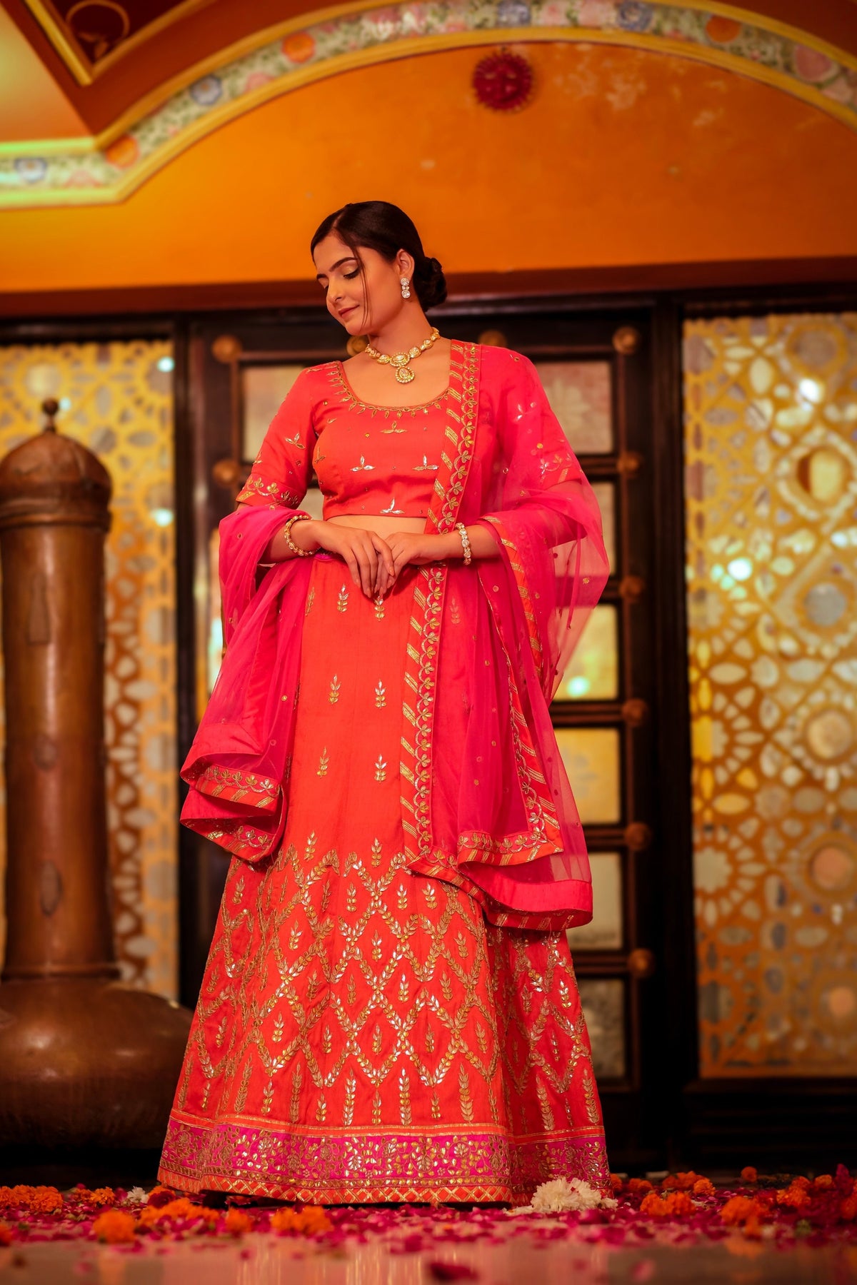 This lehenga is in pure raw silk fabric with having gota patti handwork on it. This comes with same work blouse and a dupatta with handwork butties on all over duptta with four sides borders.