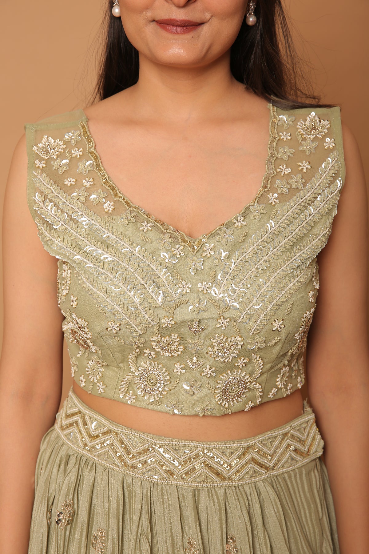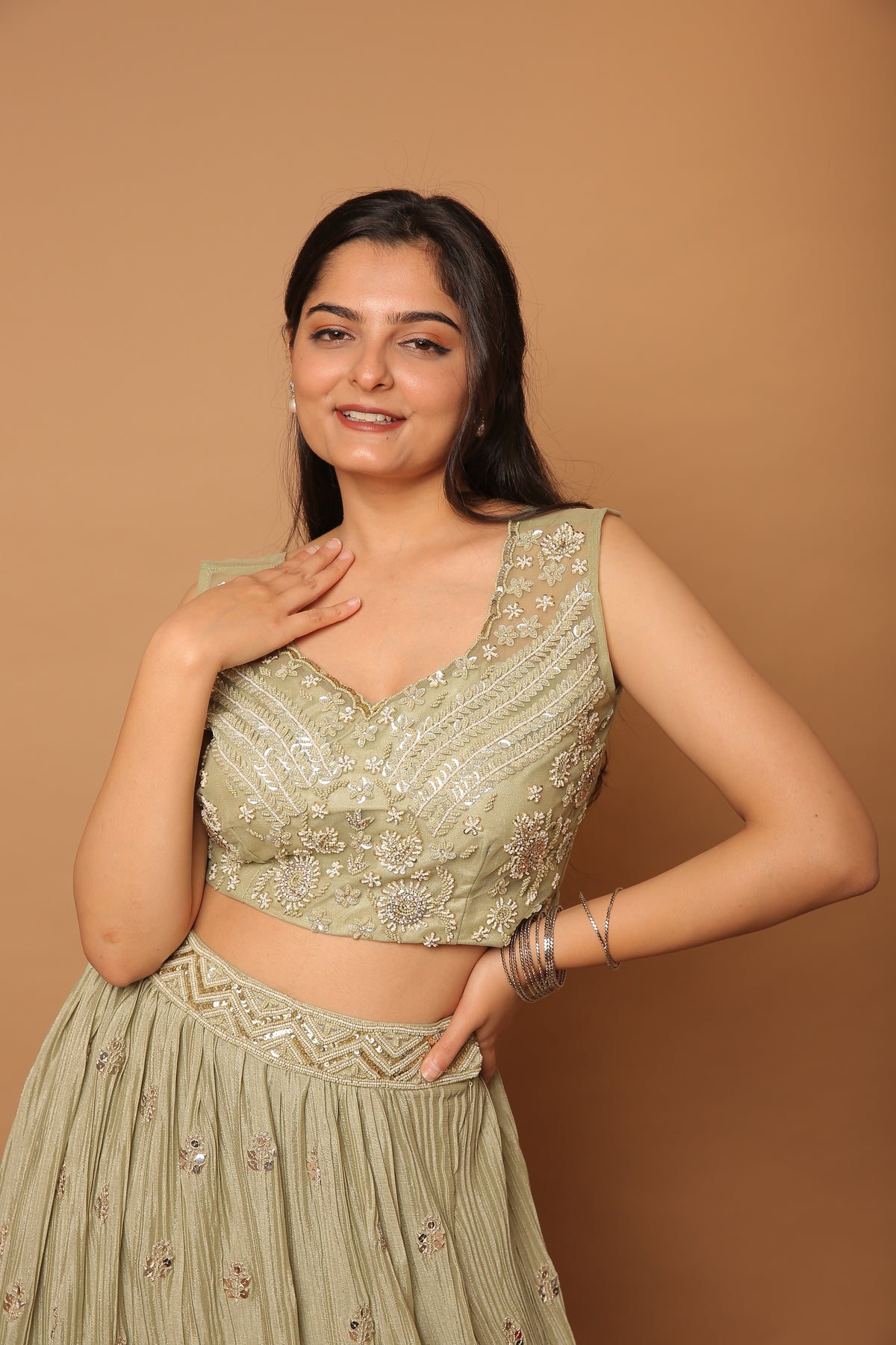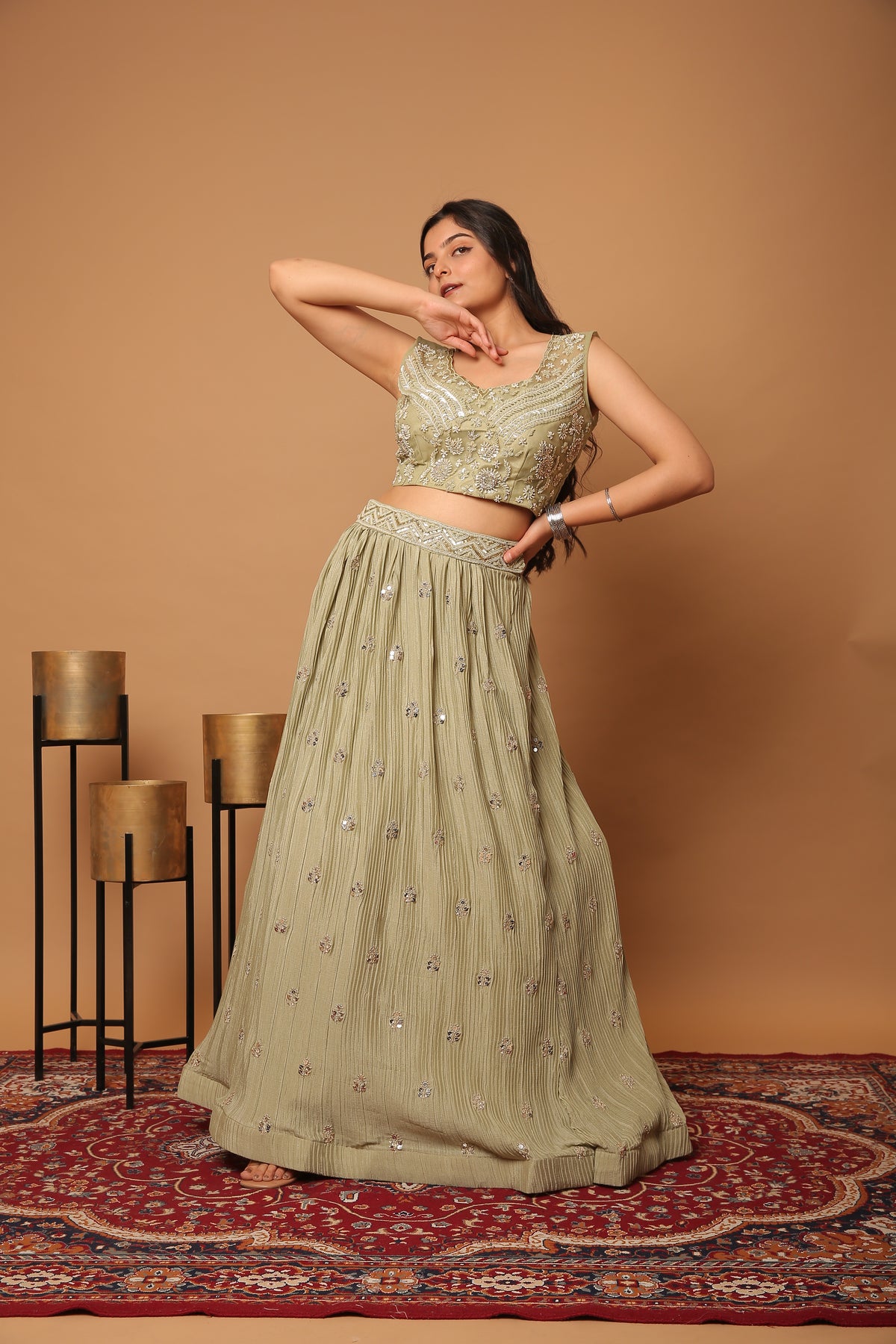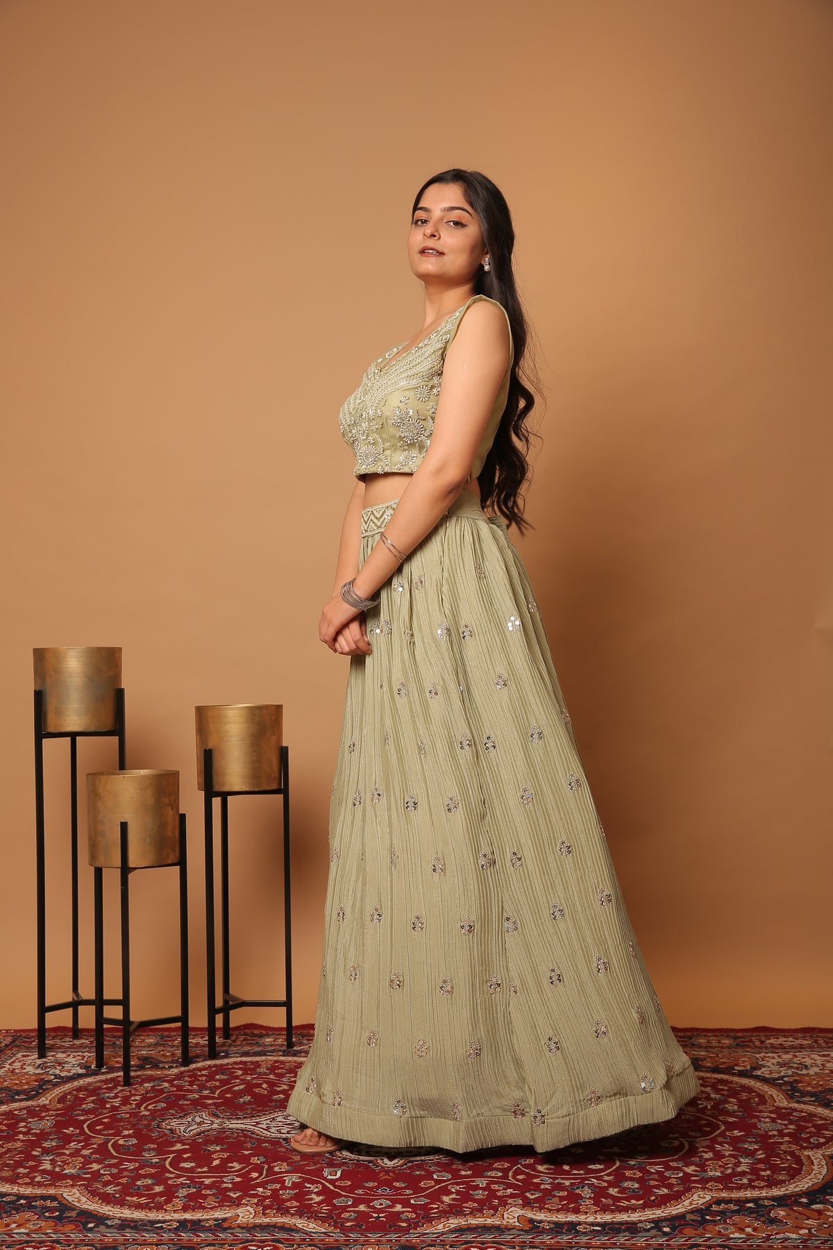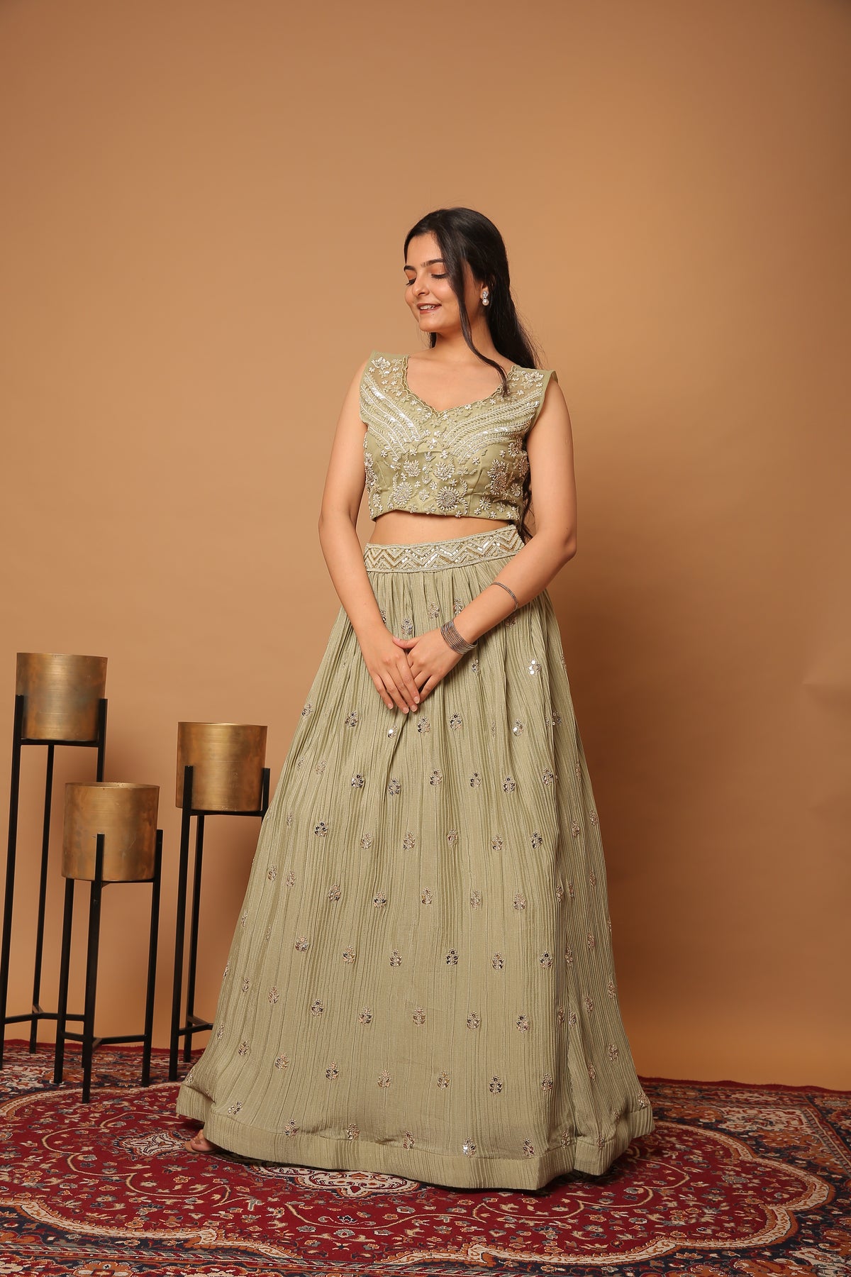 Discover the beauty of Mani's ethinic lehenga. Thi slovely pleated skirt is carefully handmade with love, adorned with pearls, traditional enbroidery (Kasthi), and sparkly sequins. It's designed to make your special occasion even more memorable. The attention to detail in each pleat will leave you amazed.