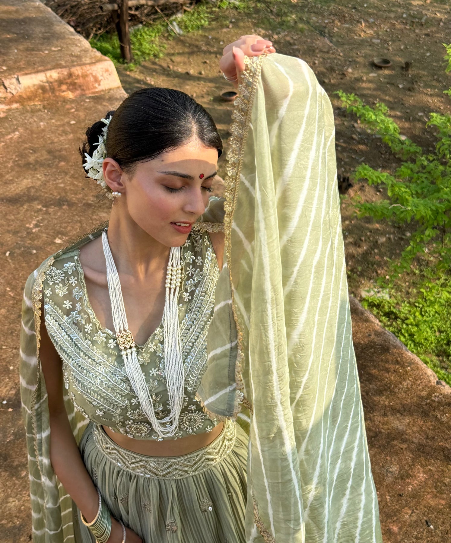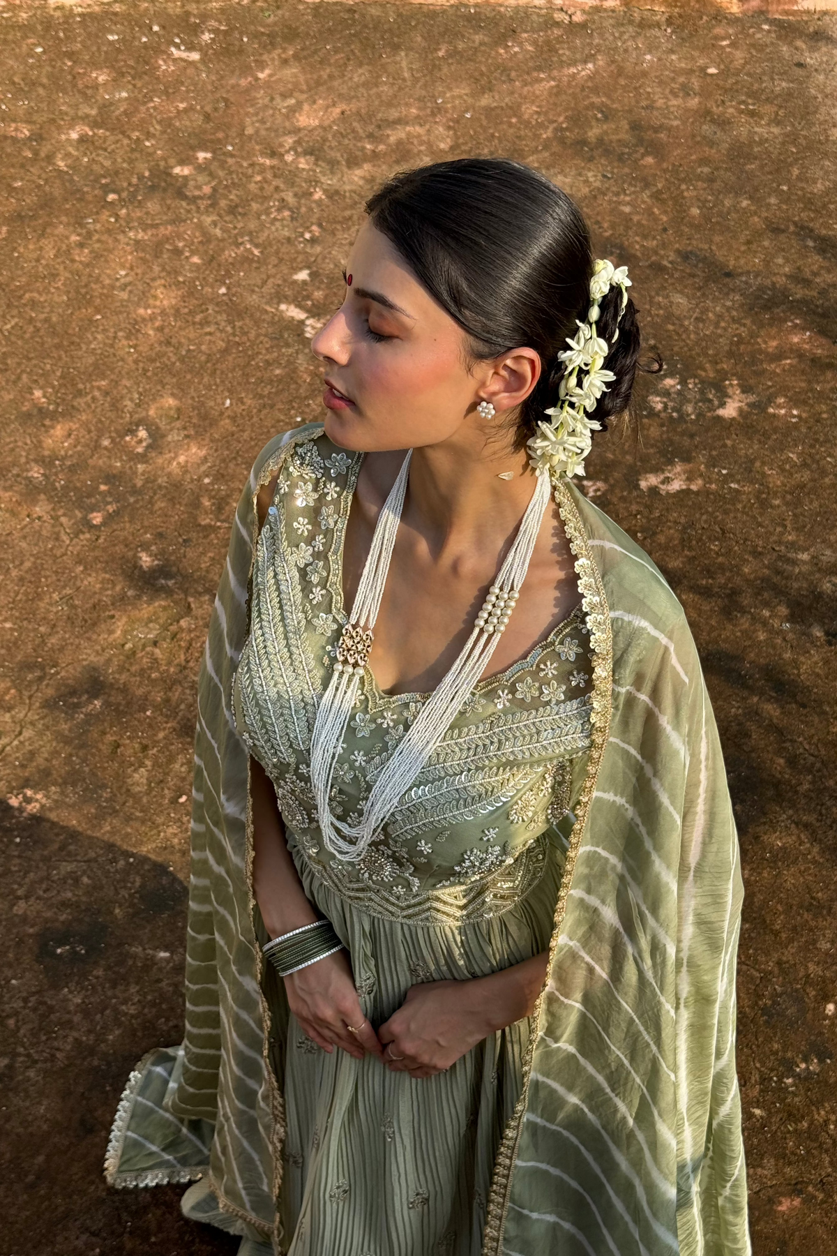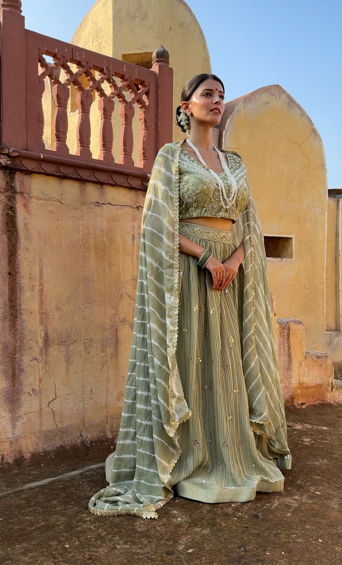 Sage green lehenga with pearl work blouse and leheriya dupatta