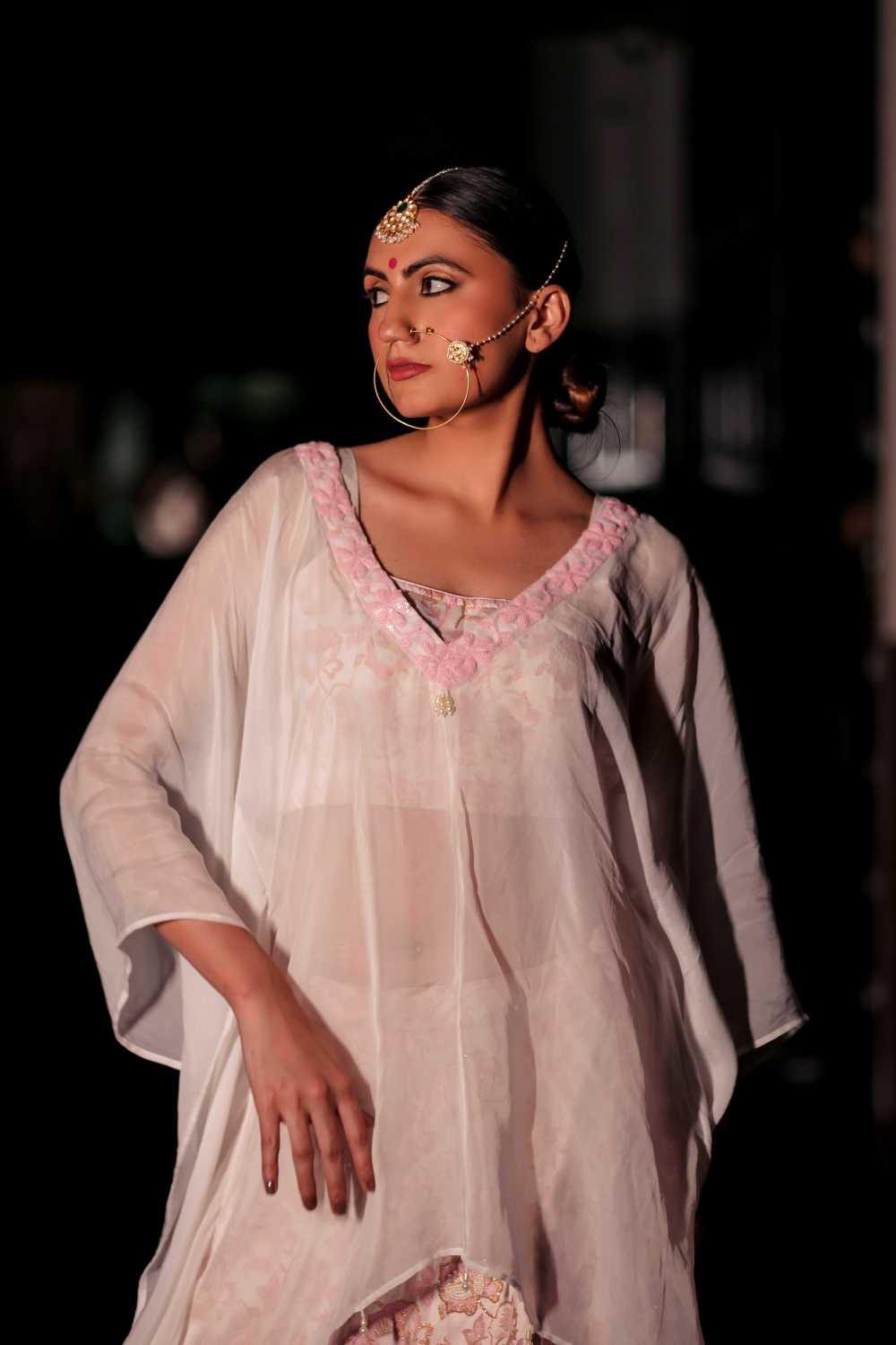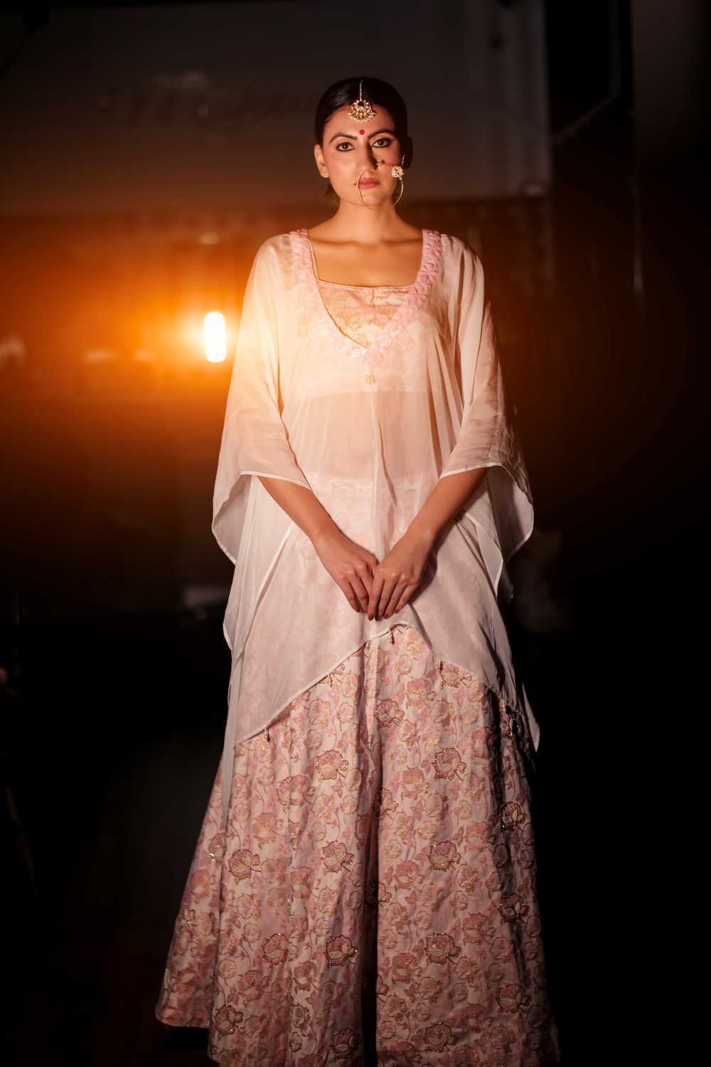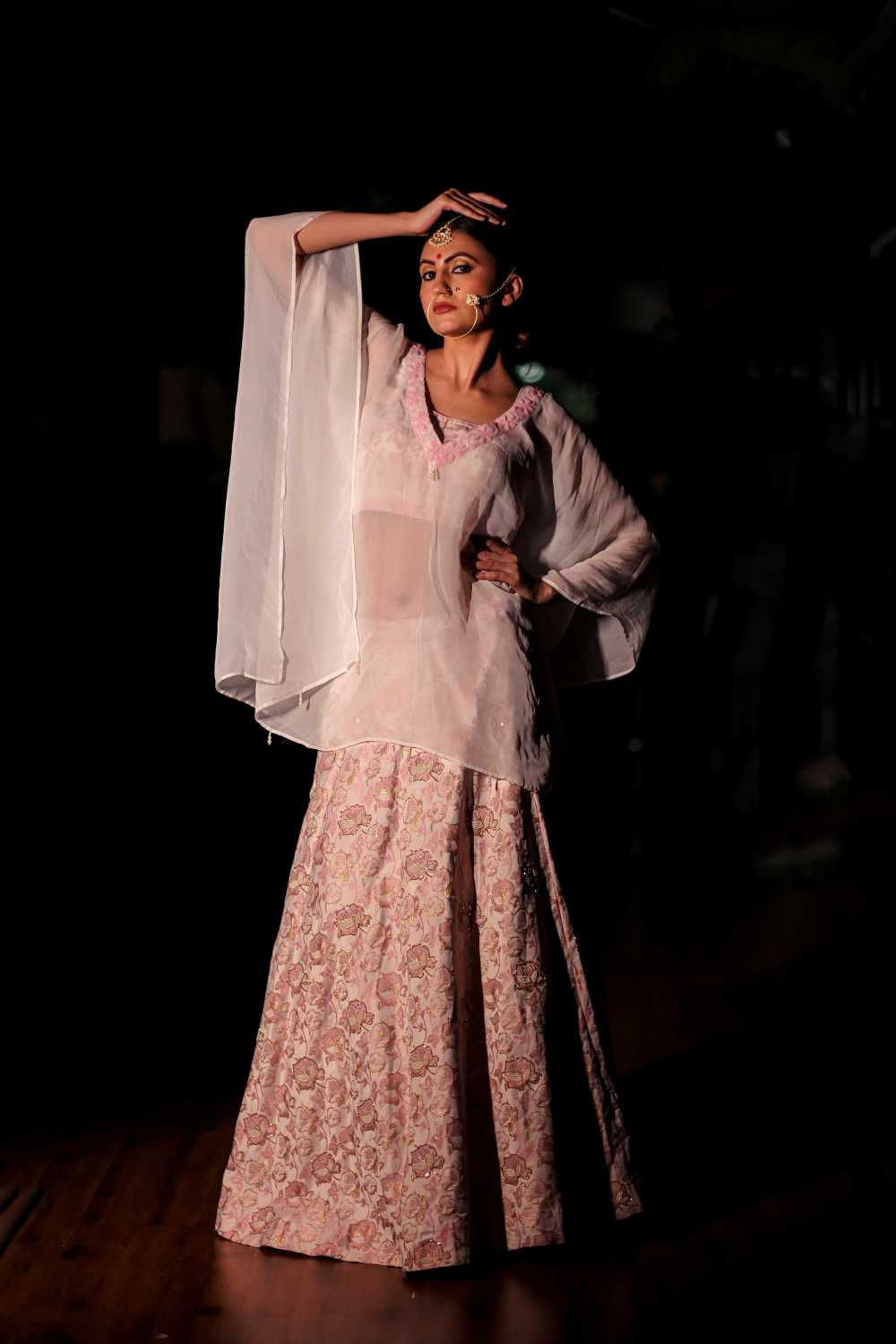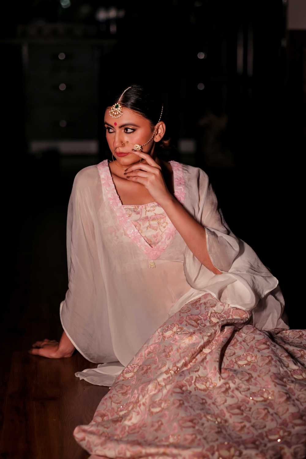 Imagine a stunning floral print lehenga featuring vibrant patterns, adorned with delicate cutdana and pearl work for an elegant touch. The fitted bustier highlights your silhouette beautifully.Layered over this, a white organza kaftan drapes gracefully, adding a light and airy vibe. Making it ideal for daytime events or garden parties.