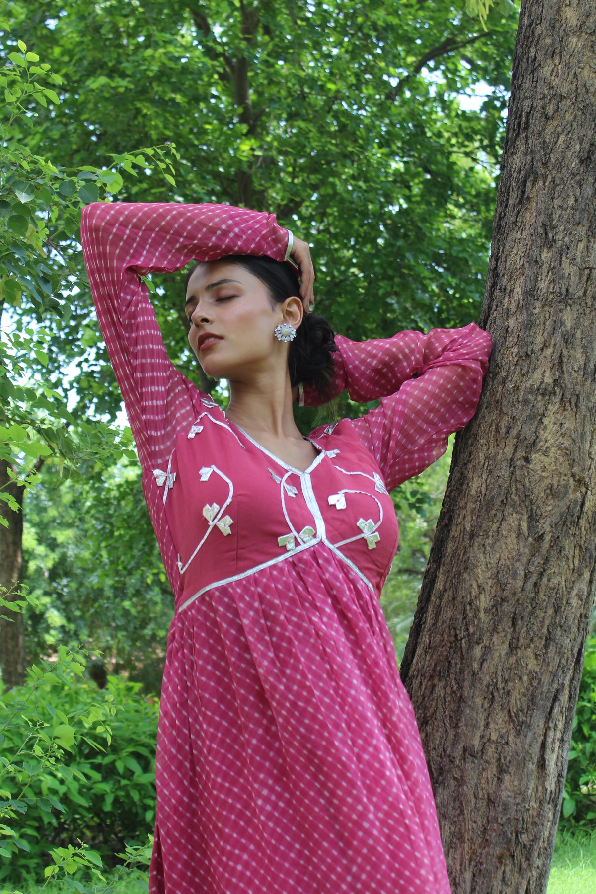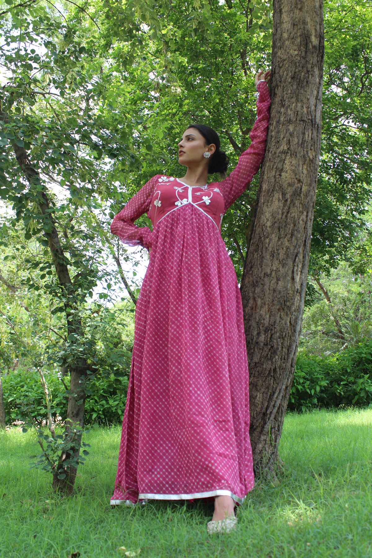 The dress is in pure georgette fabric having kaccha gota silver work on the body part of gown. The dress is having full chuddi sleeves and V neckline and in a straight with gown.
