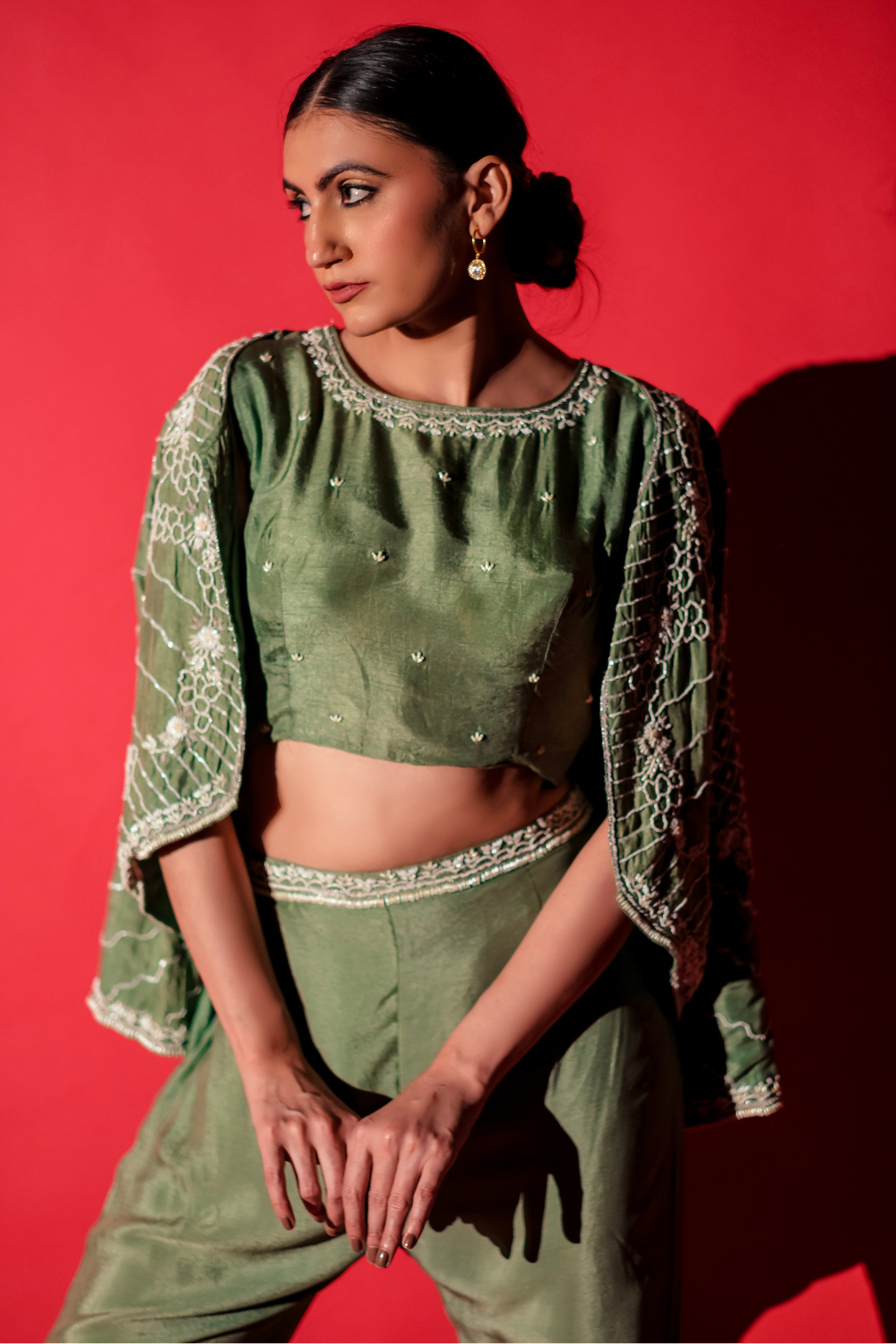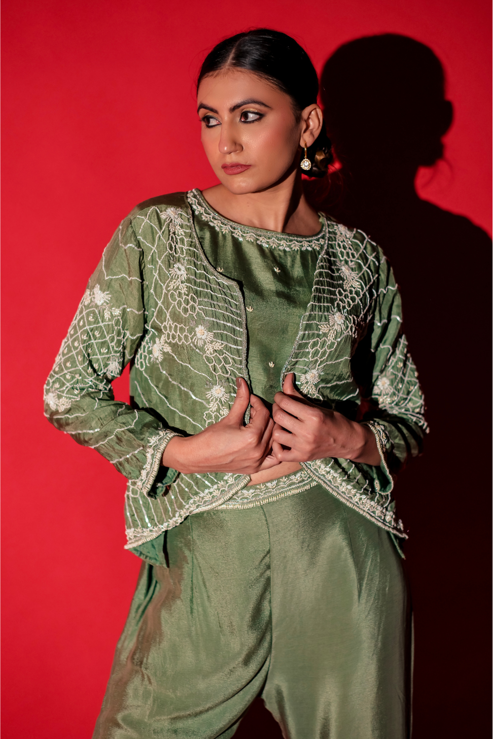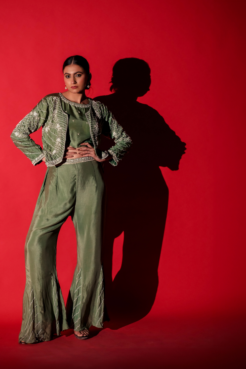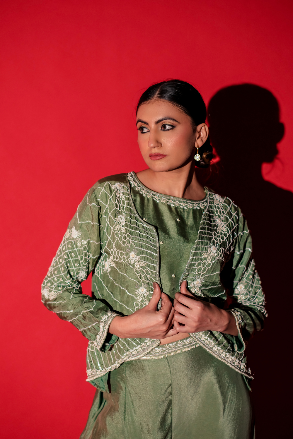 This stunning sage green jacket features intricate pearl work that adds a touch of elegance and sophistication. Paired with a chic bustier and flowy sharara pants, this ensemble beautifully blends traditional craftsmanship with modern style, making it perfect for any festive occasion. The soft color and delicate details ensure you’ll shine with grace and poise.