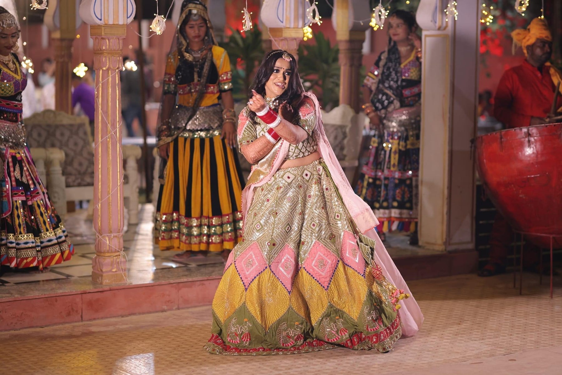 This bridal lehenga is made on raw silk fabric having handwork of pearl,cutdana,sequin,zardosi and resham work on it. This lehenga is also having patch work on it with colors of yellow and pink. It is having double dupatta on it. The fabric of the dupattas is organza silk with four sides handwork borders. The second dupatta is having borders of gota lappa on it.