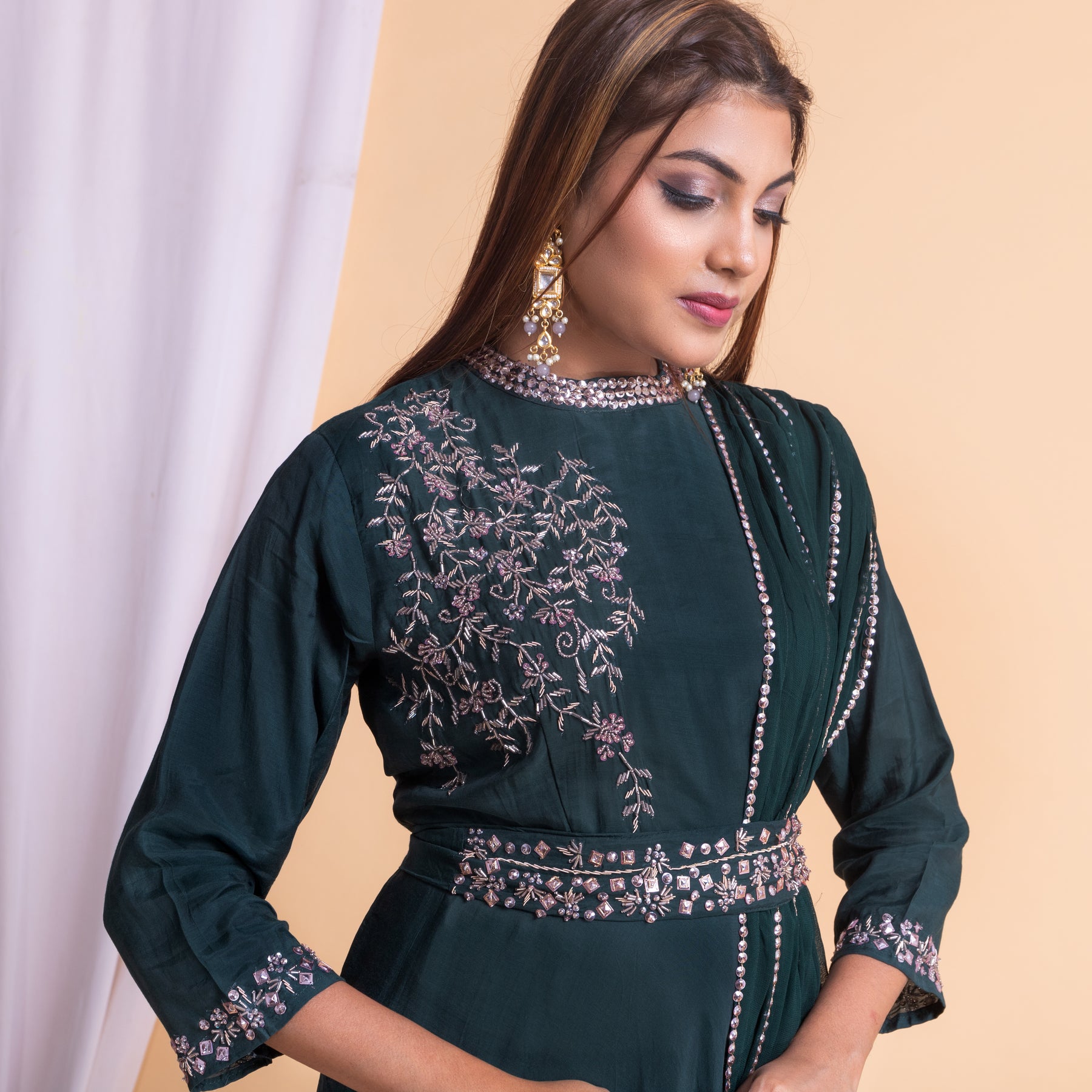Evergreen dress with one side drape