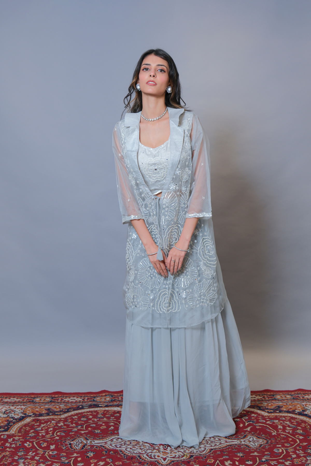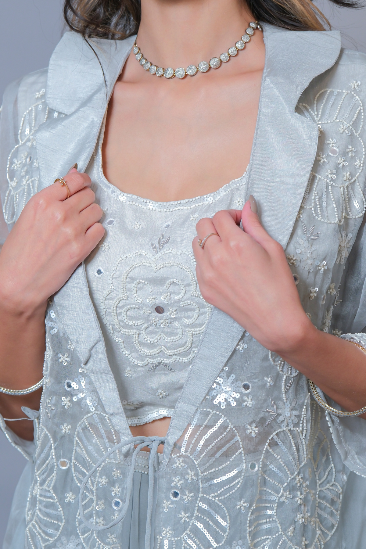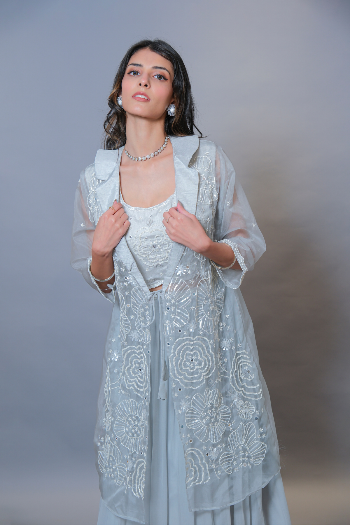 Effortlessly chic in shades of gray- a stylish combination of skirt and crop top, elevated by a sophisticated jacket and handwork of cutdana, pearl, sequin, resham, mirror.