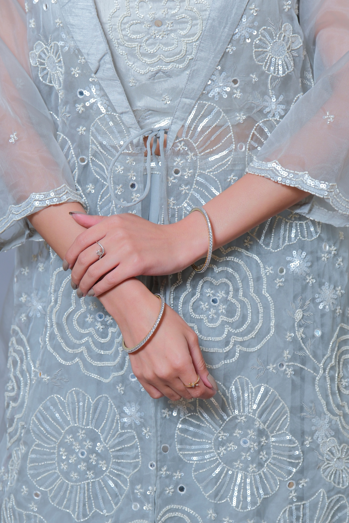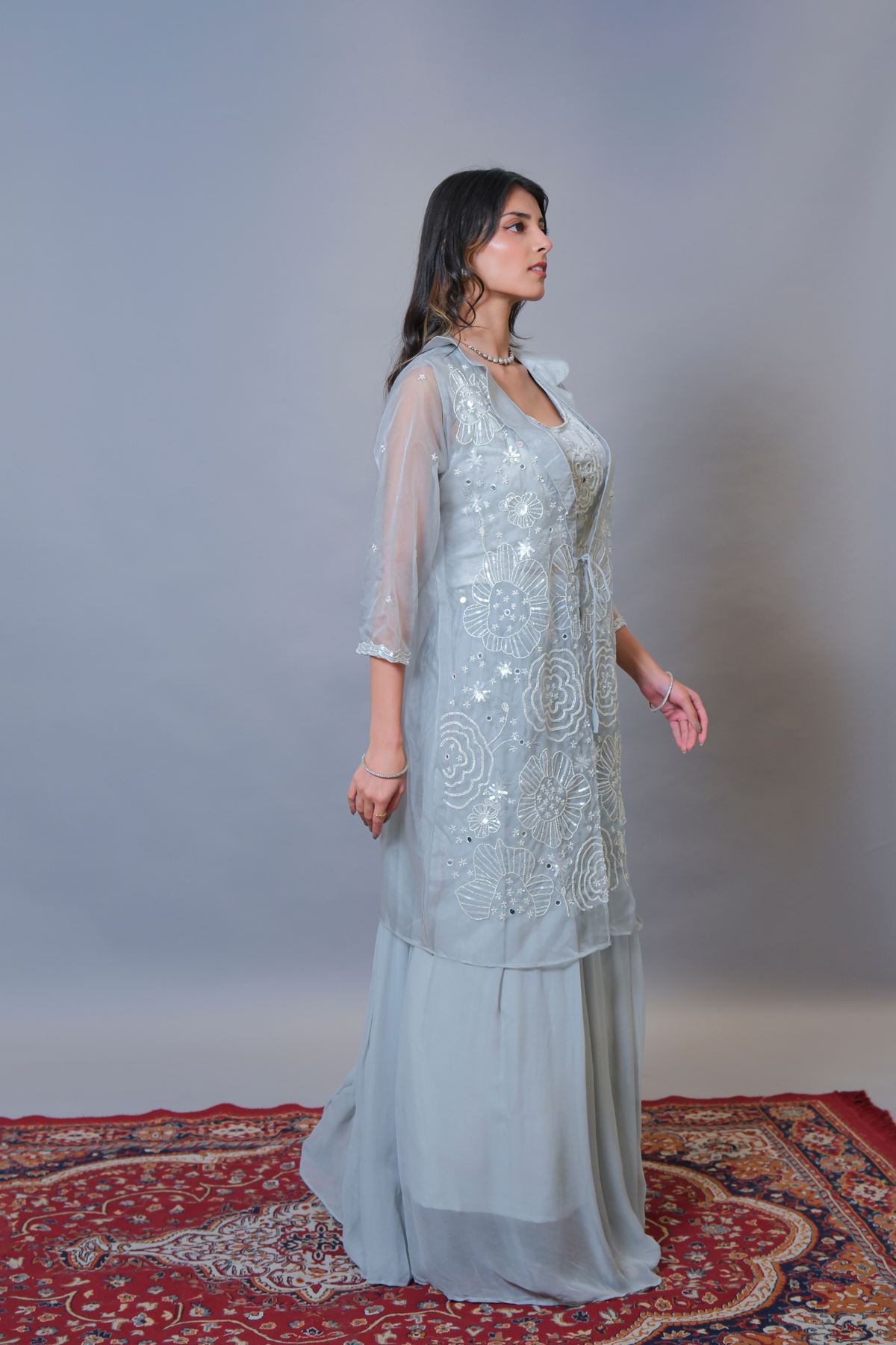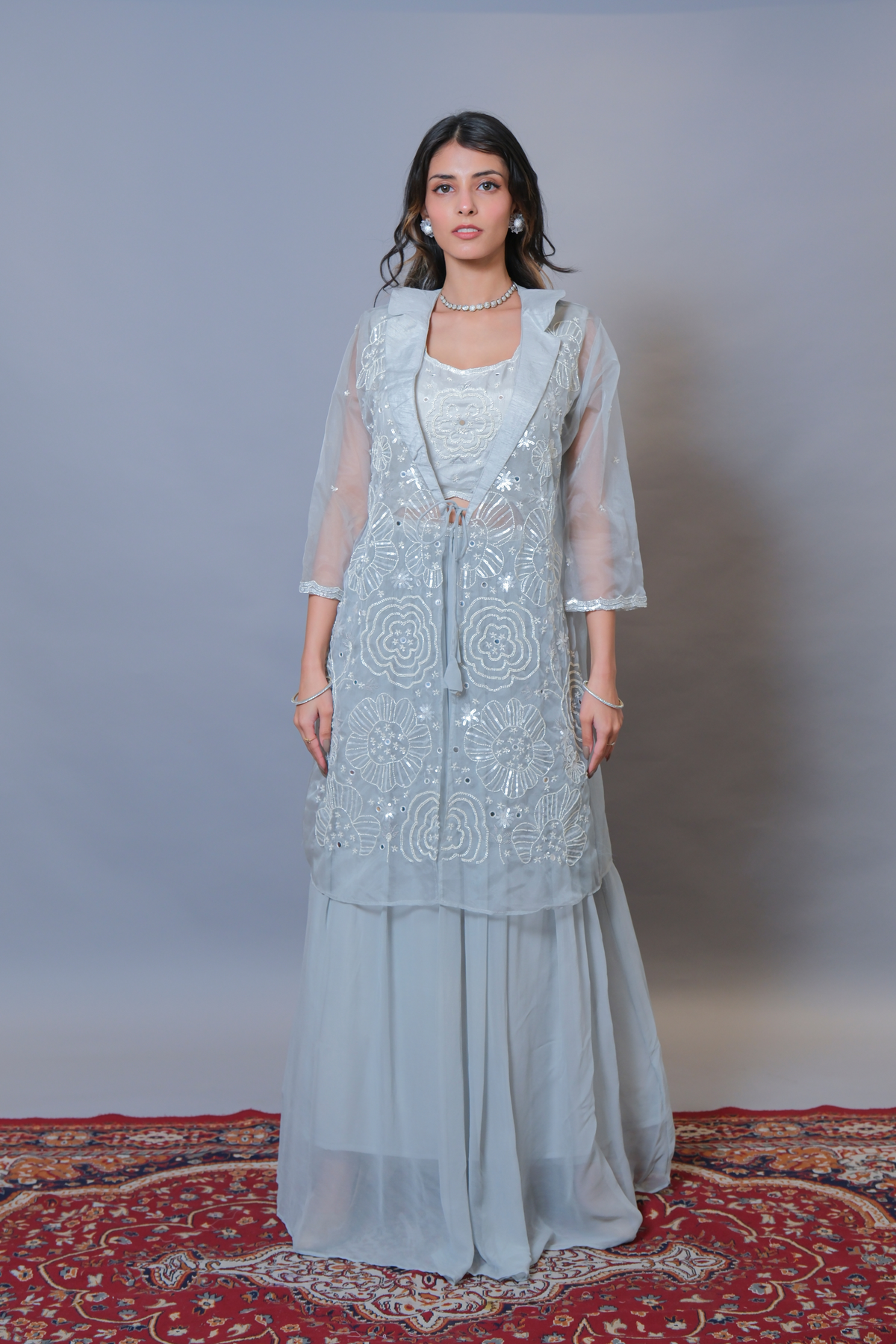 Effortlessly chic in shades of gray- a stylish combination of skirt and crop top, elevated by a sophisticated jacket and handwork of cutdana, pearl, sequin, resham, mirror.