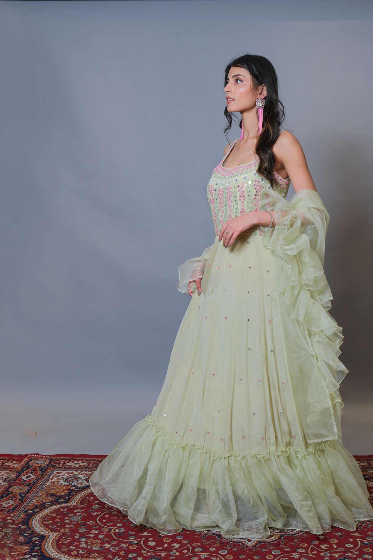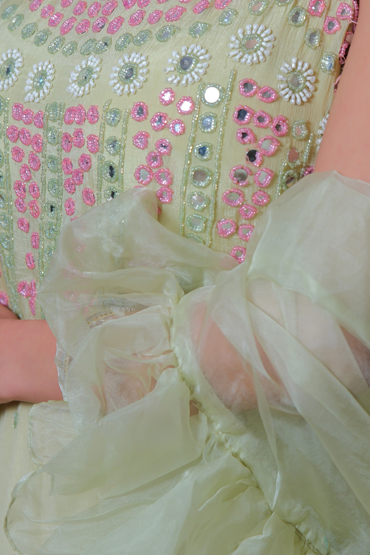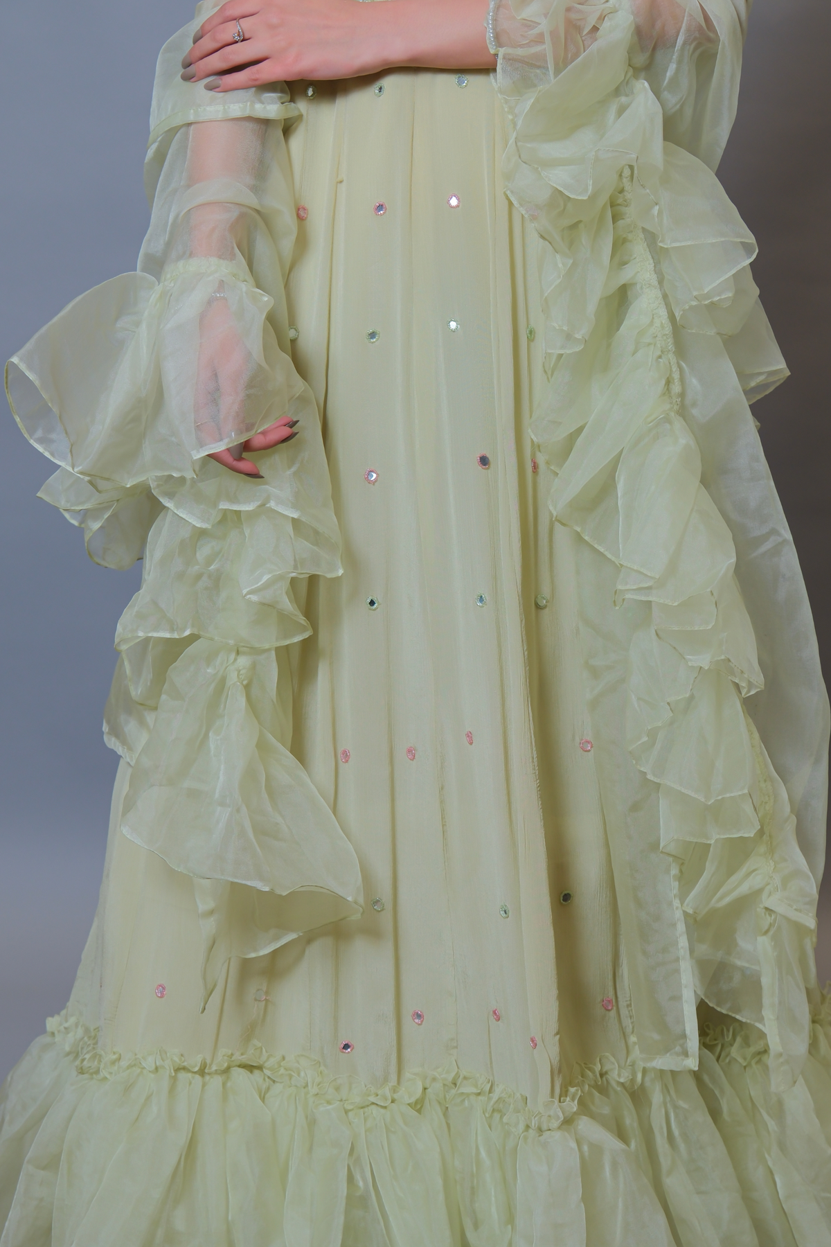 Enchanting in pastel green, adorned with a ruffled dupatta that whispers elegance with every flutter of handwork of pearl, mirror and cutdana