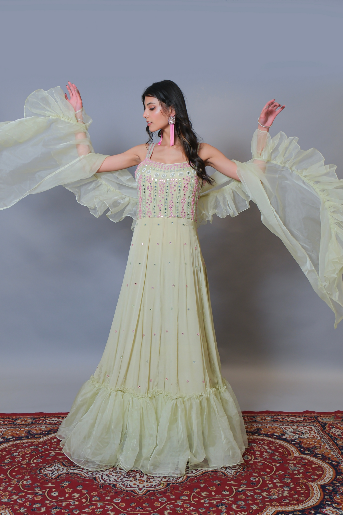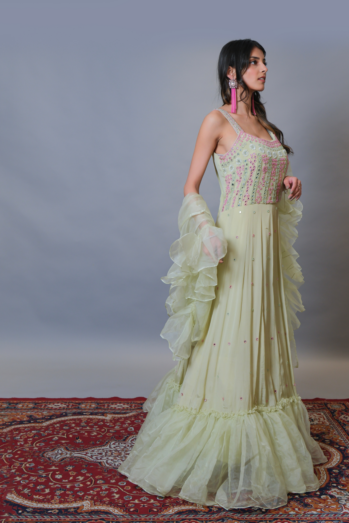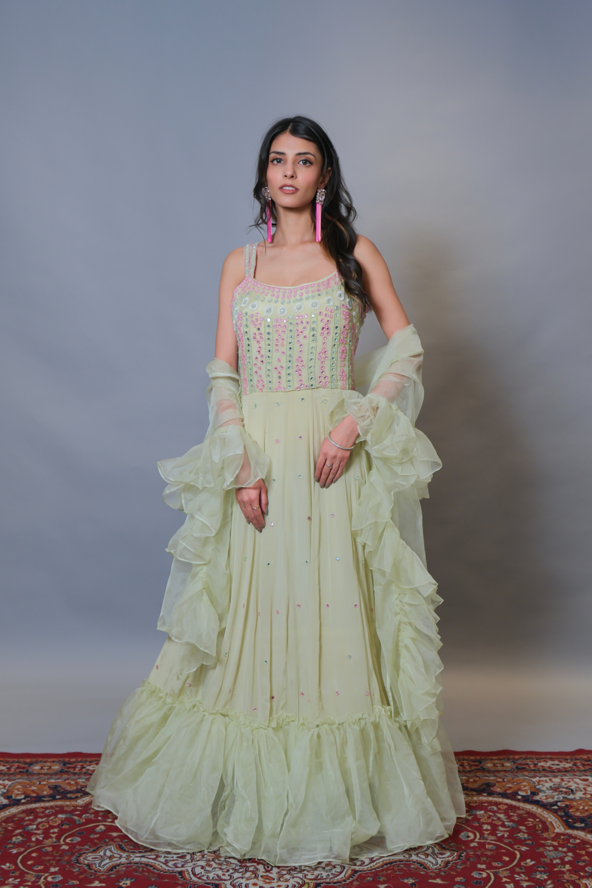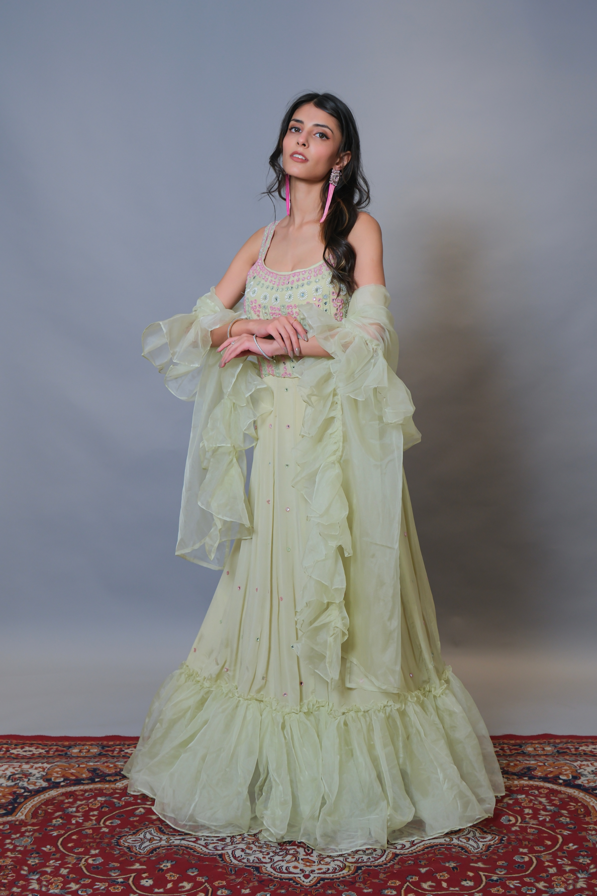 Enchanting in pastel green, adorned with a ruffled dupatta that whispers elegance with every flutter of handwork of pearl, mirror and cutdana