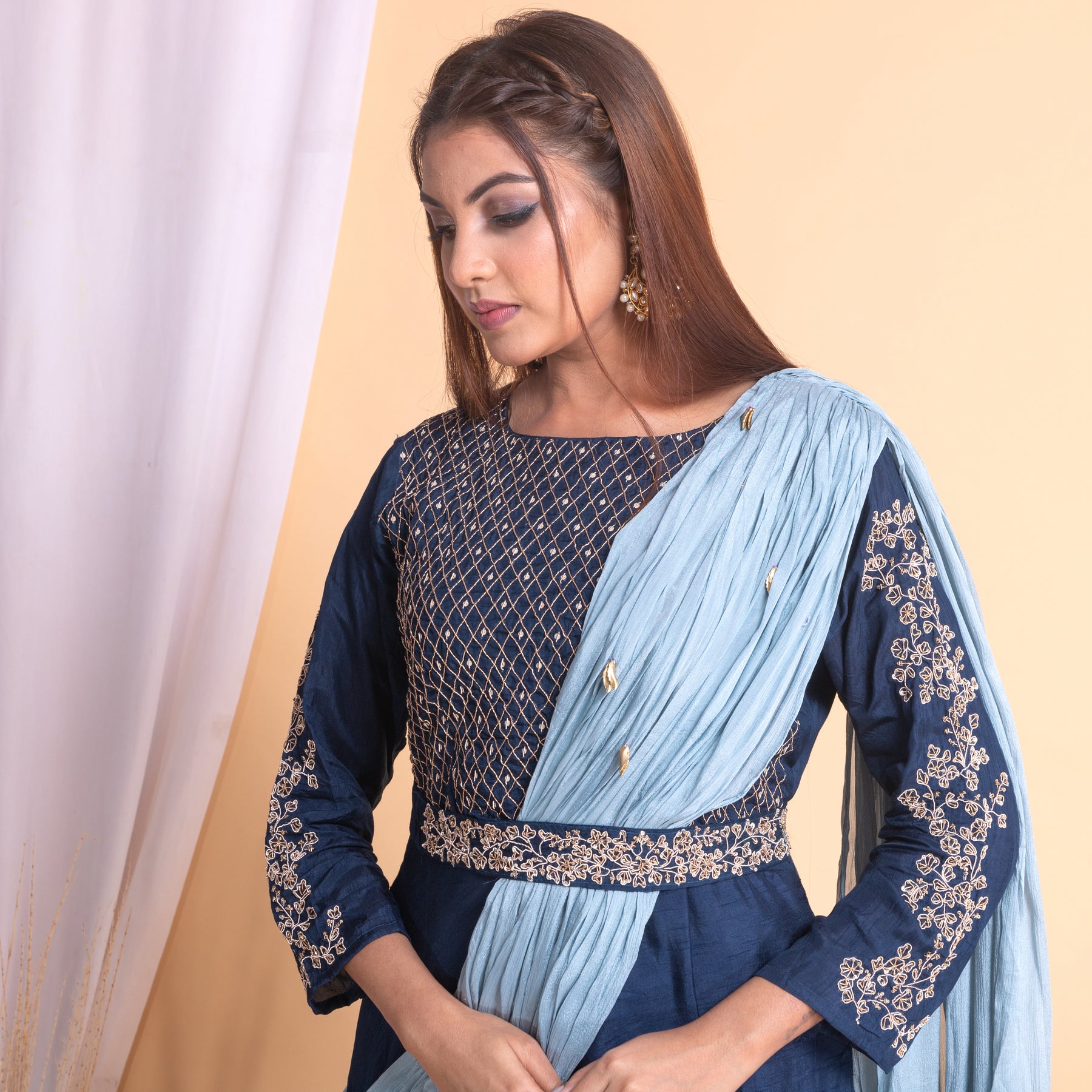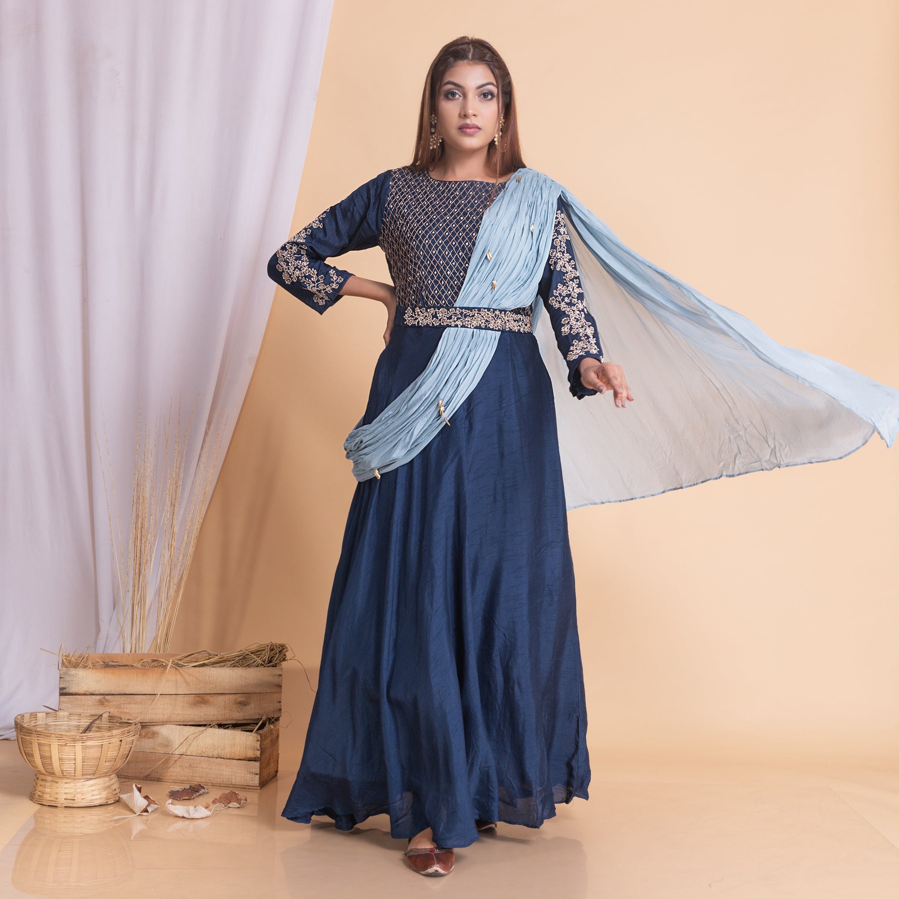 Create a statement style with this pure muslin silk, having embroidered of marodi, zardosi, cutdana and sequin work. This gown comes with pre-draped dupatta and a embroidered belt to give it a perfect look. The gorgeous zardosi detailing all over the body and sleeves will surely make a lot of heads turn.
