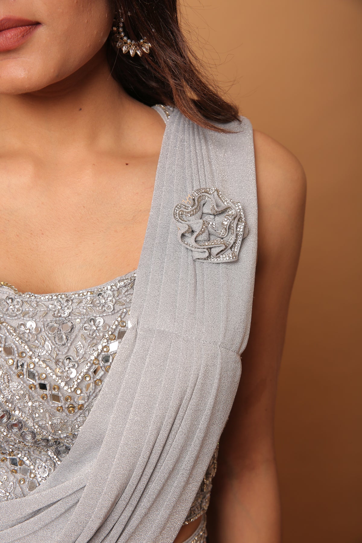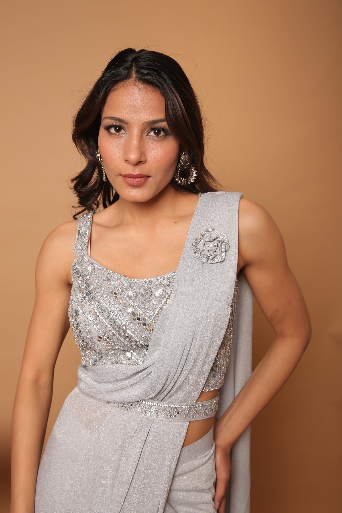 Ready to wear saree made from high quality shimmer Lycra fabric that gracefully drapes around you catching the light with every step you take. The highlight is a beautifully designed blouse featuring sequins, mirrors and pearls. The handworked belt adds a touch of modernity, adding a contenporary flair to the traditional attire.