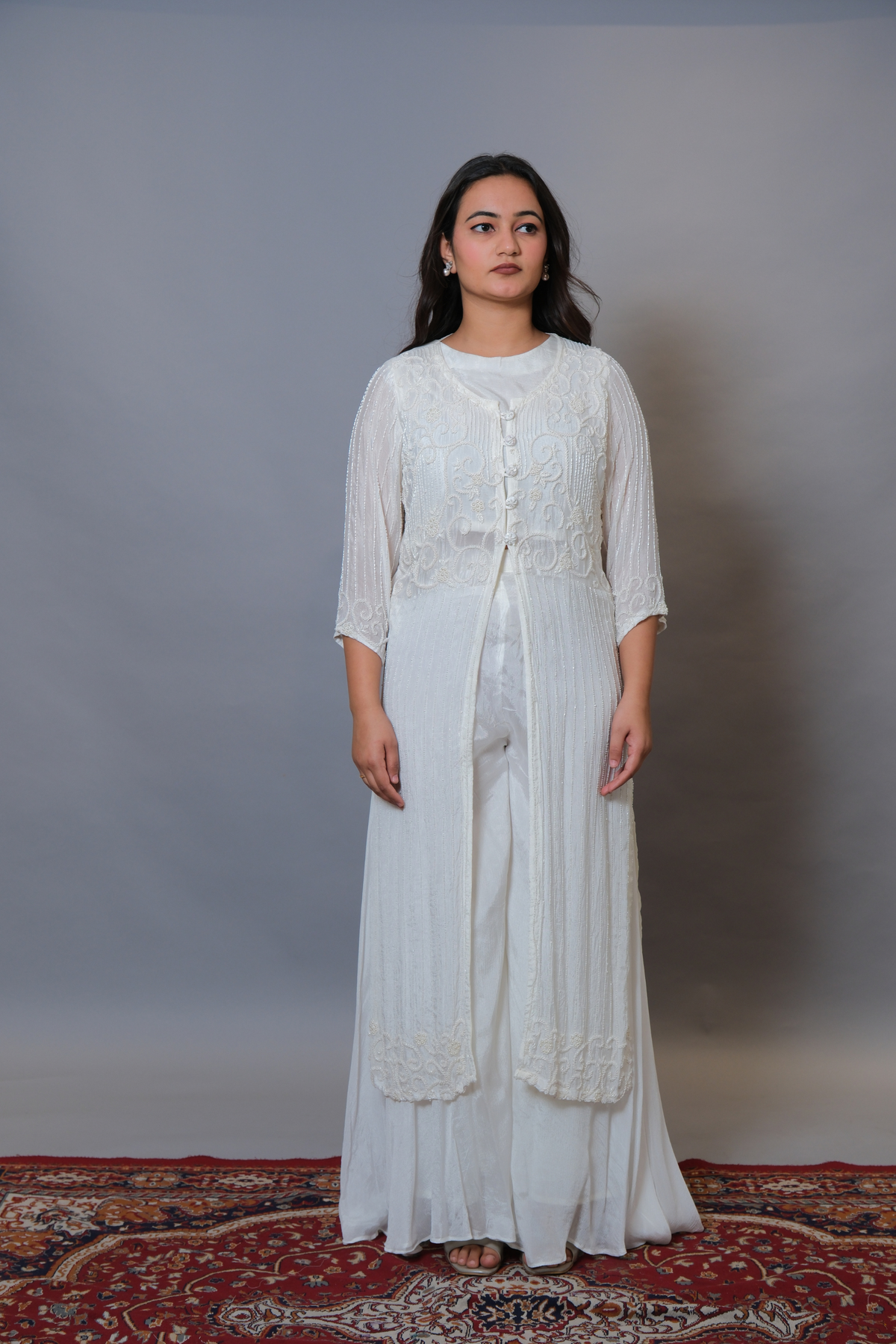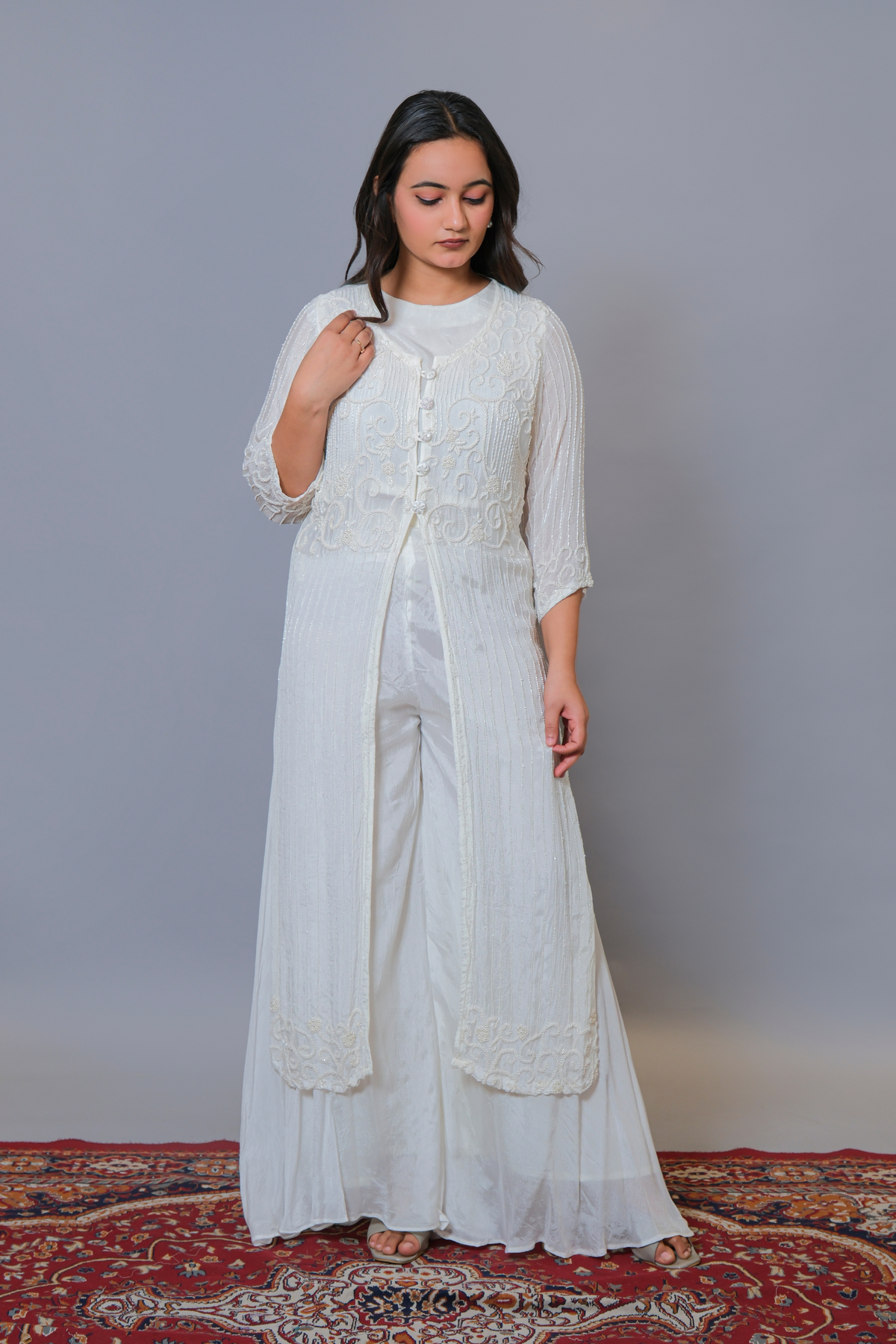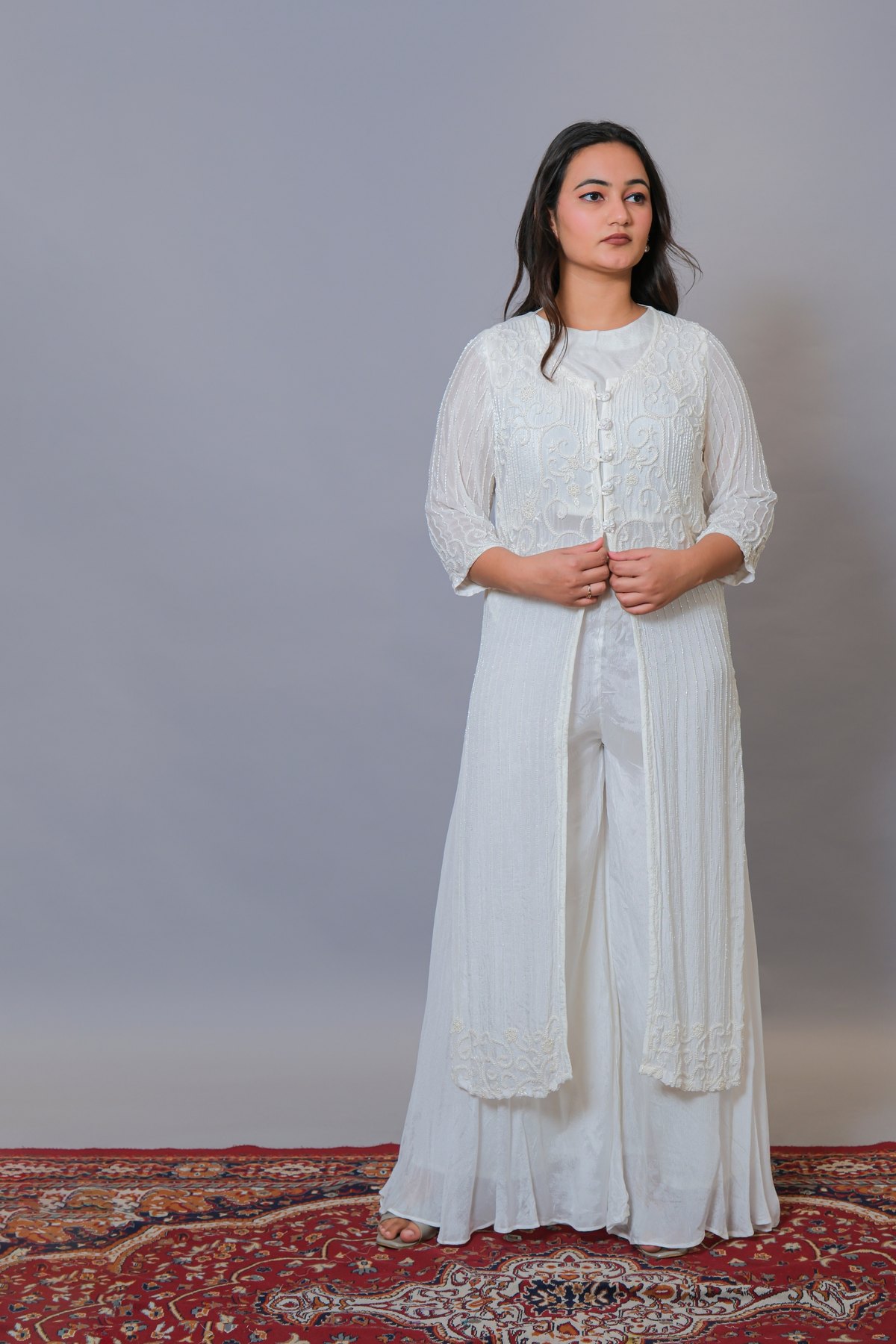 White Sharara and crop top with long jacket
