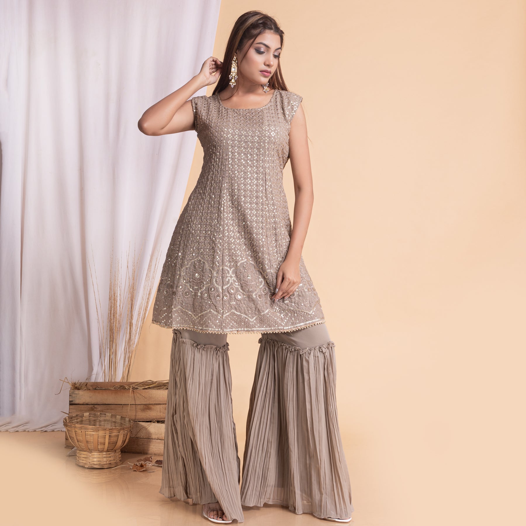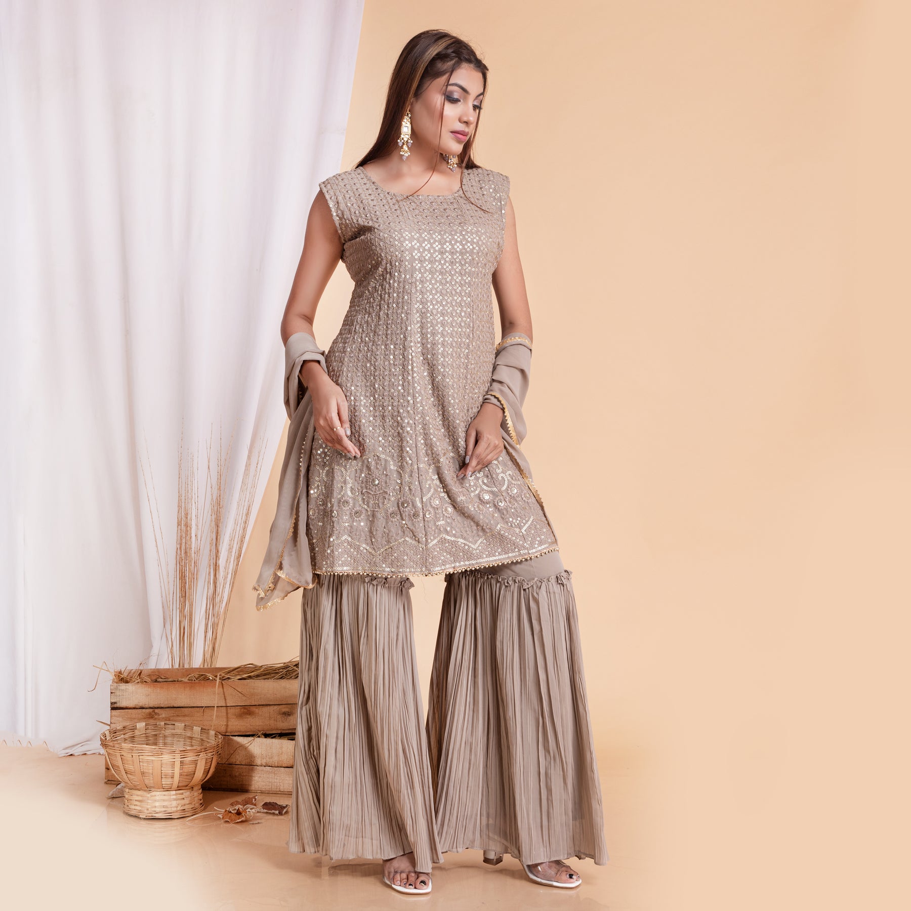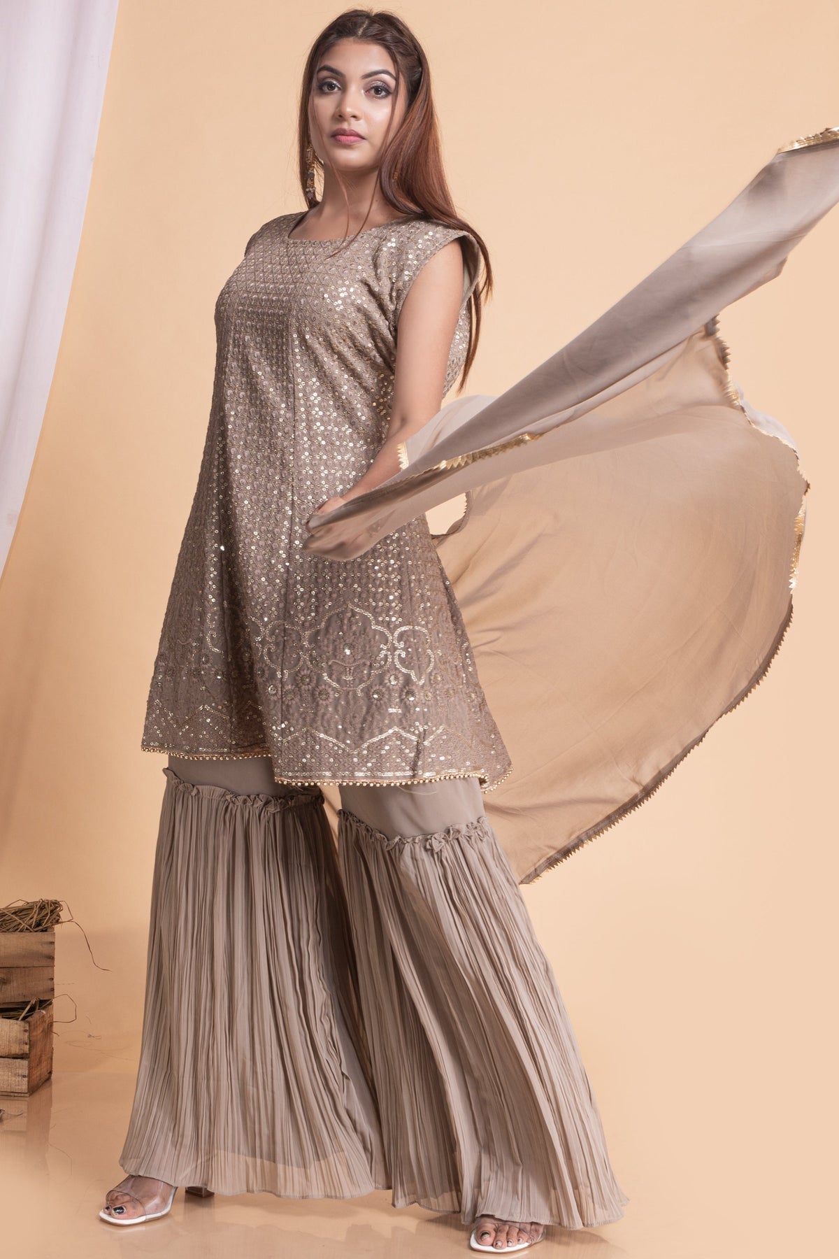 Introducing a majestic style that will attract attention everywhere you go. Made on georgette fabric having beautiful machine work of sequin and thread on it and paired with flared sharara and dupatta make this dress more beautiful.