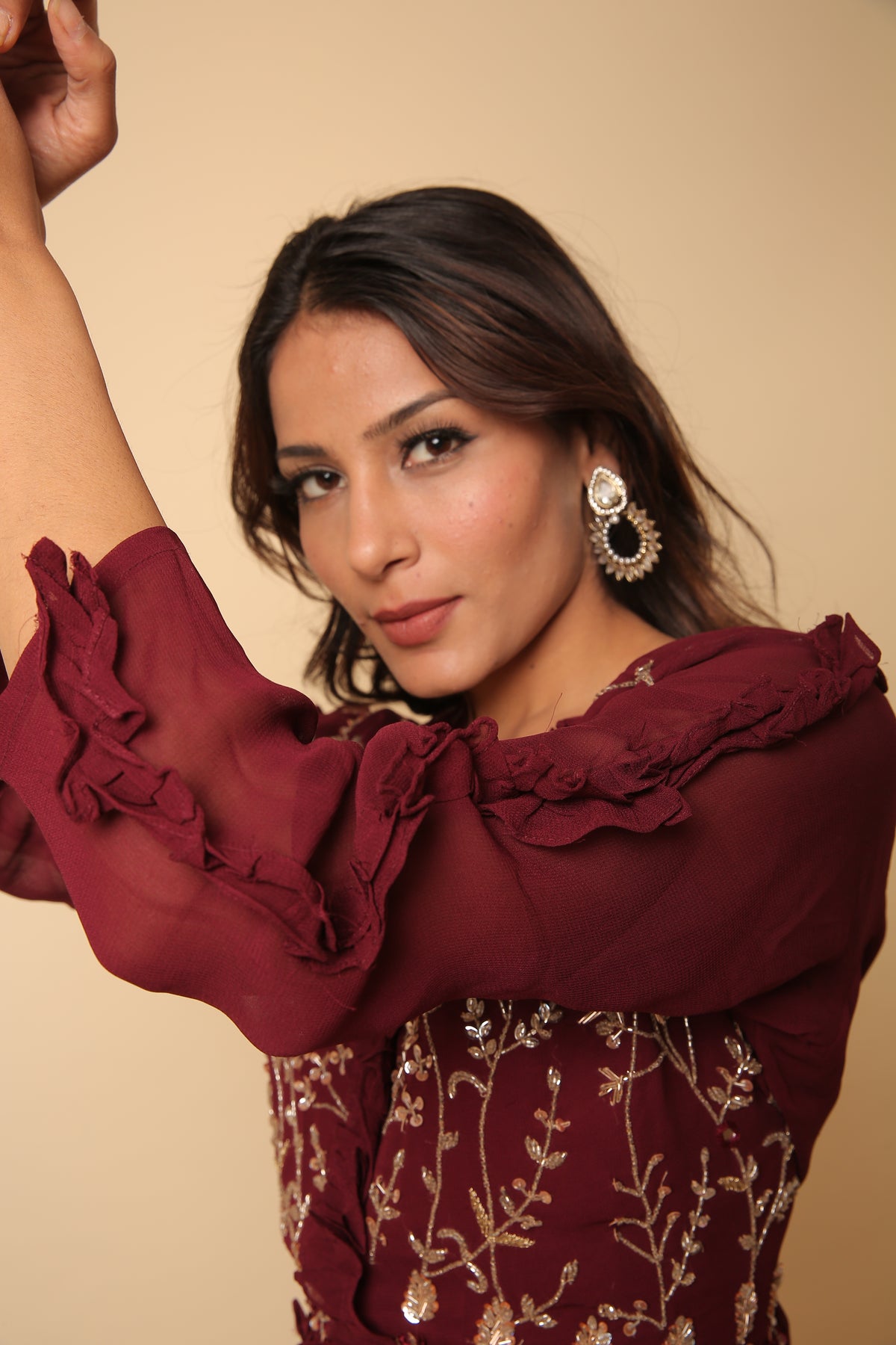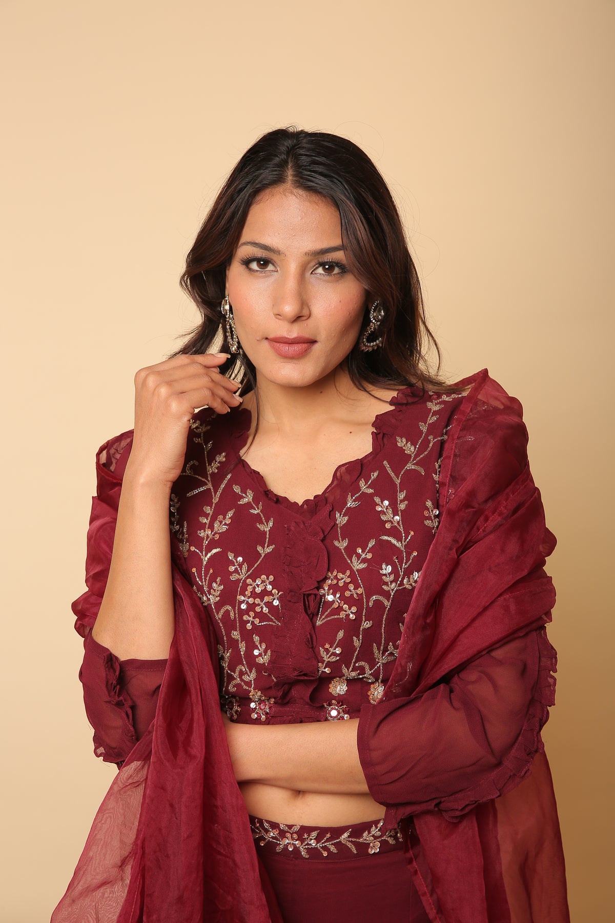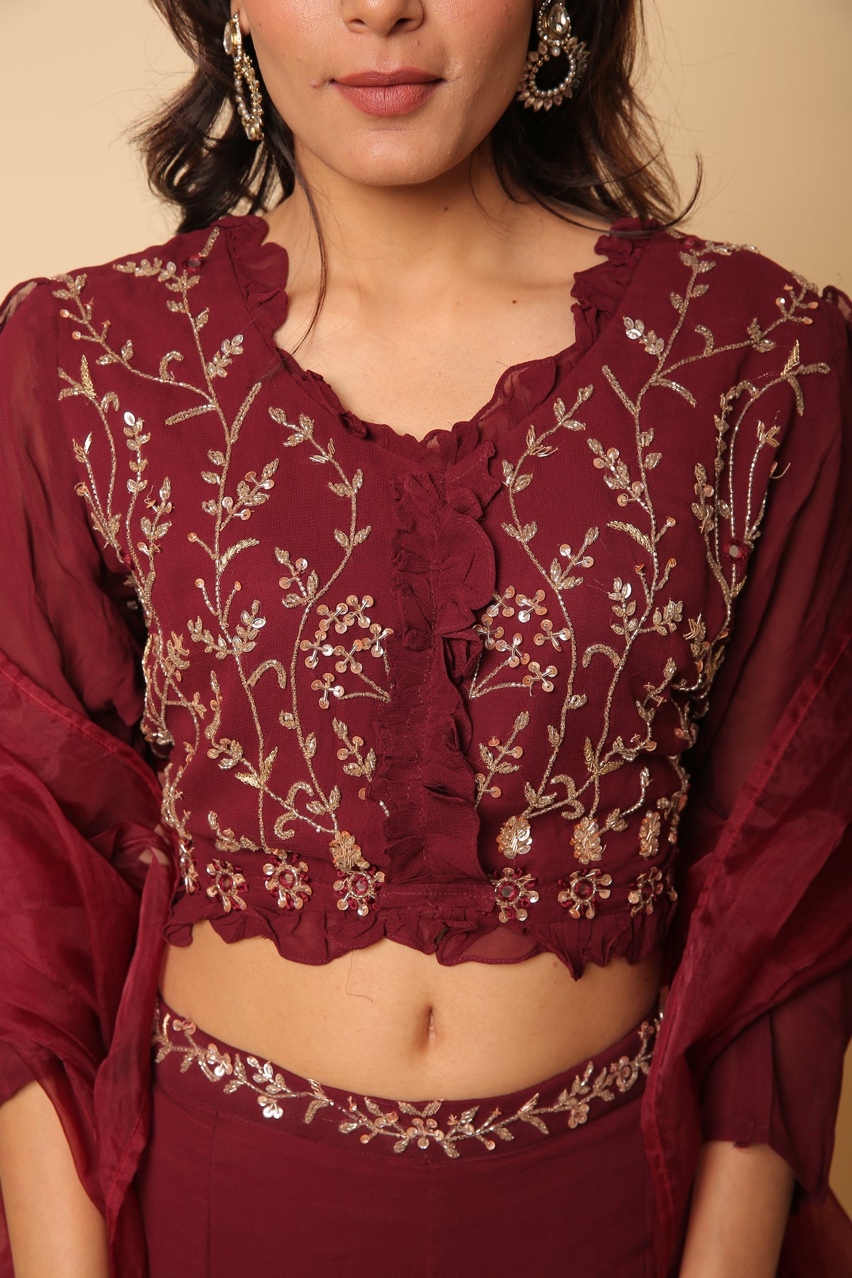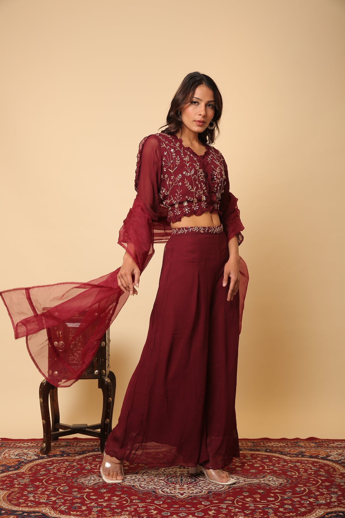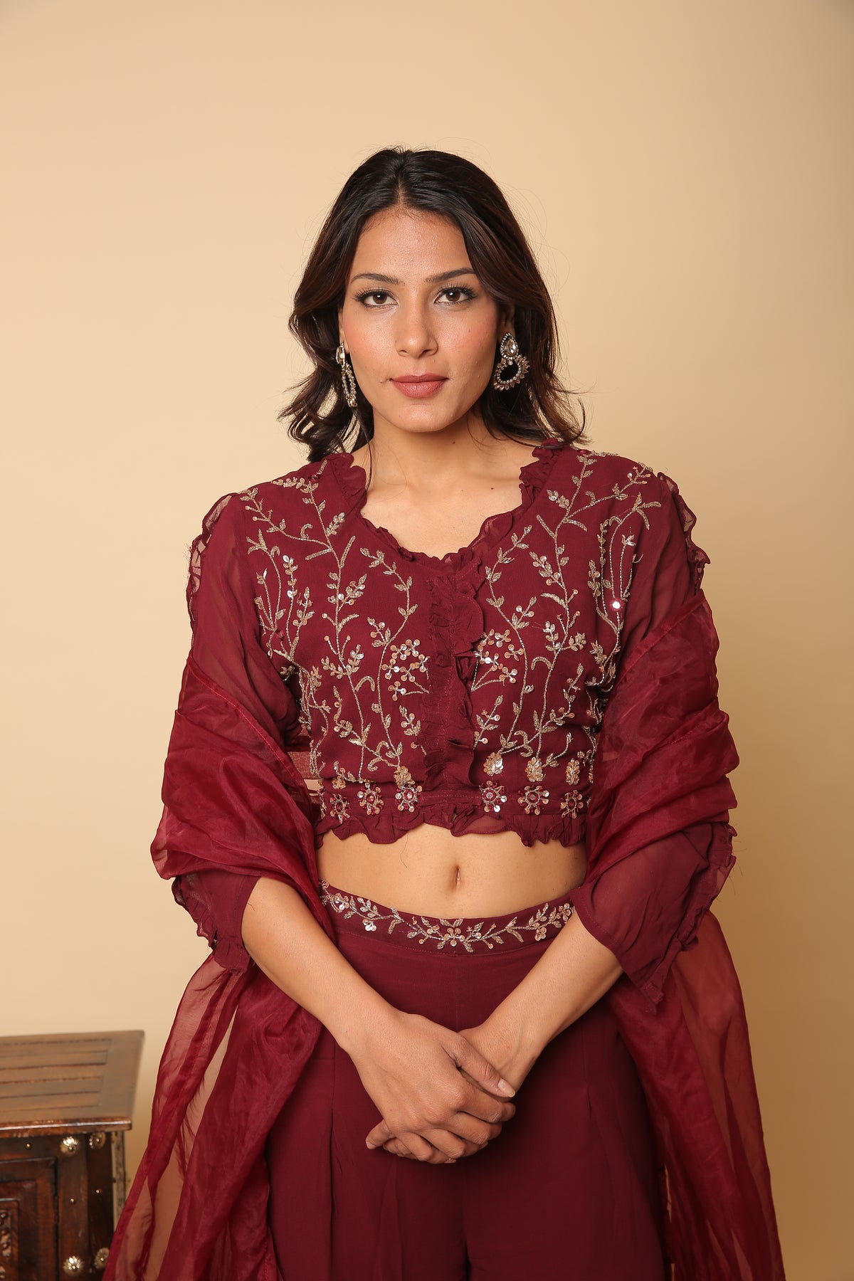 Maroon red crop top and plazo with ruffle dupatta