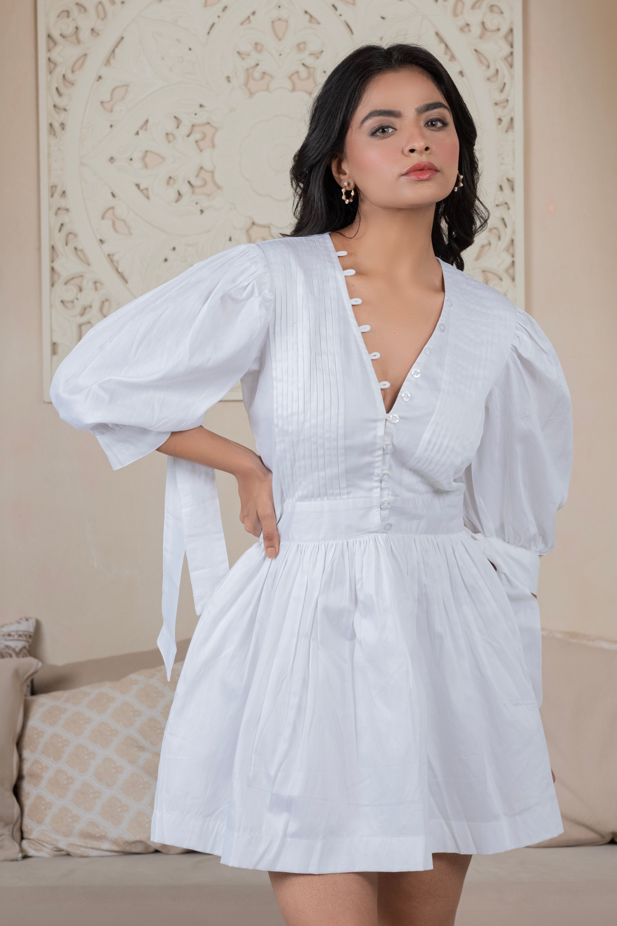 It's a Italian cotton Puff sleeves with tie closure dress. Pleating on the bust with loop and button detailing. It is fully lined white dress.