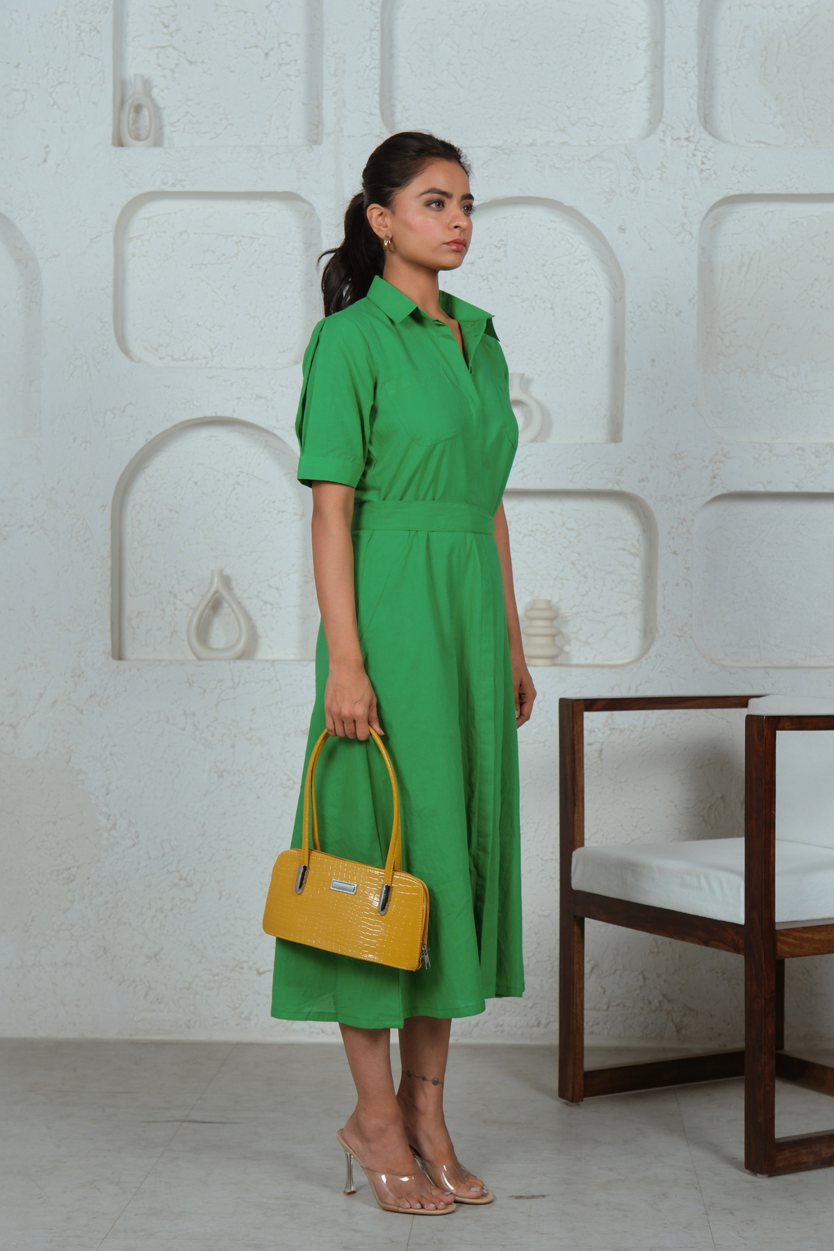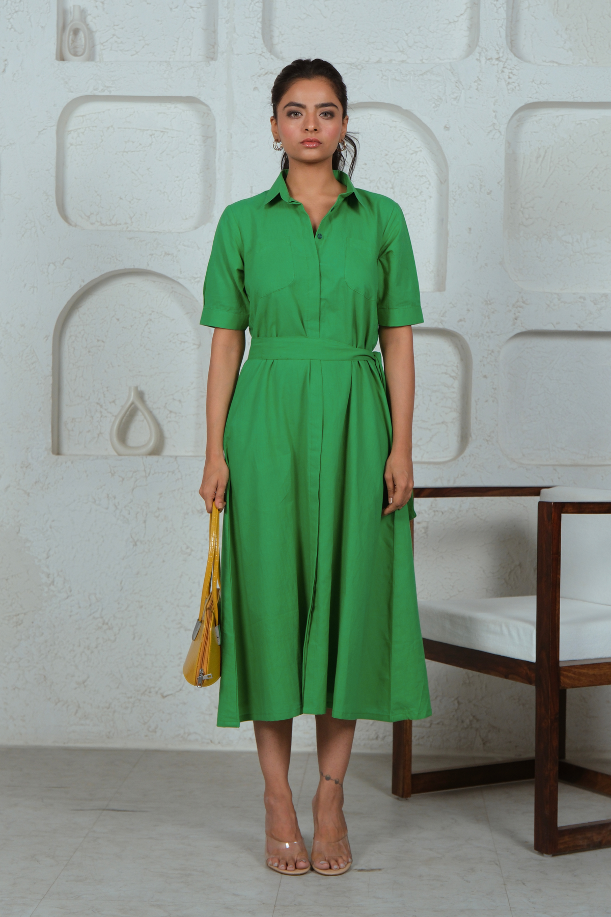 This dress is having front buttons,collar neck with short sleeves. To give it a perfect look it adds up with belt. Made on pure cotton fabric with fully lined.