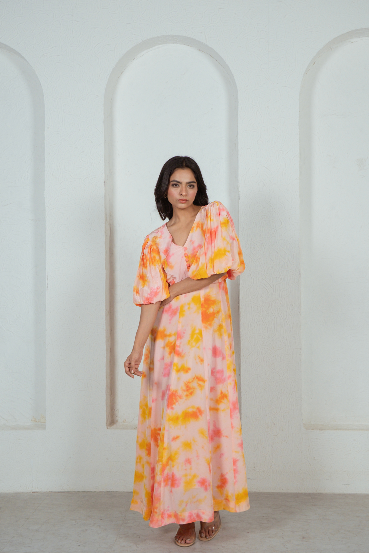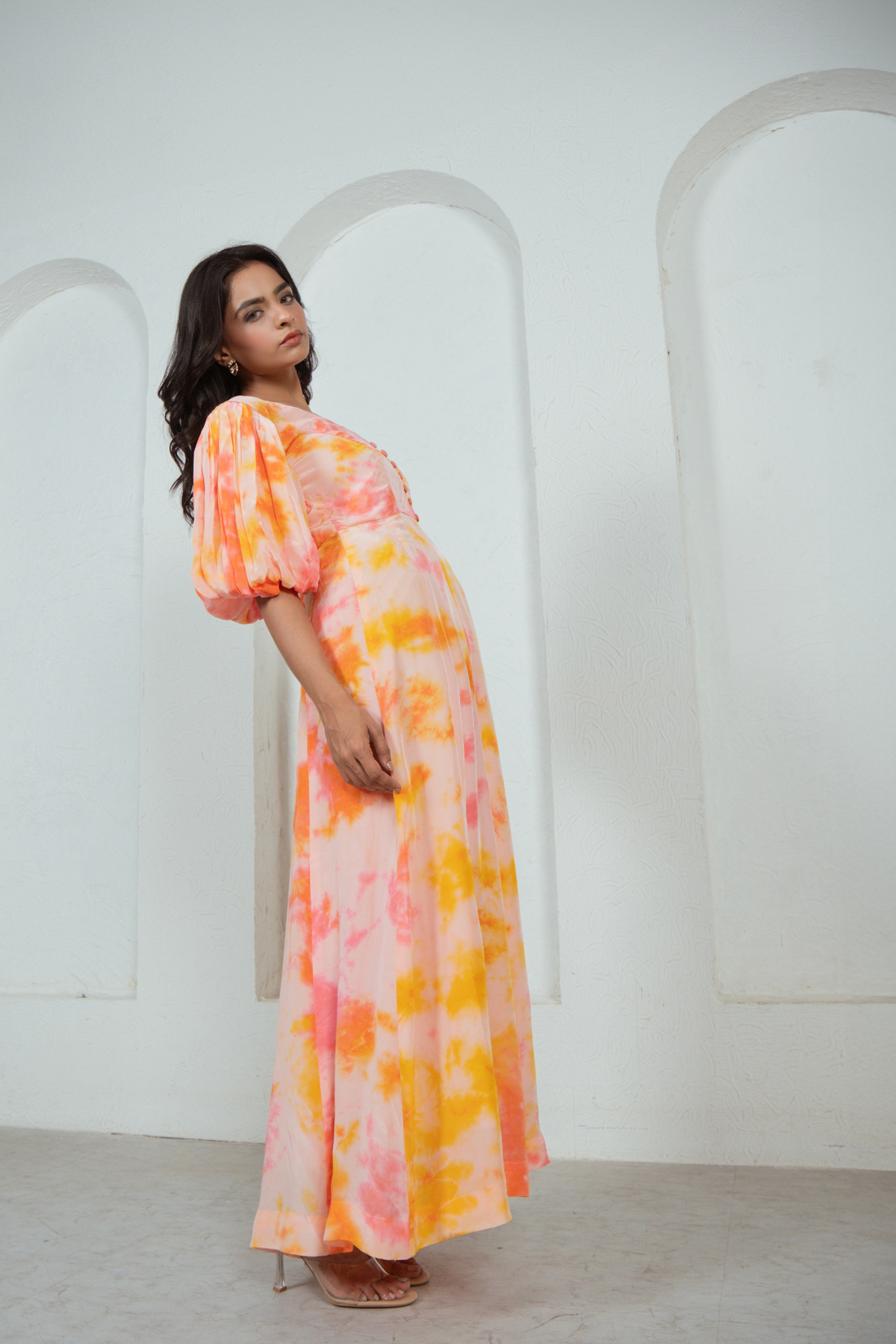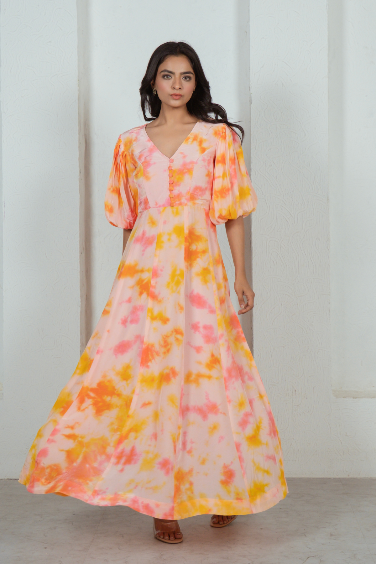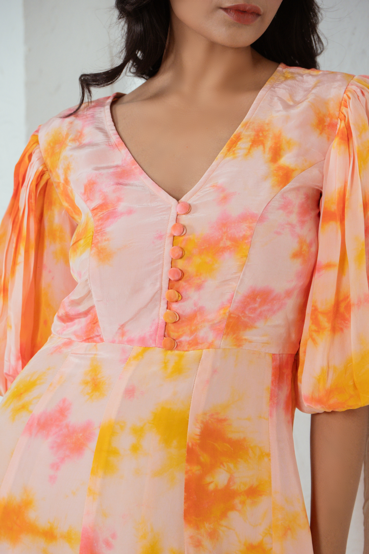It's a full lined crepe dress with short puff sleeves. It's a tie dye fabric with cascading voluminous skirt dress.