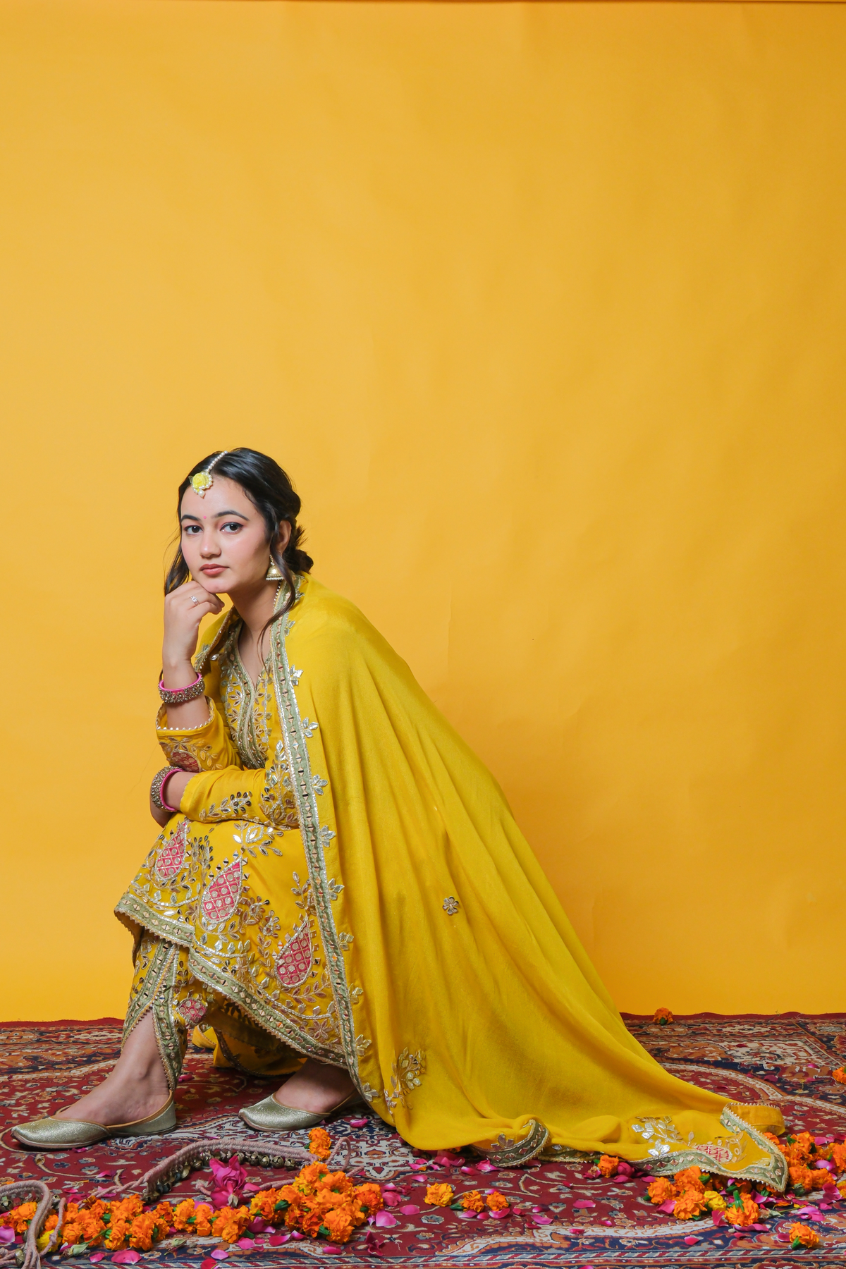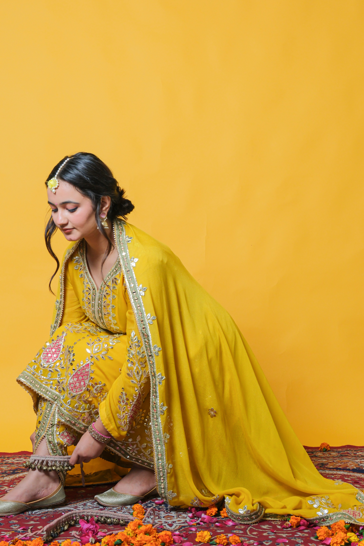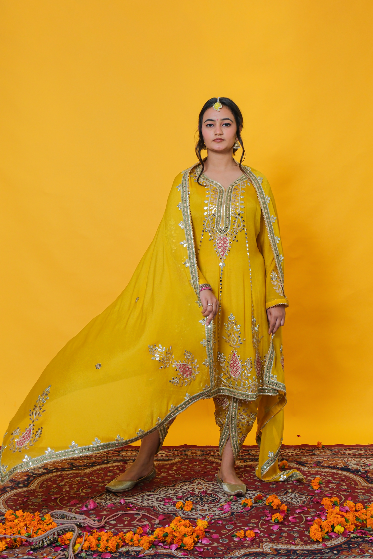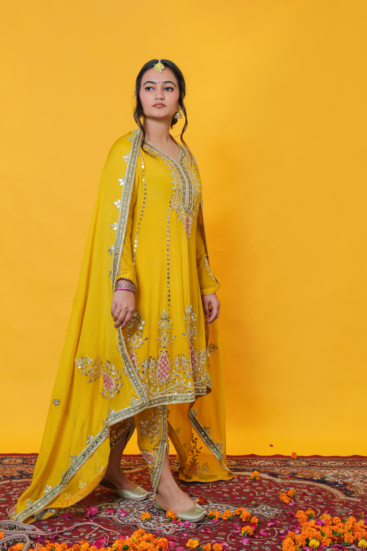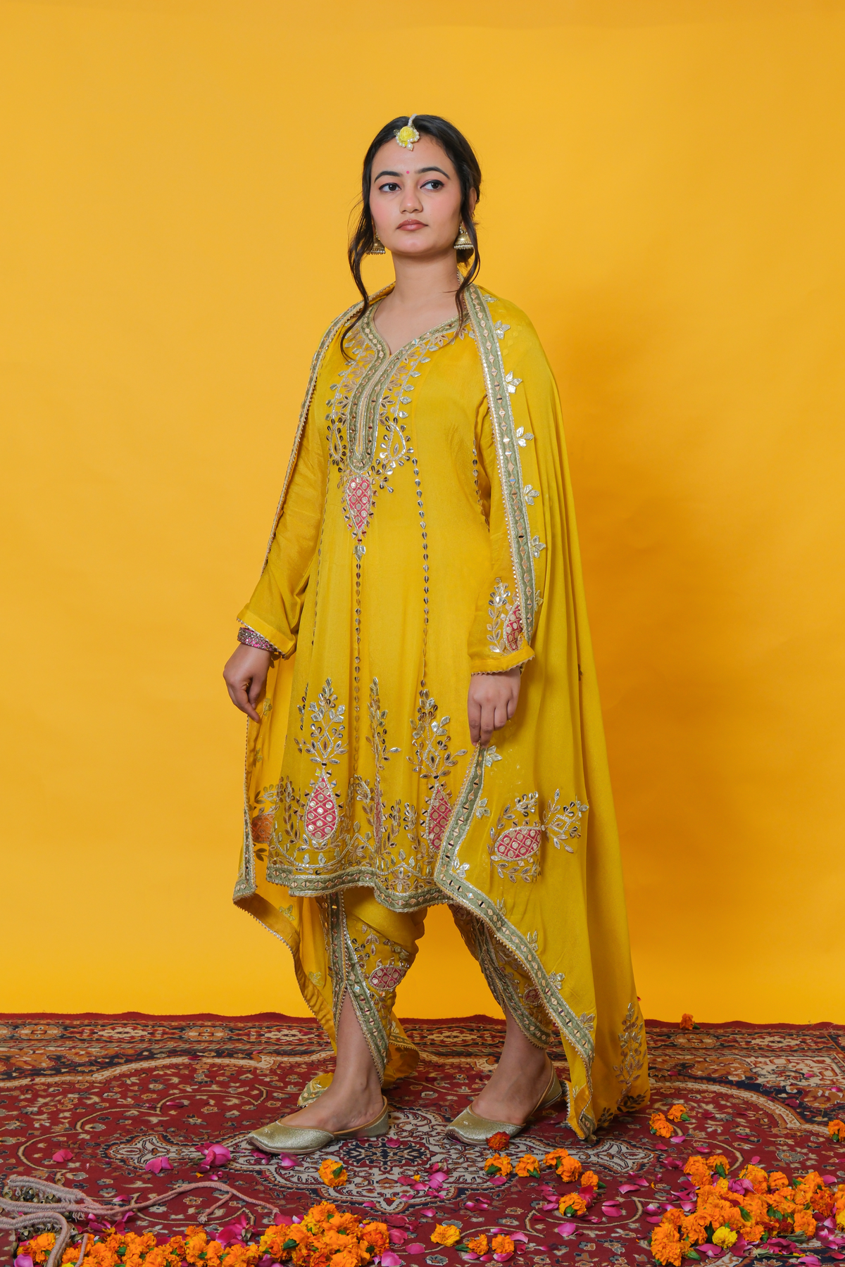 Dazzle in Ambre yellow! Embrace the fusion trend with a chic tulip pant, short anarkali, and a complementary dupatta with handwork of zardosi, resham, ,irror and kacha gotta- your style, your statement.