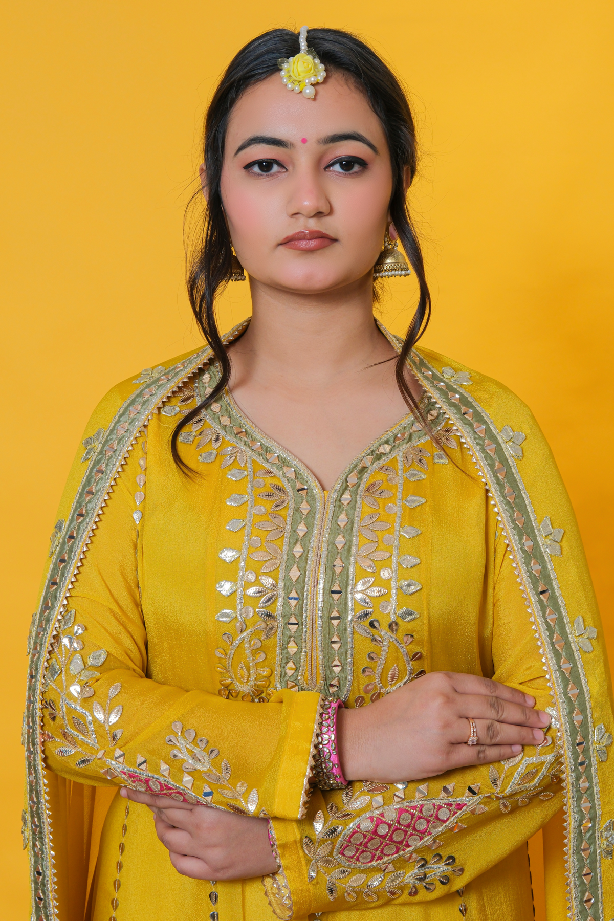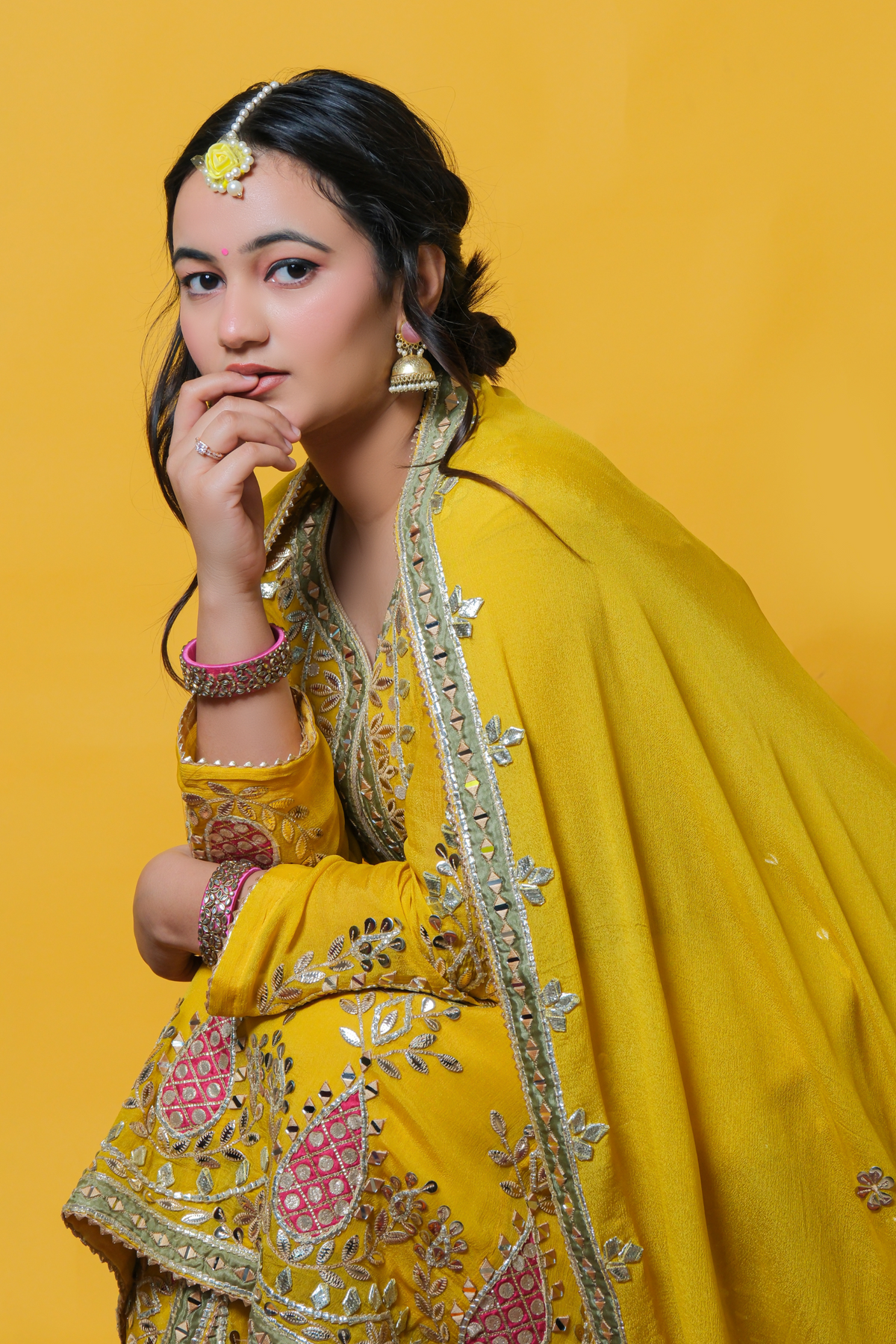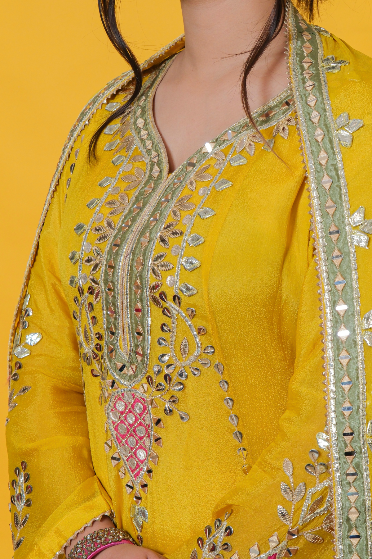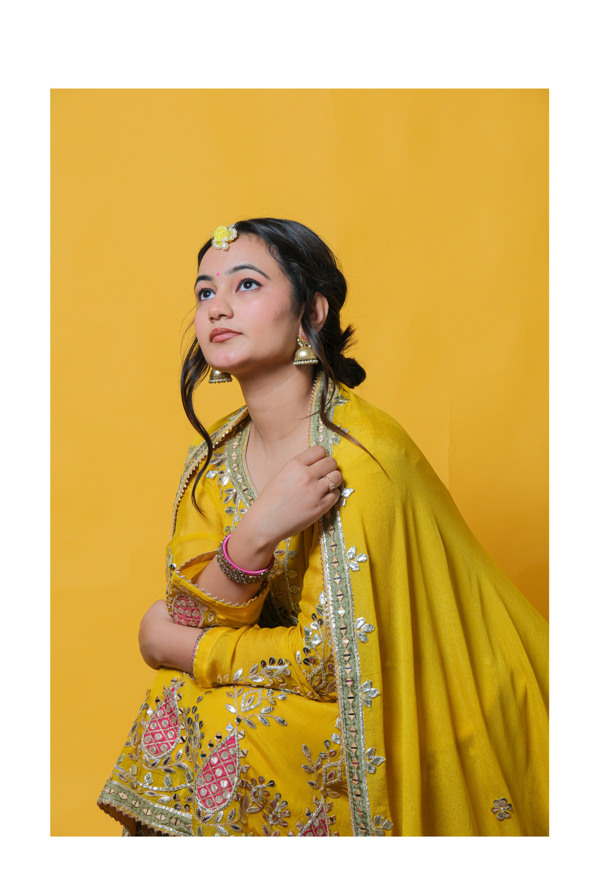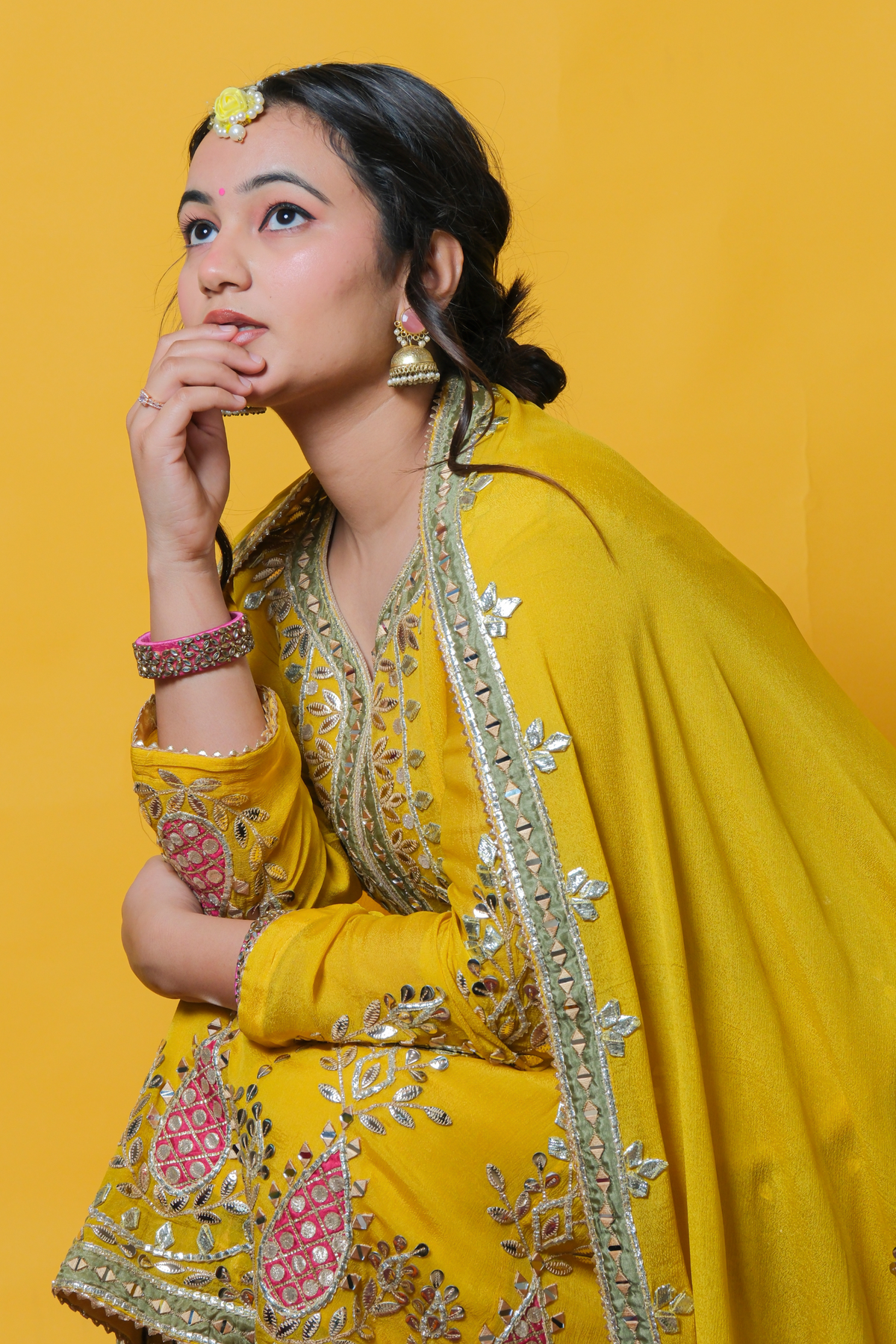 Dazzle in Ambre yellow! Embrace the fusion trend with a chic tulip pant, short anarkali, and a complementary dupatta with handwork of zardosi, resham, ,irror and kacha gotta- your style, your statement.