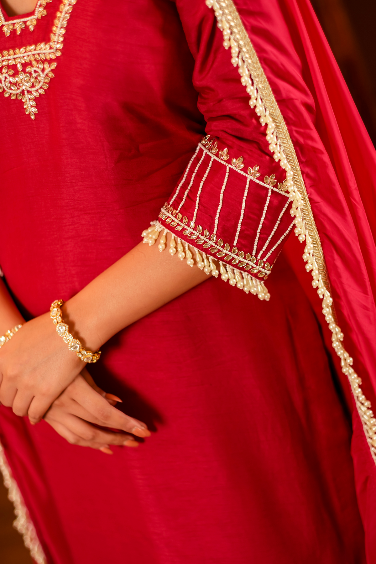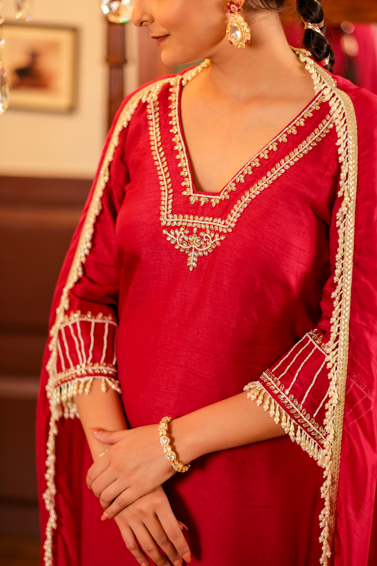 Elevate your style with this elegant muslin silk kurta featuring intricate kundan and pearl work. Paired with flowing Banarsi georgette plazos and a delicate organza silk dupatta adorned with butties and borders, this ensemble perfectly blends tradition and modernity, making it ideal for festive occasions.