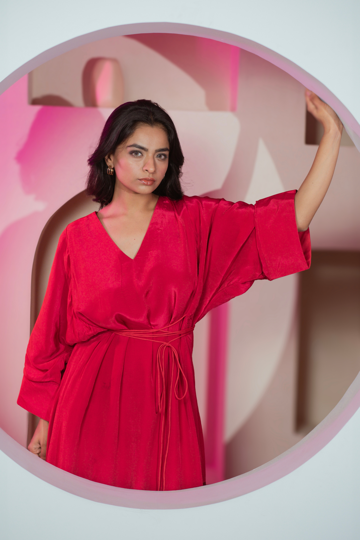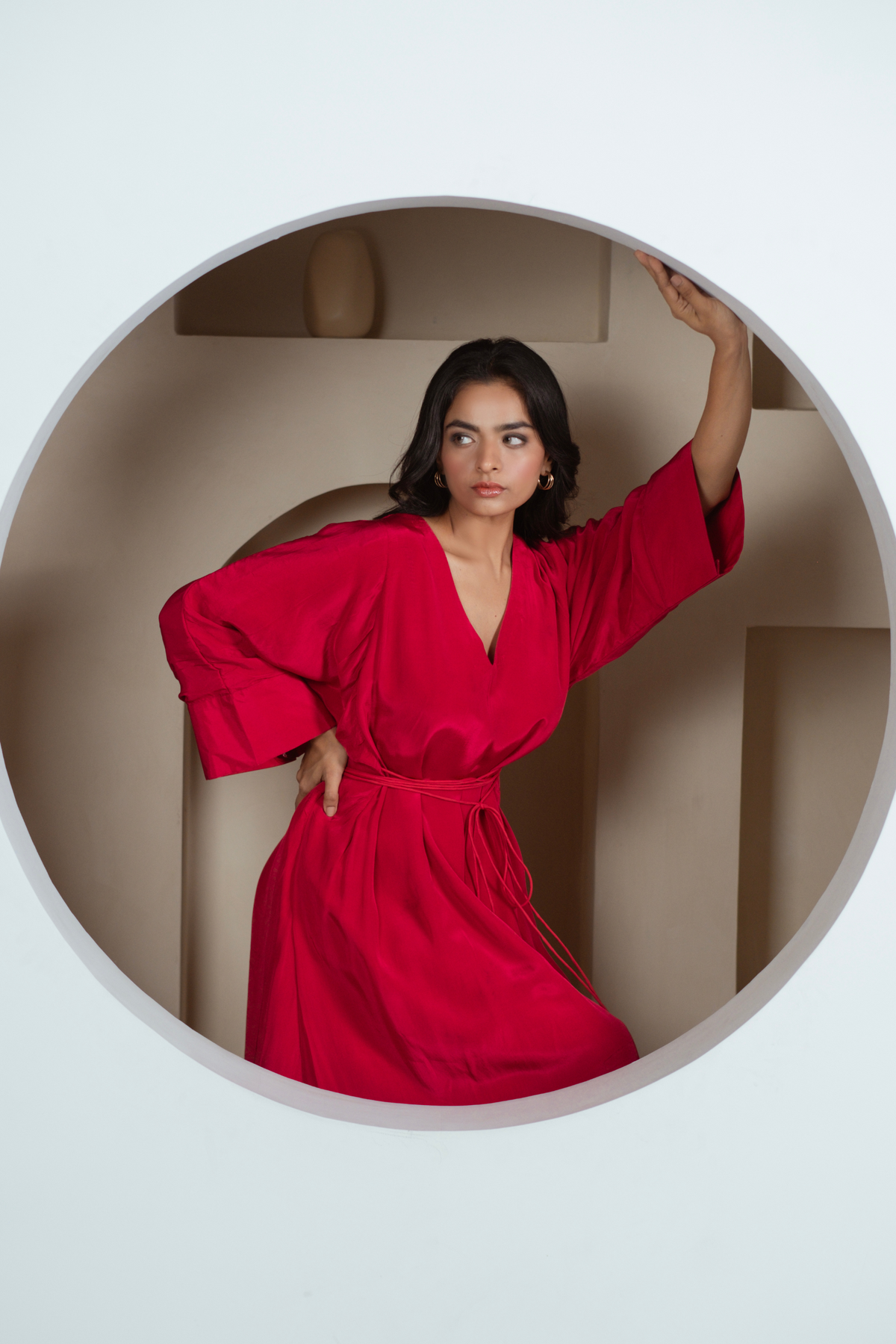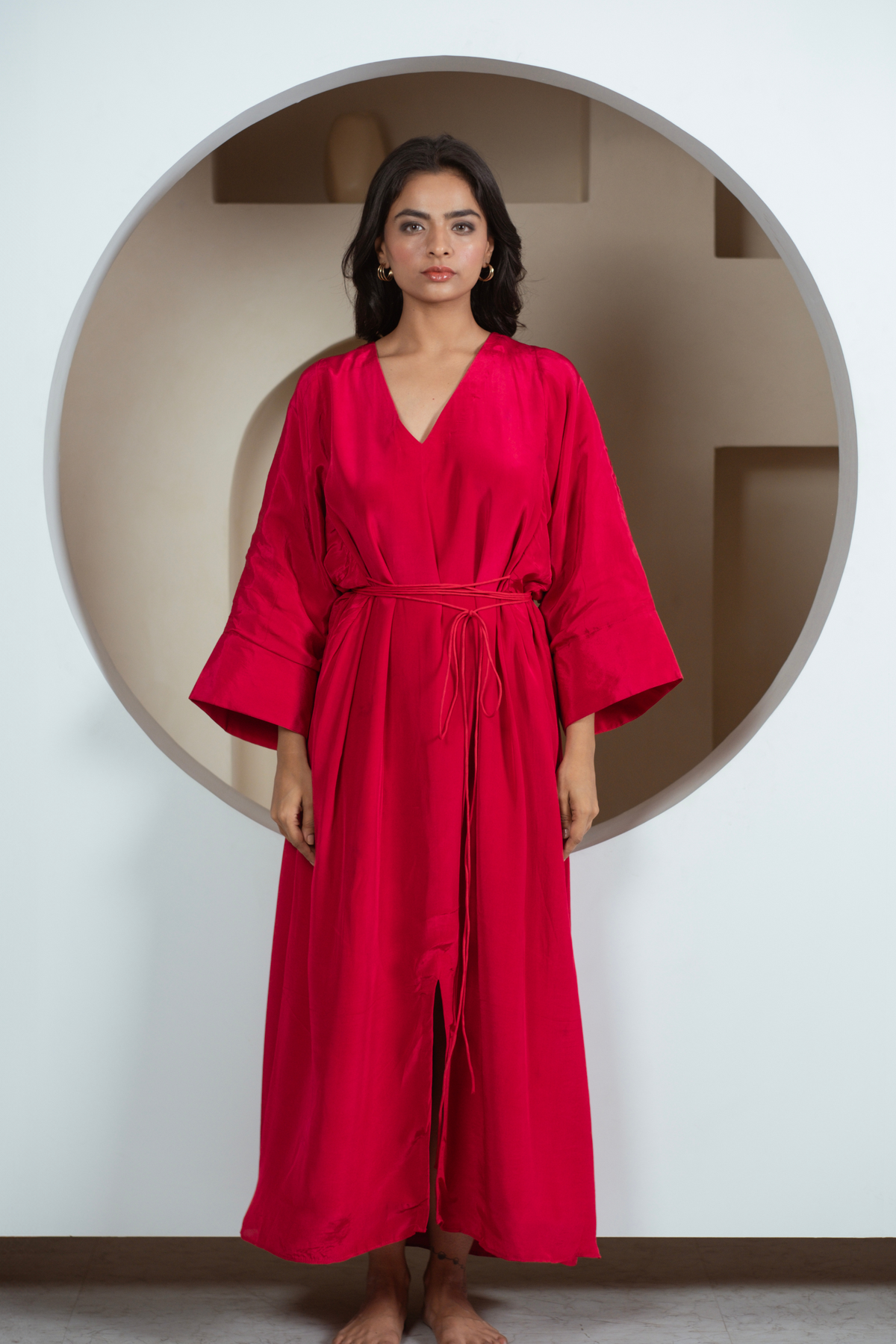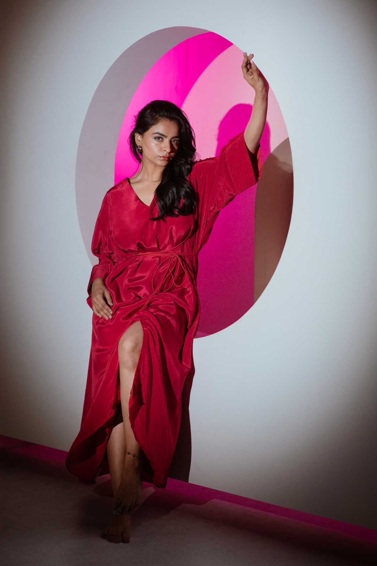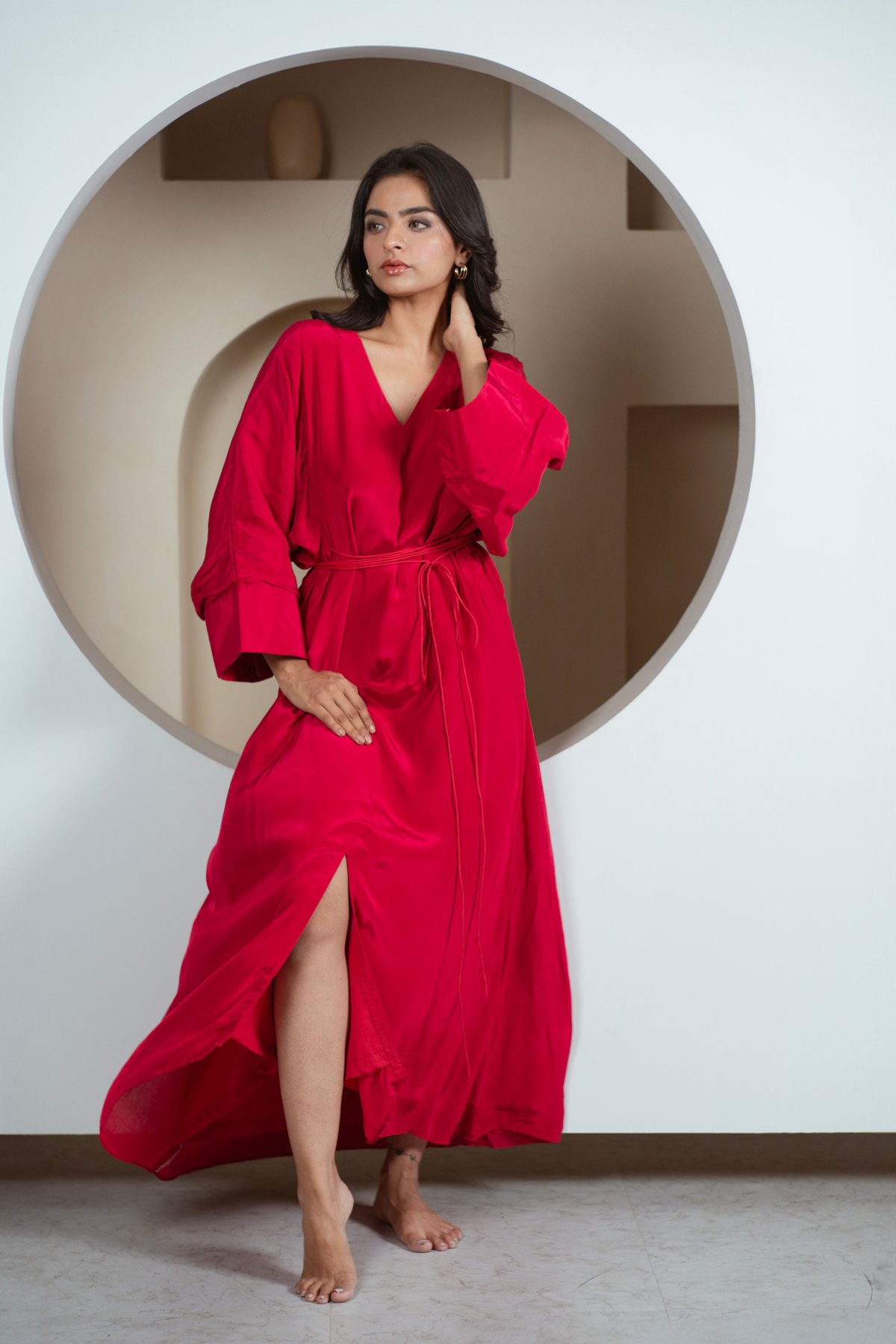 This long dress is having strings at the waist of this dress to tie up. It's a crepe silk dress having A line sleeves and a slit at the front of the dress. This dress id perfect for date night.