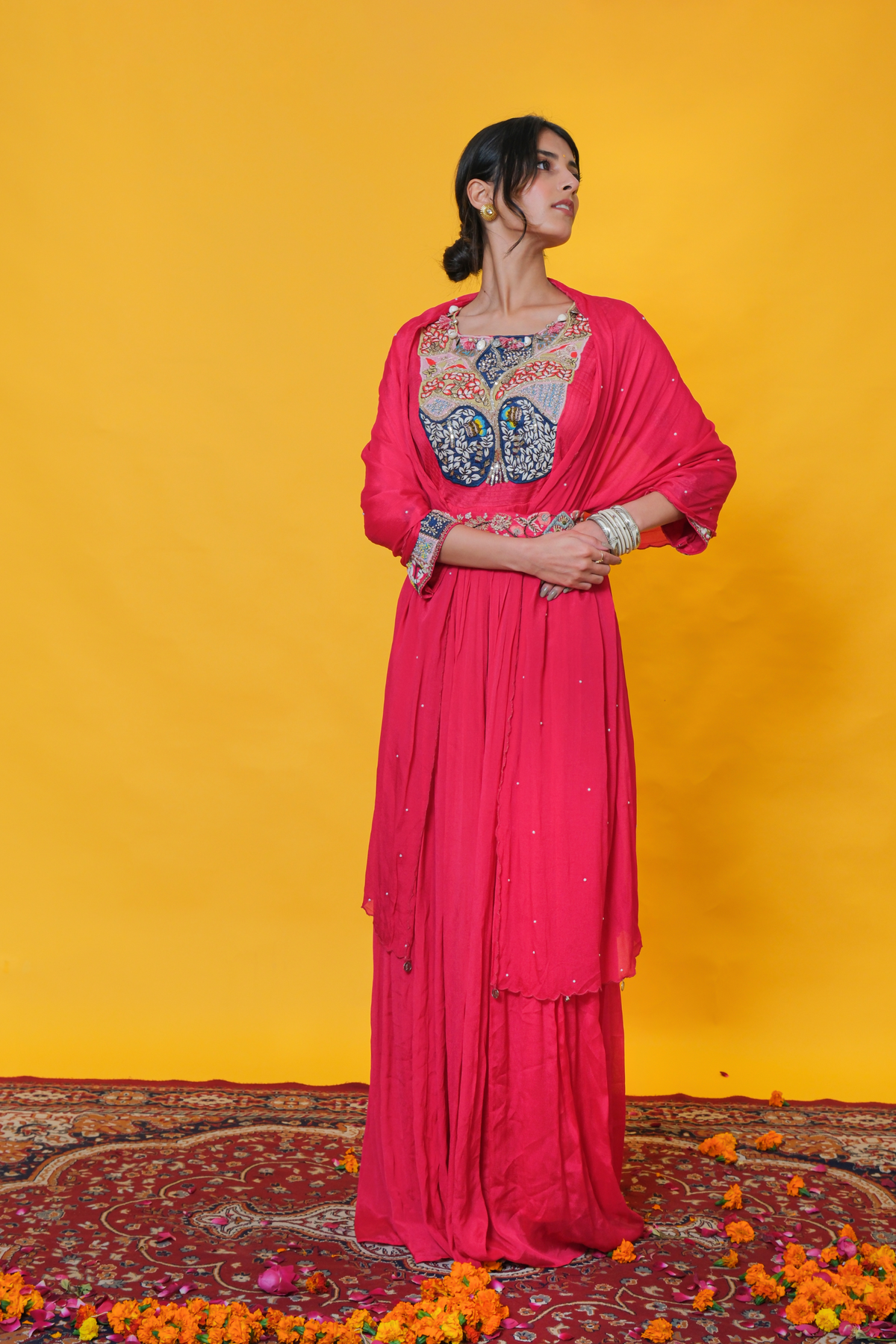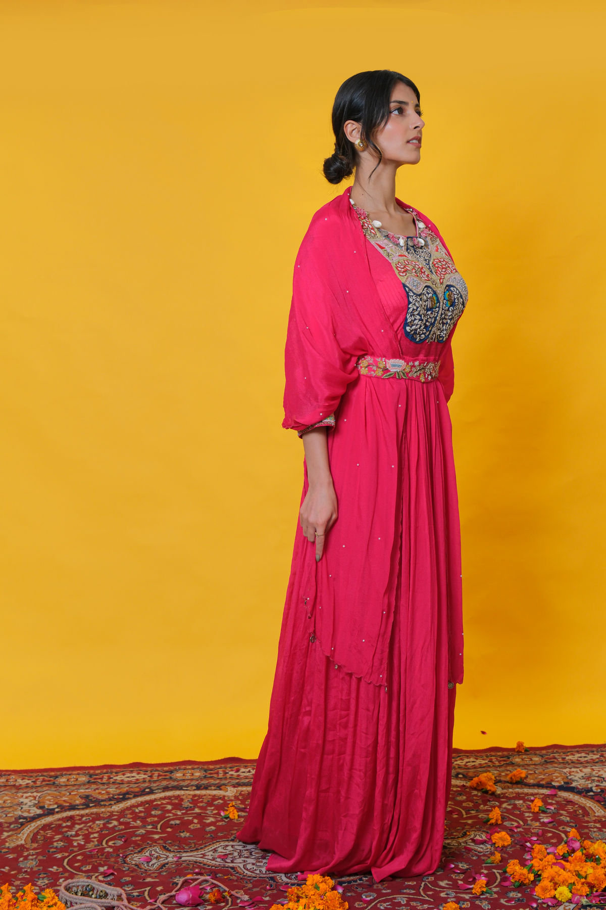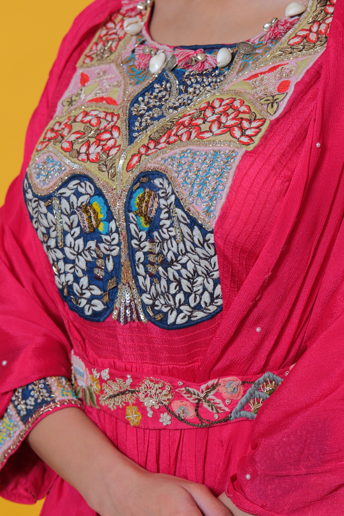 Command attention in hot pink! This kodi work dress with a matching dupatta and stylish belt with handwork of pearl ,aari, sequin, cutdana, resham which defines elegance with a touch of boldness